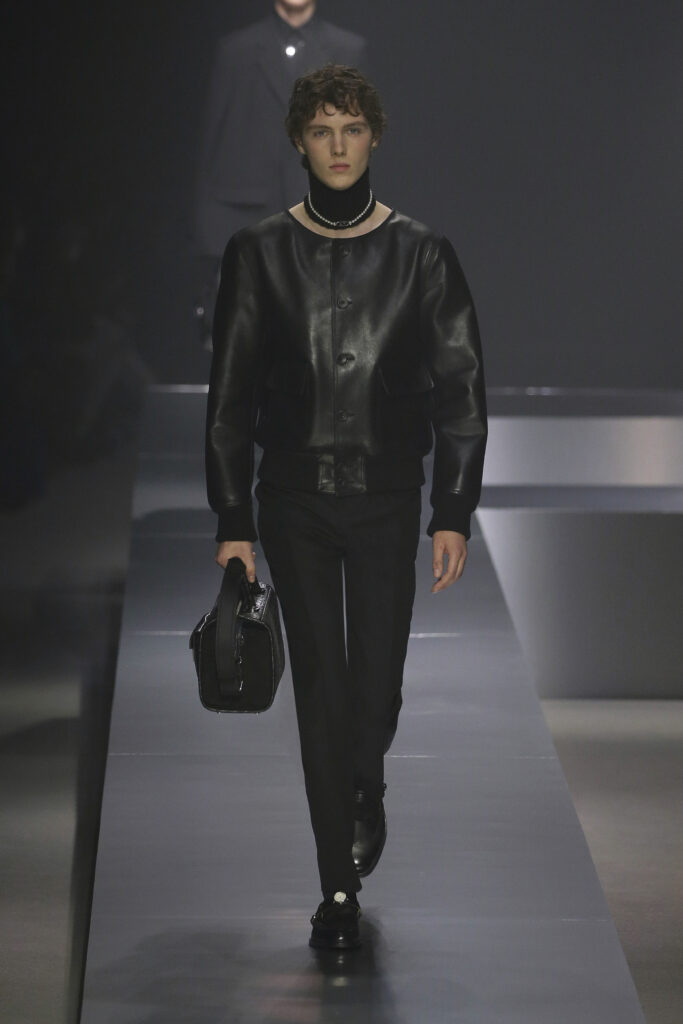 Co-opting the symbols of a bygone male sophistication, the collection is adorned with 30 pearl and diamond digital prints, shearling floral brooches, pearl O’Lock chokers and crystal FF pendants. The strict lines of FENDI tailoring find new softness as modular garments combine suiting, knitwear and leather in unprecedented proportions. Blazers explode into flat capes, scooped jackets and keyhole knits expose the clavicle, and wide trousers sway with a half-skirt in tow. Outerwear assumes couture volumes with dropped shoulders and Dolman sleeves, sharp lapels and covered buttons – exploring FENDI craftsmanship in etched O’Lock shearling, complex intarsia shearling, and smooth leather trims.
