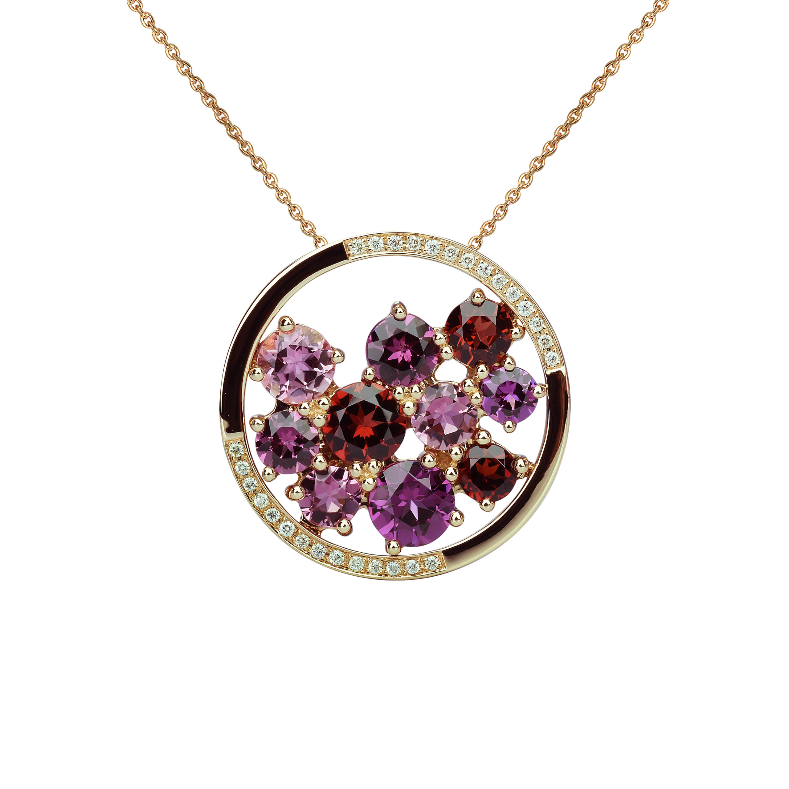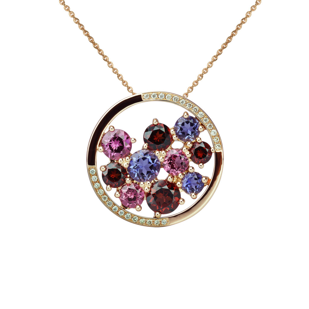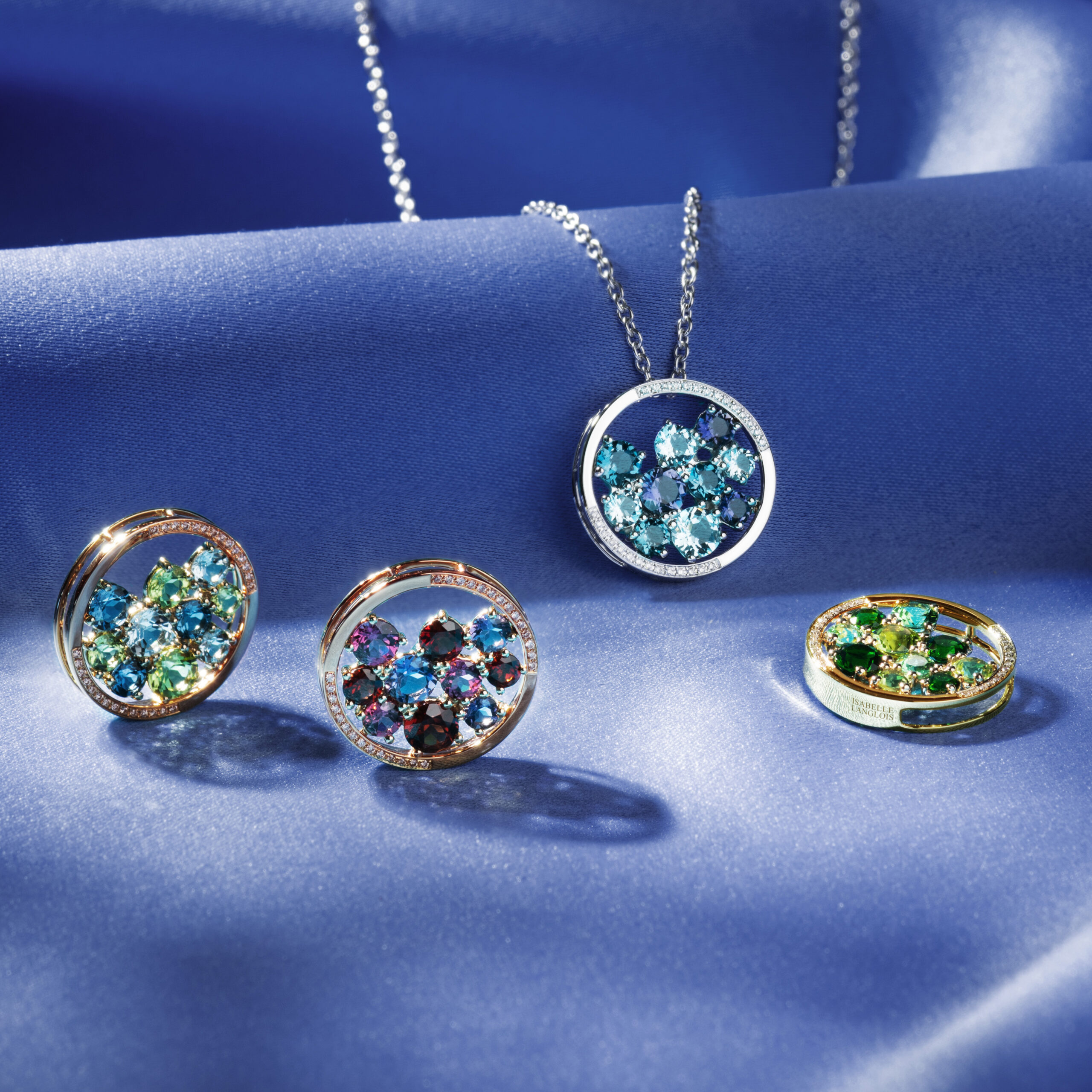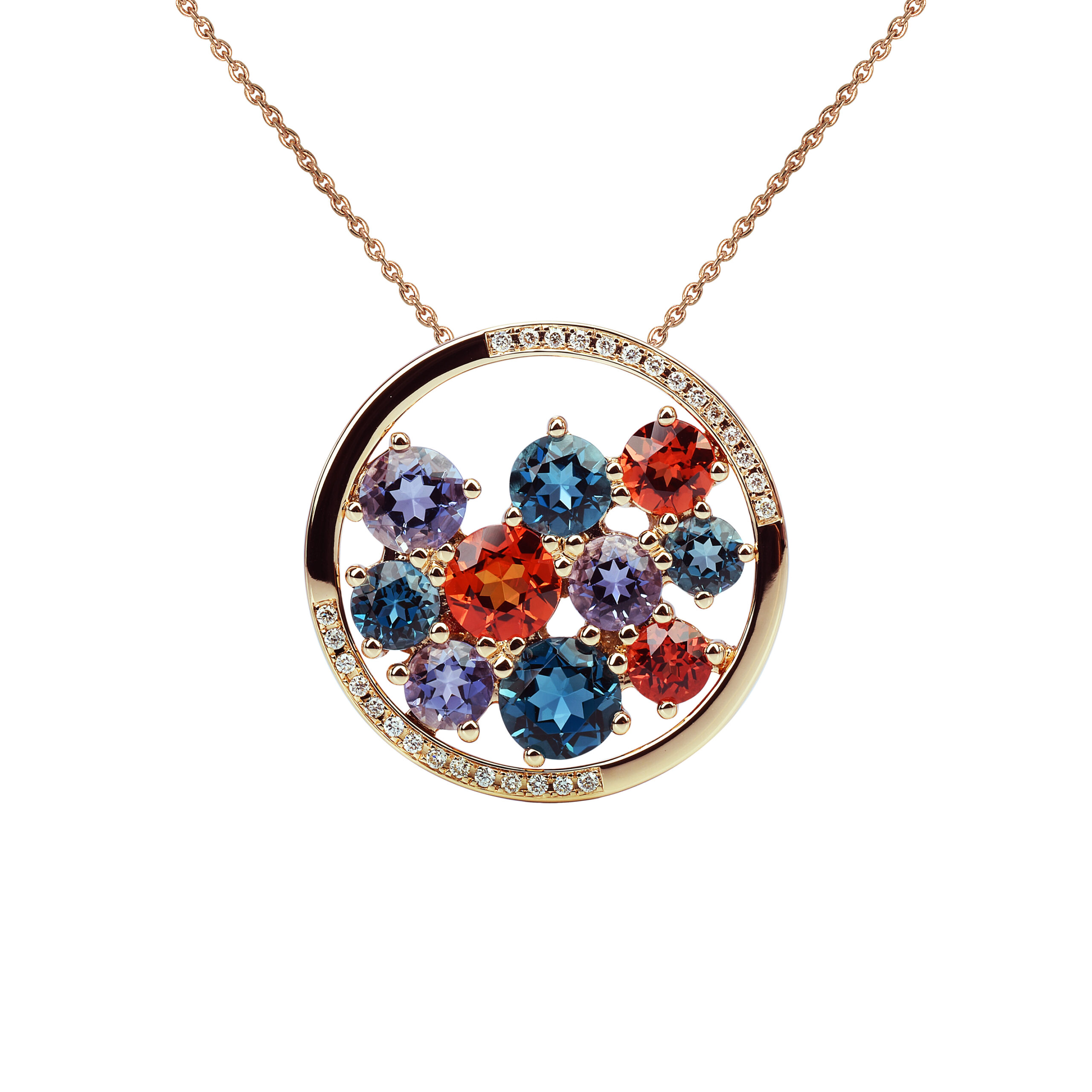 Subtilement ajouré pour y glisser une chaîne en toute discrétion, un cercle d’or irradie de lumière par la présence de diamants délicatement sertis de chaque côté. Lovées à l’intérieur, les pierres de couleur semblent tenir en suspension comme par enchantement. Révélant un savoir-faire traditionnel de la joaillerie française, l’ensemble est décliné dans un large éventail chromatique pour laisser le plaisir du choix. Se portant seul ou à plusieurs au gré des envies, ce pendentif scintille assurément de joie de vivre et de féminité.
