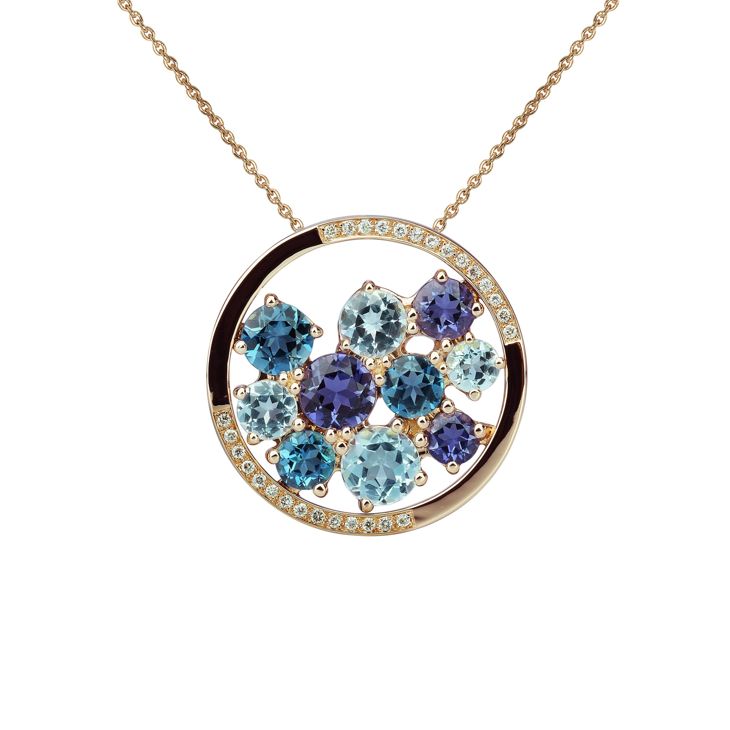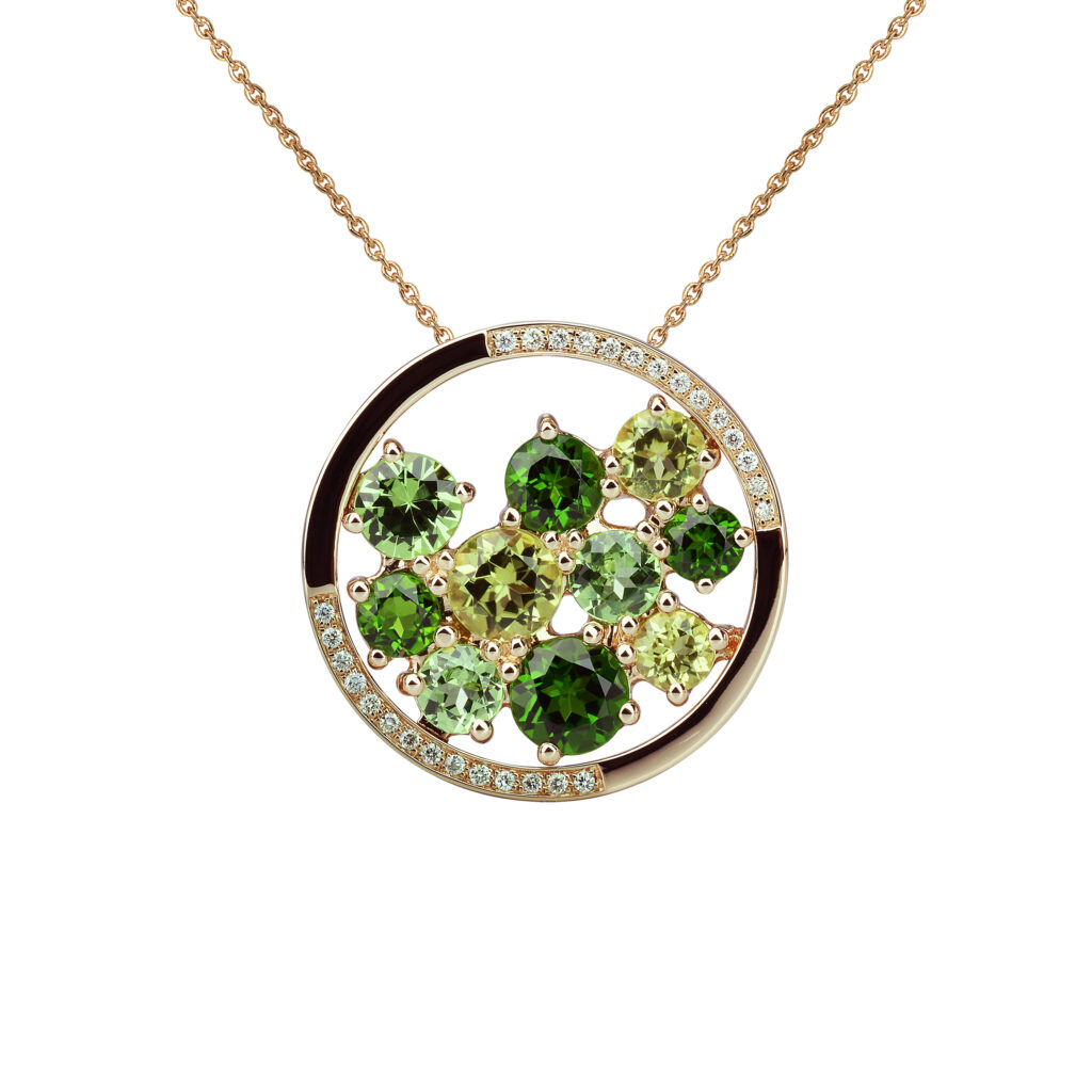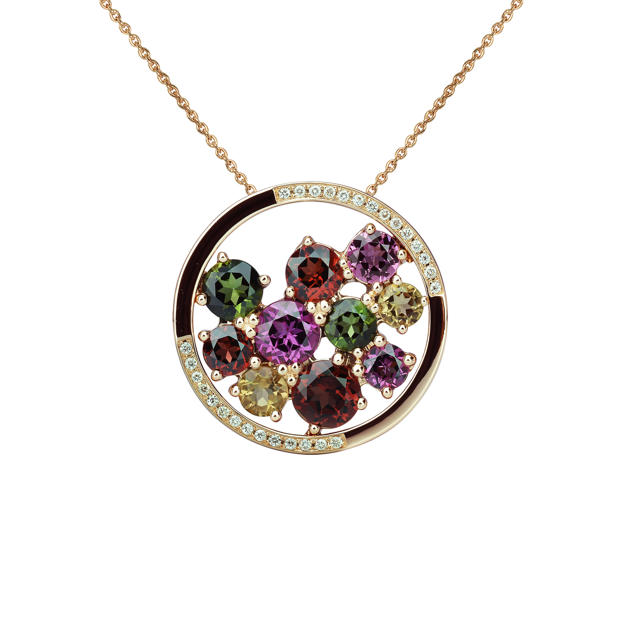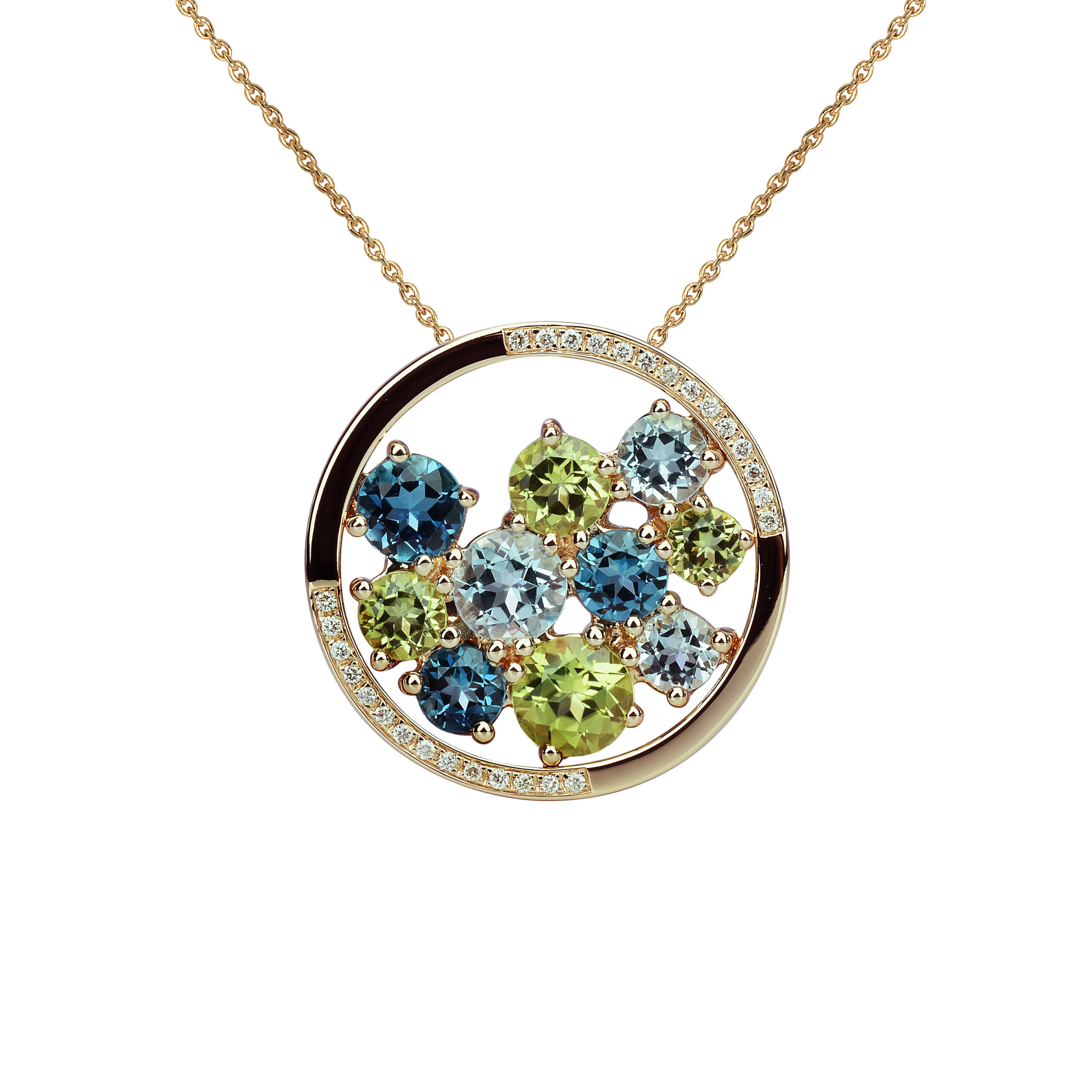 Subtilement ajouré pour y glisser une chaîne en toute discrétion, un cercle d’or irradie de lumière par la présence de diamants délicatement sertis de chaque côté. Lovées à l’intérieur, les pierres de couleur semblent tenir en suspension comme par enchantement. Révélant un savoir-faire traditionnel de la joaillerie française, l’ensemble est décliné dans un large éventail chromatique pour laisser le plaisir du choix. Se portant seul ou à plusieurs au gré des envies, ce pendentif scintille assurément de joie de vivre et de féminité.