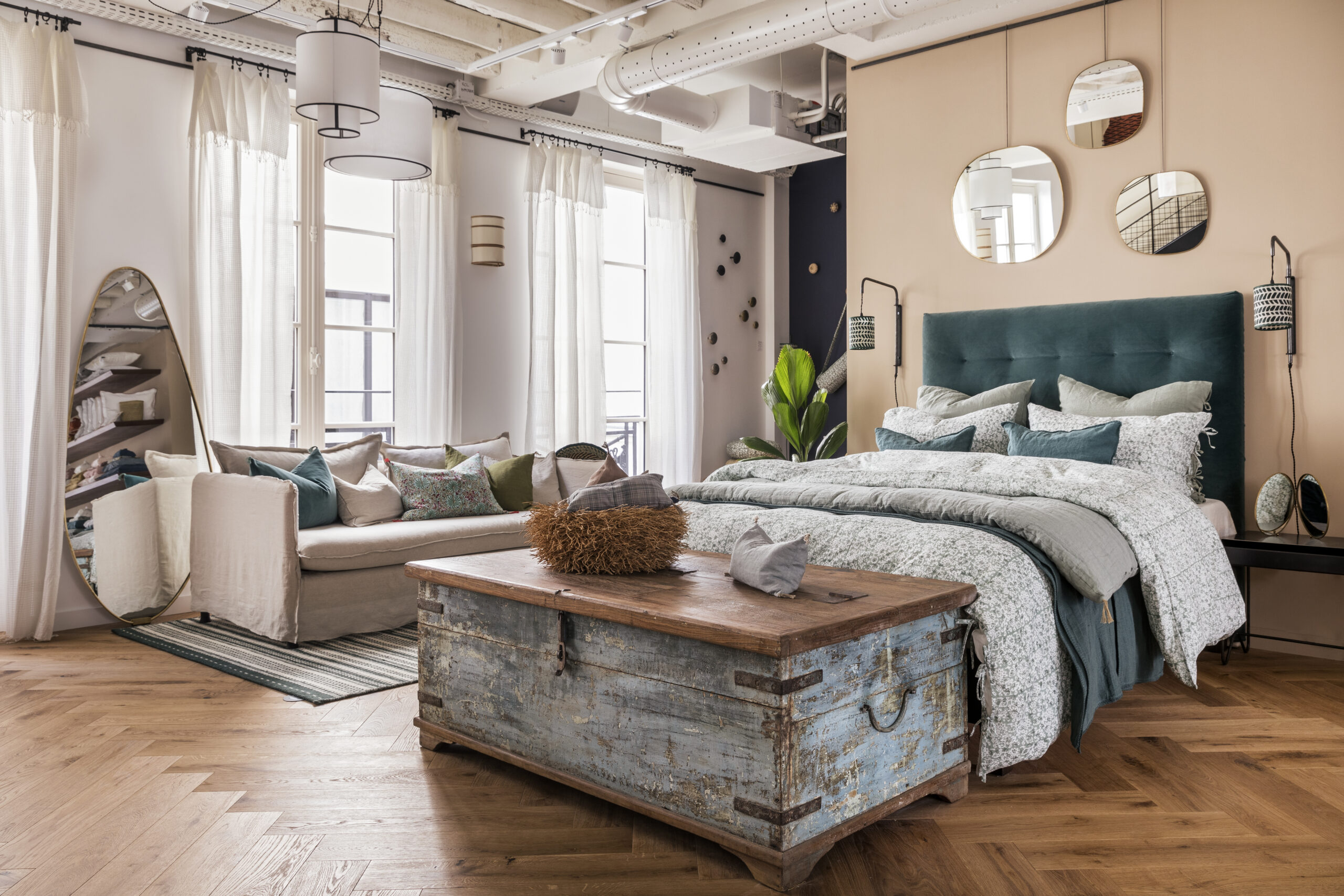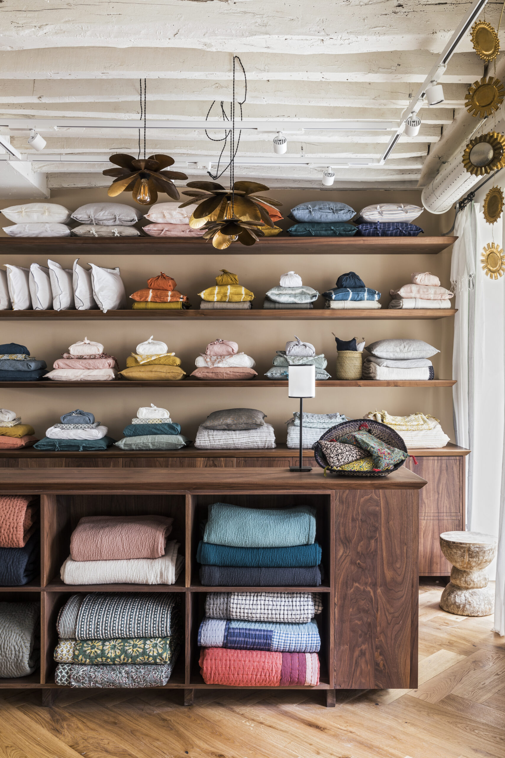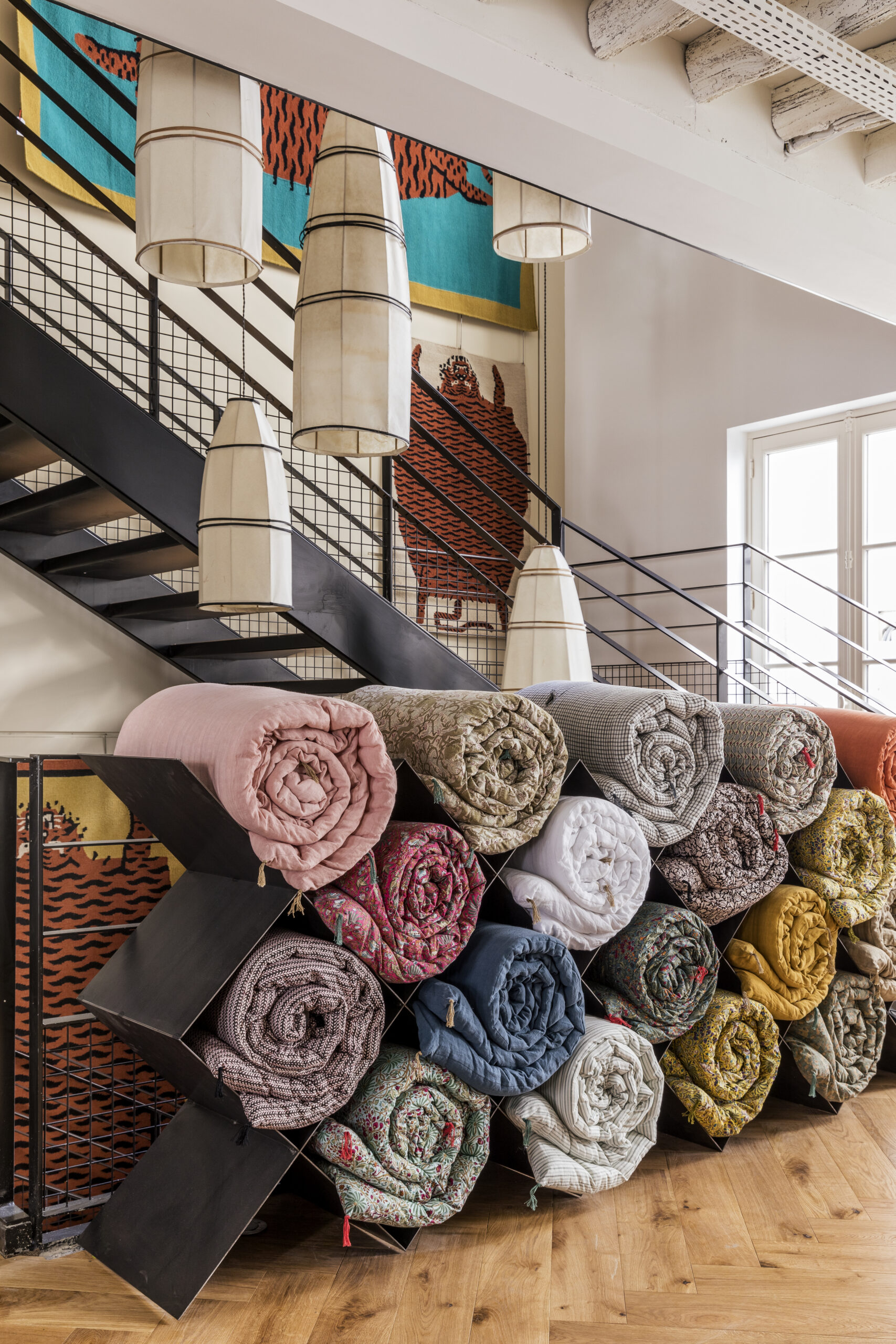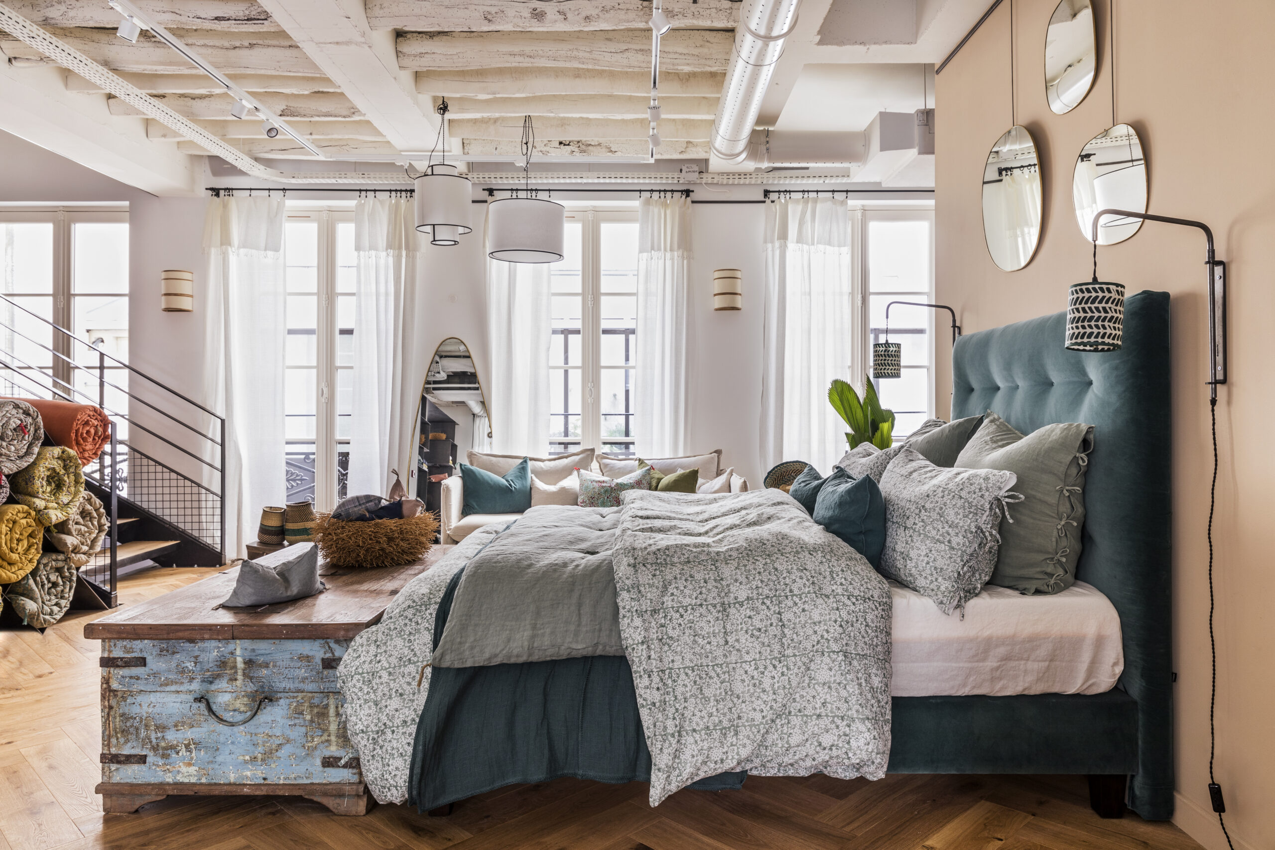 Aux murs, les papiers peints et les peintures, signées Caravane, viennent illuminer un espace bureau, délimiter un salon esprit « cabinet de curiosité » ou sublimer la couleur d’une tête de lit. On découvre, on s’inspire, on se projette et on prend le temps de choisir ses pièces coup de cœur, soigneusement guidé par les équipes Caravane.