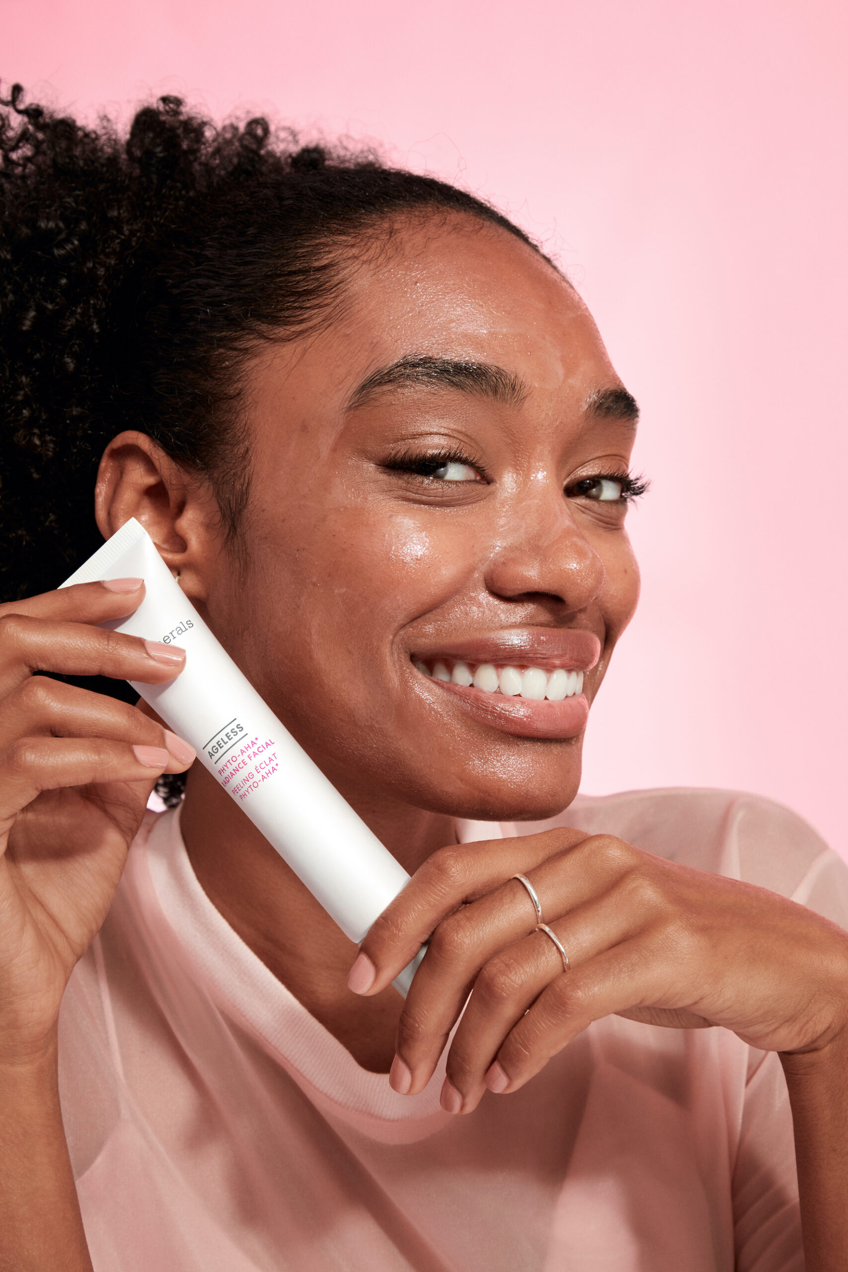 Une peau glowy et radieuse en seulement 15 à 20 minutes est possible avec le nouveau soin AGELESS Phyto-AHA* Radiance Facial. Il est cliniquement prouvé que ce soin peeling-éclat améliore visiblement la qualité de votre peau grâce au Phyto-AHA*, une alternative végétale innovante aussi efficace que les AHA, sans irritation. Il permet d’obtenir une peau plus lumineuse et un teint plus uniforme, tout en réduisant l’apparence des ridules, des tâches et des pores. Le secret de cette super formule ? Le Phyto-AHA*, une enzyme végétale unique dérivée des champignons, qui exfolie en douceur la surface de la peau, améliore son éclat et son tonus sans causer d’irritation ou de lésions cutanées. Formulé sans parfum synthétique, sans gluten et sans ingrédients inutiles, le soin visage éclatant PhytoAHA* d’AGELESS est vegan, testé sous contrôle dermatologique et suffisamment doux pour tous les types de peau, même les plus sensibles. A utiliser jusqu’à 3 fois par semaine pour une peau lisse, jeune et éclatante.