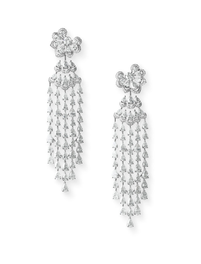 Imposant, un collier de rubellites et de saphirs roses sculpte l’allure en formant un col claudine. Grâce à sa dentelle de pierres roses et ses finitions orfèvres, il revisite avec audace et contemporanéité un classique de la mode. De même, cette paire de boucles d’oreilles totalisant 35 carats de diamants taille poire disposés en de longues pendeloques sublime un port de tête altier et souverain.