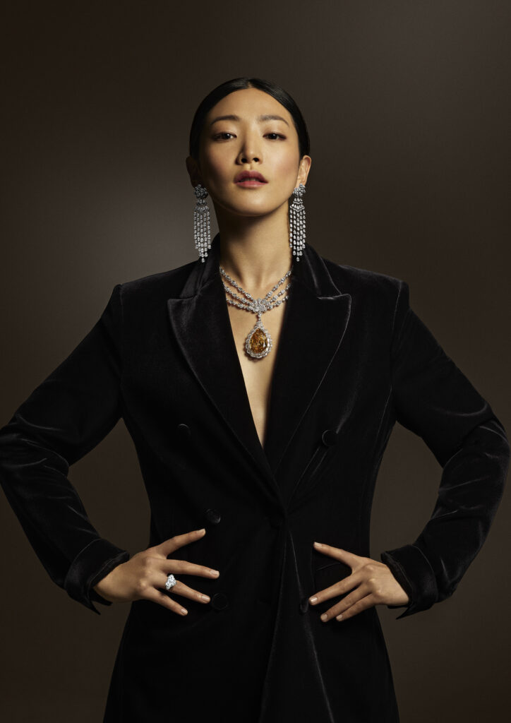 Installée place Vendôme, Chopard présente une sélection de sa Red Carpet Collection avec des colliers, paires de boucles d’oreilles et bracelets façonnés à partir de pierres uniques. Un collier de diamants qui capte le regard avec une pierre centrale de couleur fancy light brownish yellow de 70 carats taillée en poire. Un long sautoir orné d’un pendentif d’inspiration « Peace and Love » qui prend vie avec des fleurs en saphirs, améthystes, tsavorites et grenats.