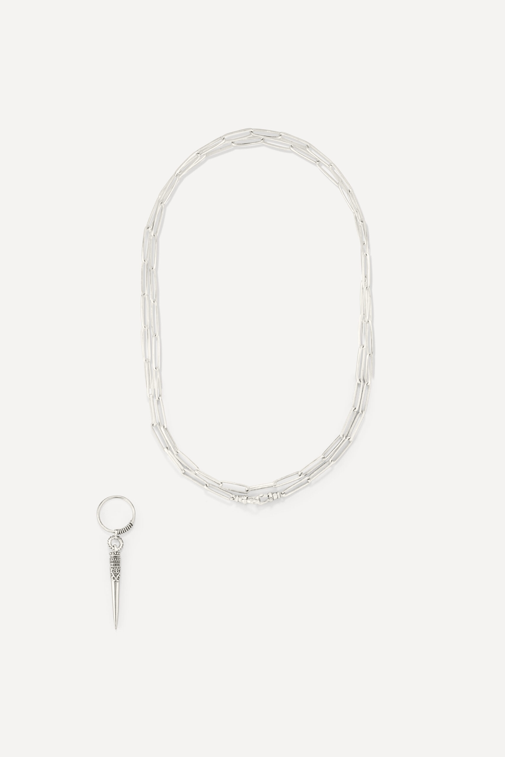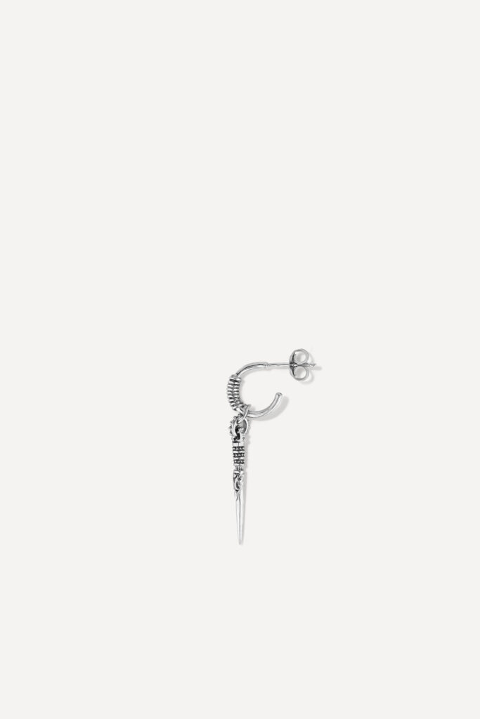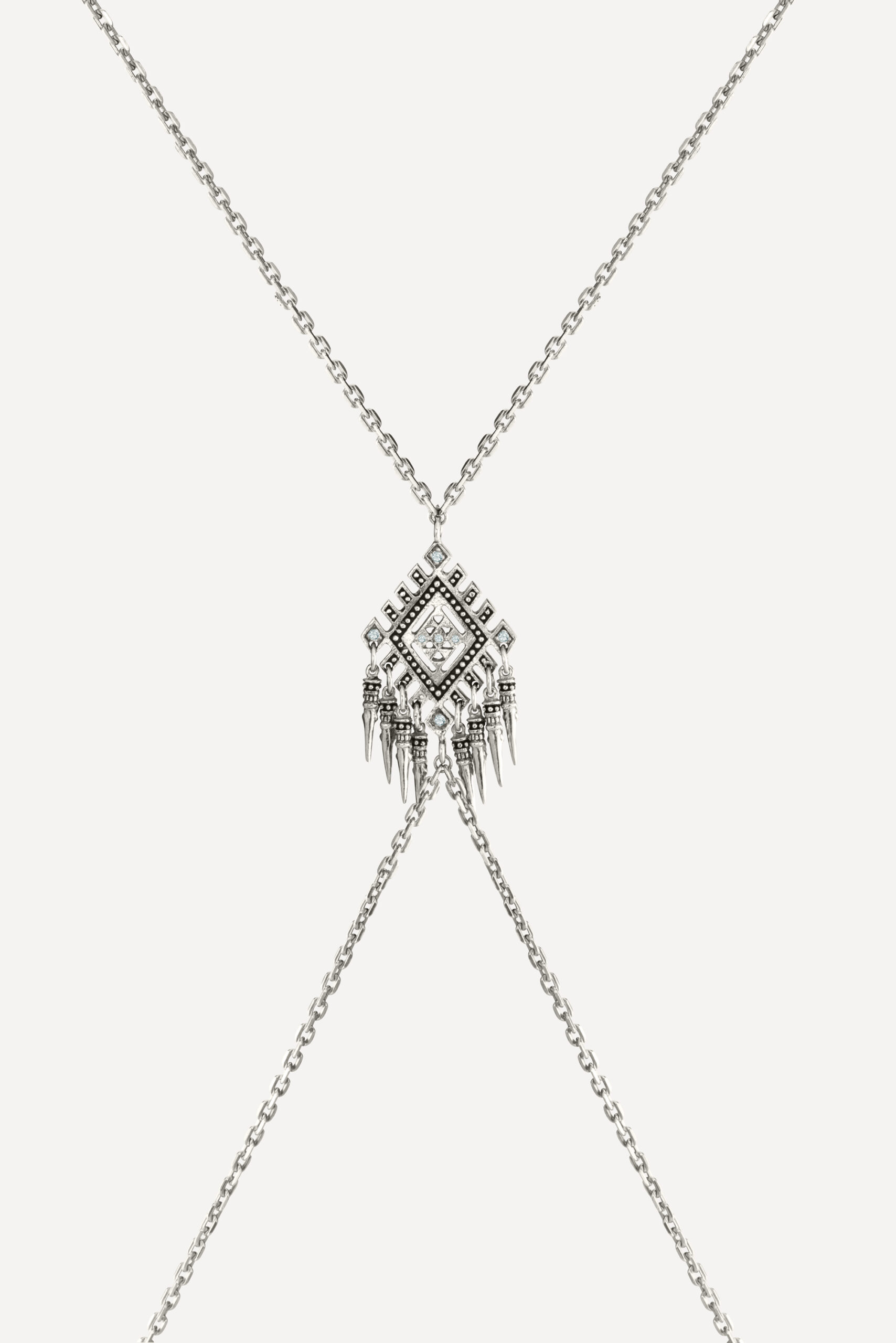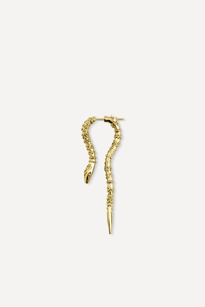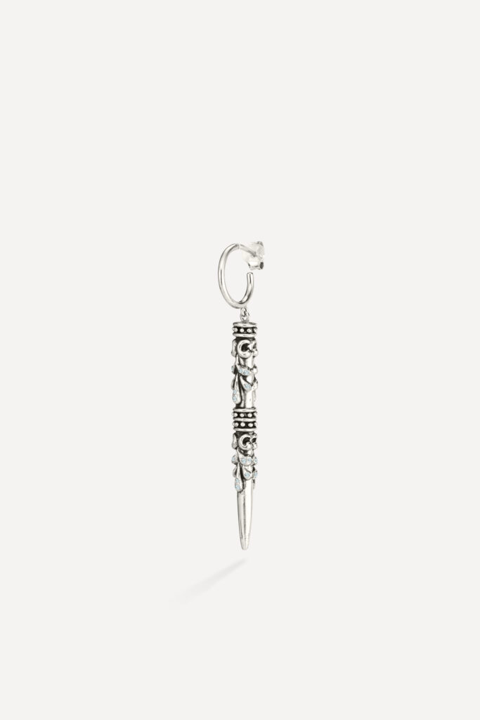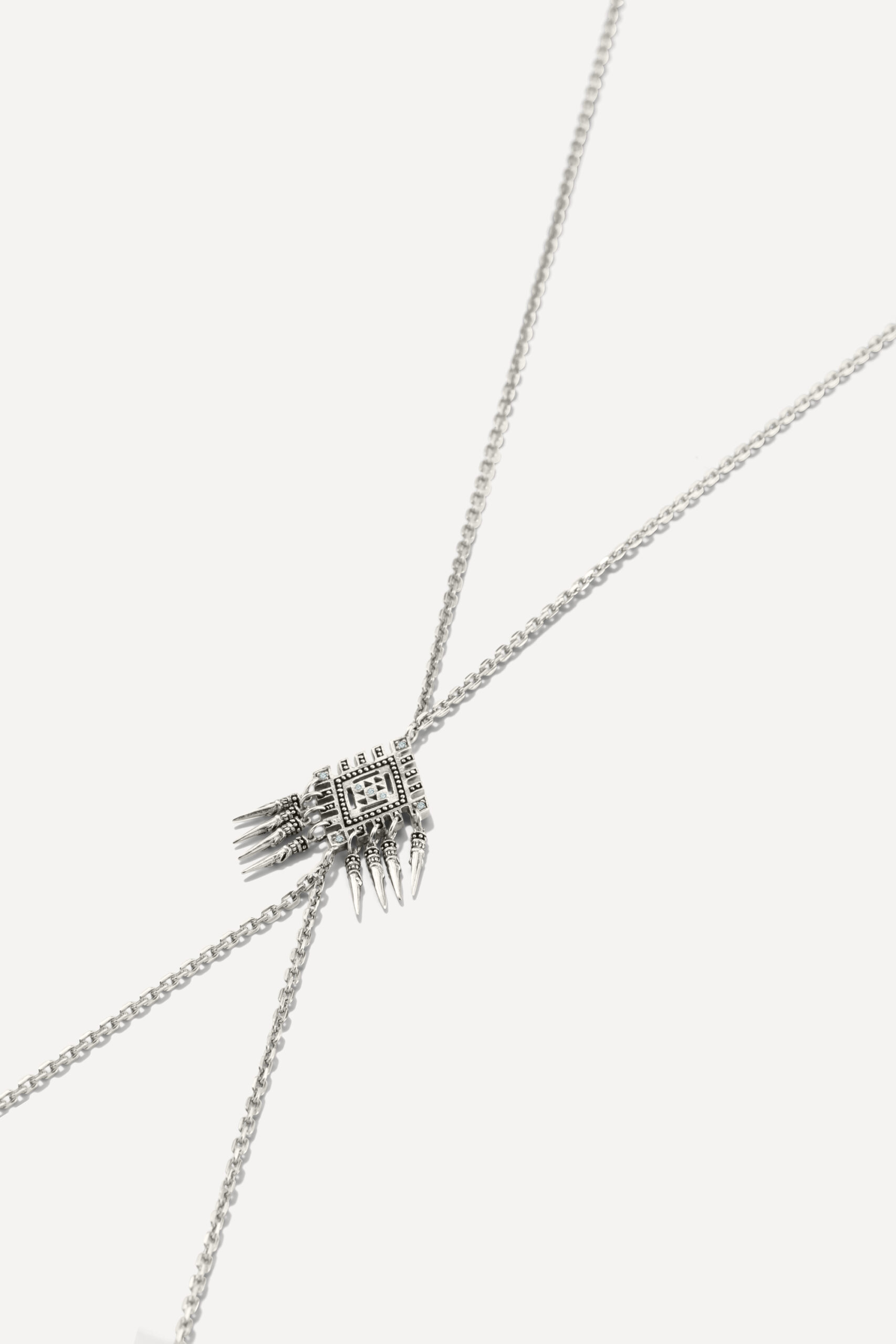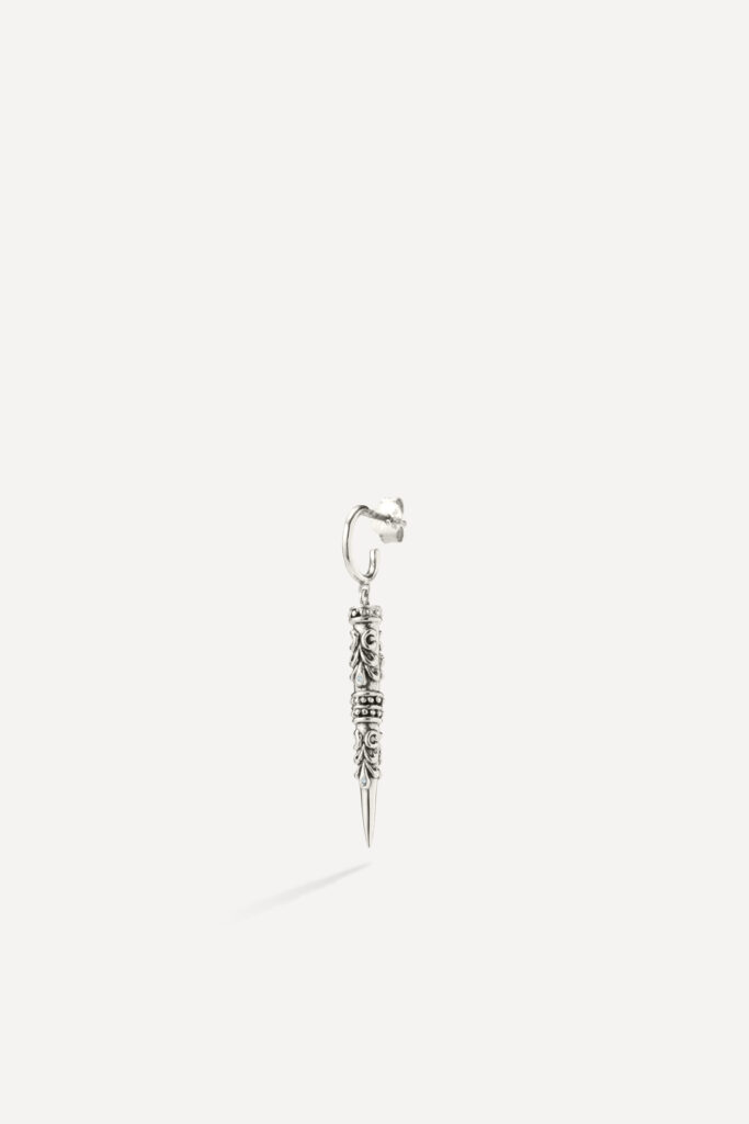 Le périple commence avec la monoboucle Amazonie et la bague Snake, deux pièces qui revisitent le serpent, et pour cause : cet animal symbolique occupe une place à part dans de nombreuses cultures traditionnelles, mais aussi dans l’iconographie du rock. D’autres pièces s’inscrivent à mi-chemin entre ambiance tribale et irrévérence punk, comme la boucle Jiji, une pointe travaillée avec des inclusions de zirconiums, ou le sautoir Savan, qui associe une pique gravée à une chaîne rock à maillons XL.