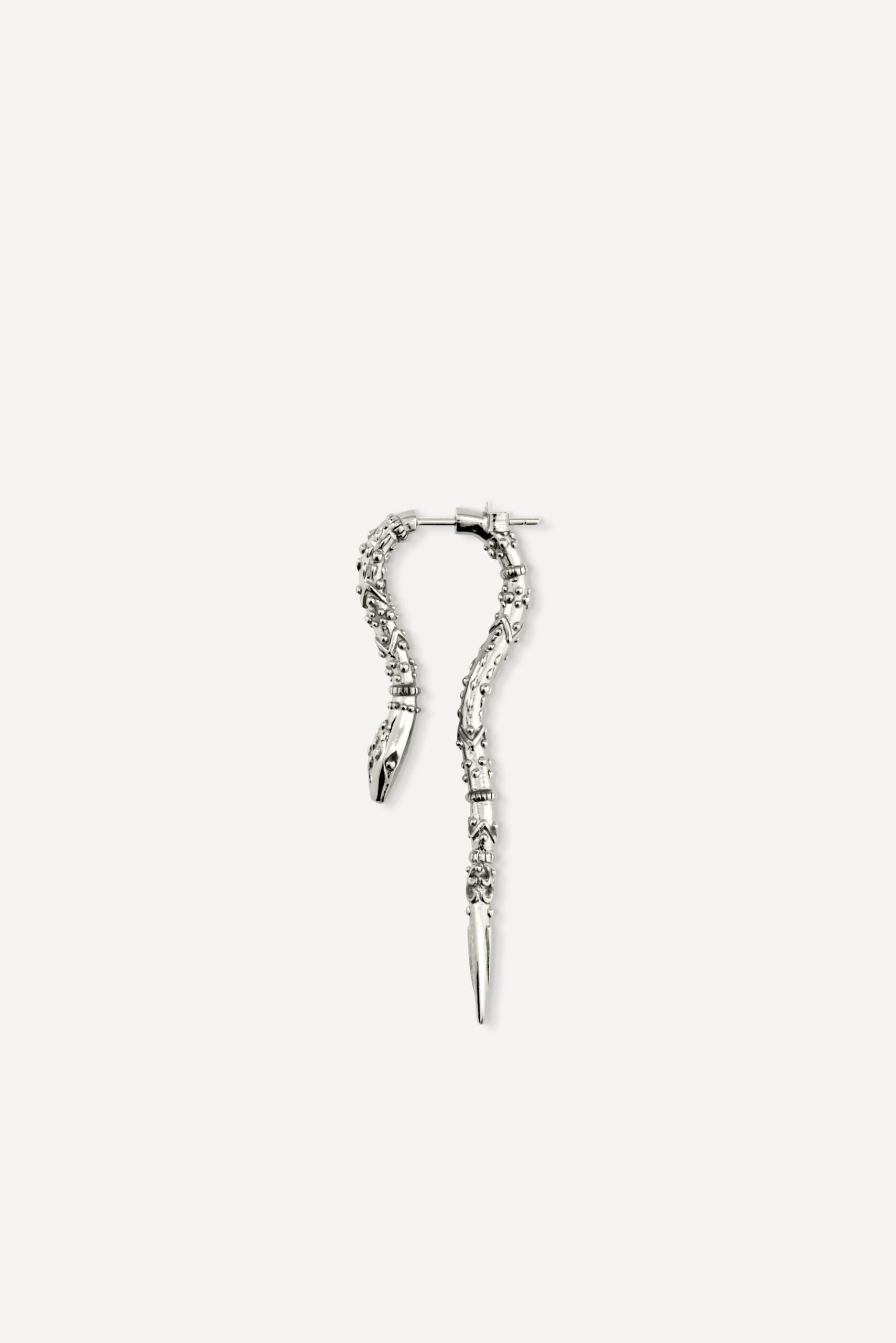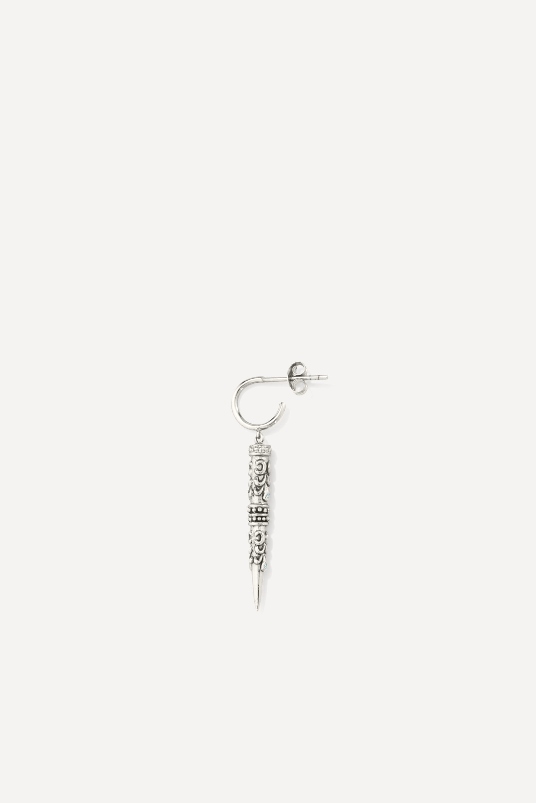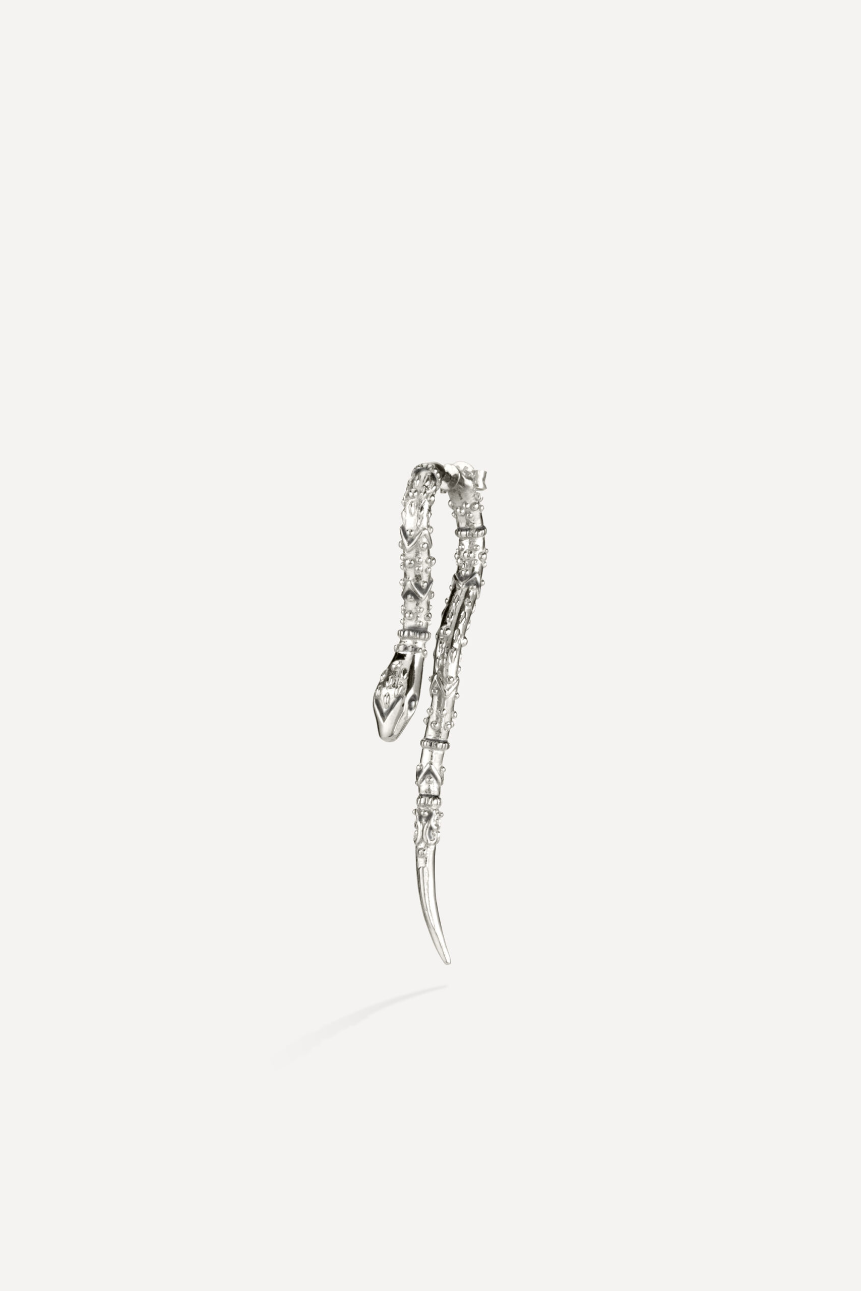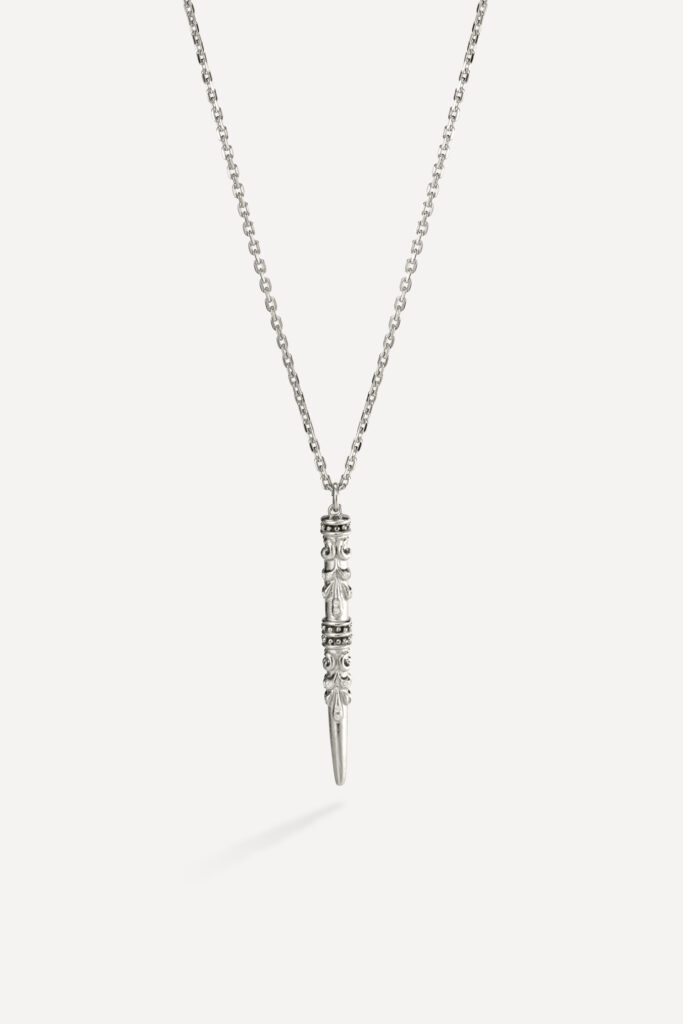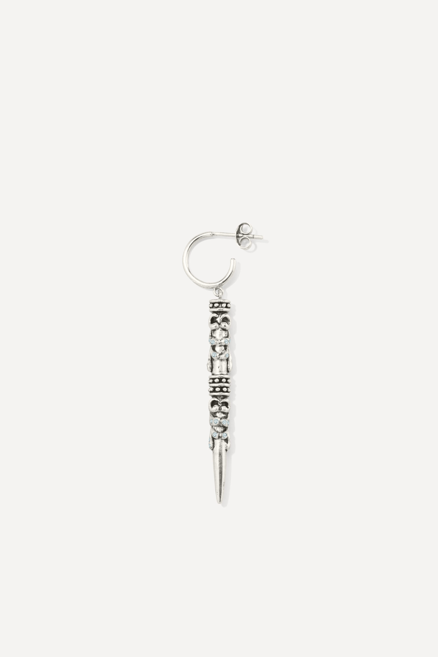 Le périple commence avec la monoboucle Amazonie et la bague Snake, deux pièces qui revisitent le serpent, et pour cause : cet animal symbolique occupe une place à part dans de nombreuses cultures traditionnelles, mais aussi dans l’iconographie du rock. D’autres pièces s’inscrivent à mi-chemin entre ambiance tribale et irrévérence punk, comme la boucle Jiji, une pointe travaillée avec des inclusions de zirconiums, ou le sautoir Savan, qui associe une pique gravée à une chaîne rock à maillons XL.