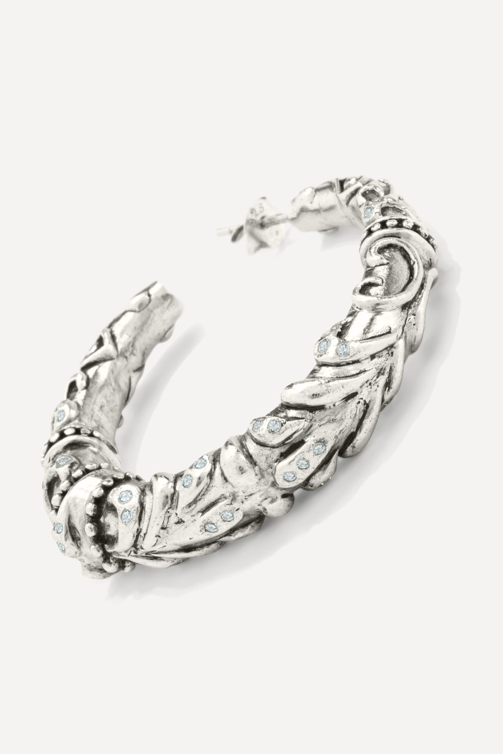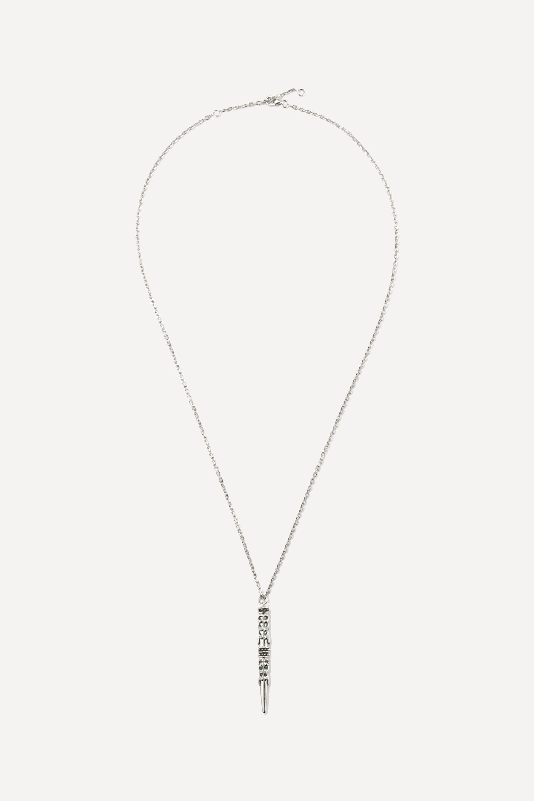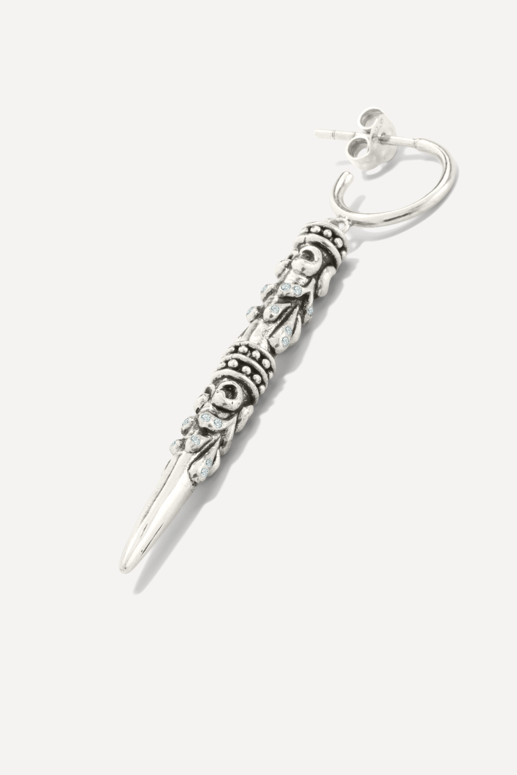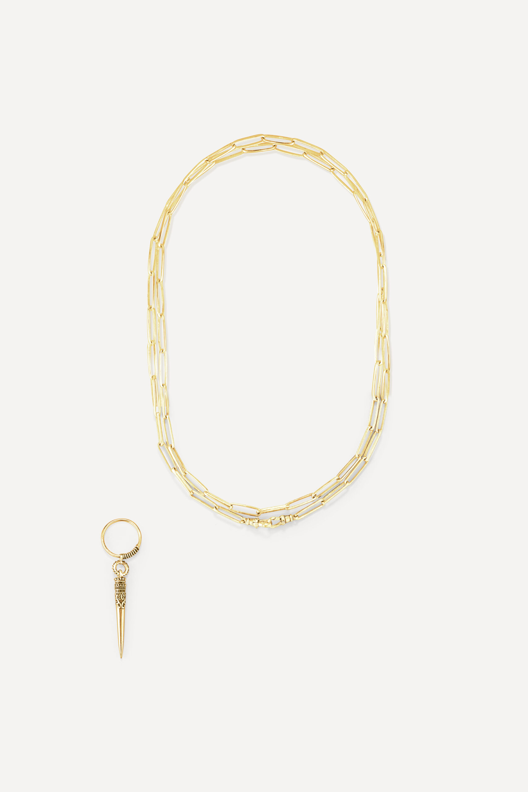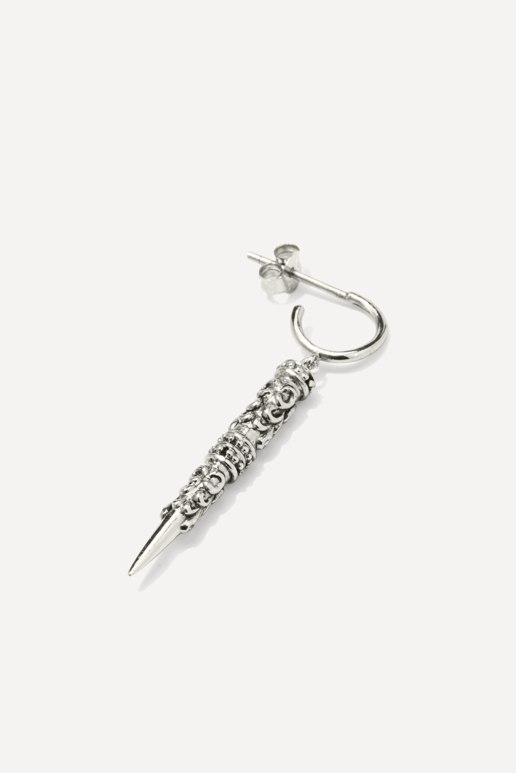 Le périple commence avec la monoboucle Amazonie et la bague Snake, deux pièces qui revisitent le serpent, et pour cause : cet animal symbolique occupe une place à part dans de nombreuses cultures traditionnelles, mais aussi dans l’iconographie du rock. D’autres pièces s’inscrivent à mi-chemin entre ambiance tribale et irrévérence punk, comme la boucle Jiji, une pointe travaillée avec des inclusions de zirconiums, ou le sautoir Savan, qui associe une pique gravée à une chaîne rock à maillons XL.