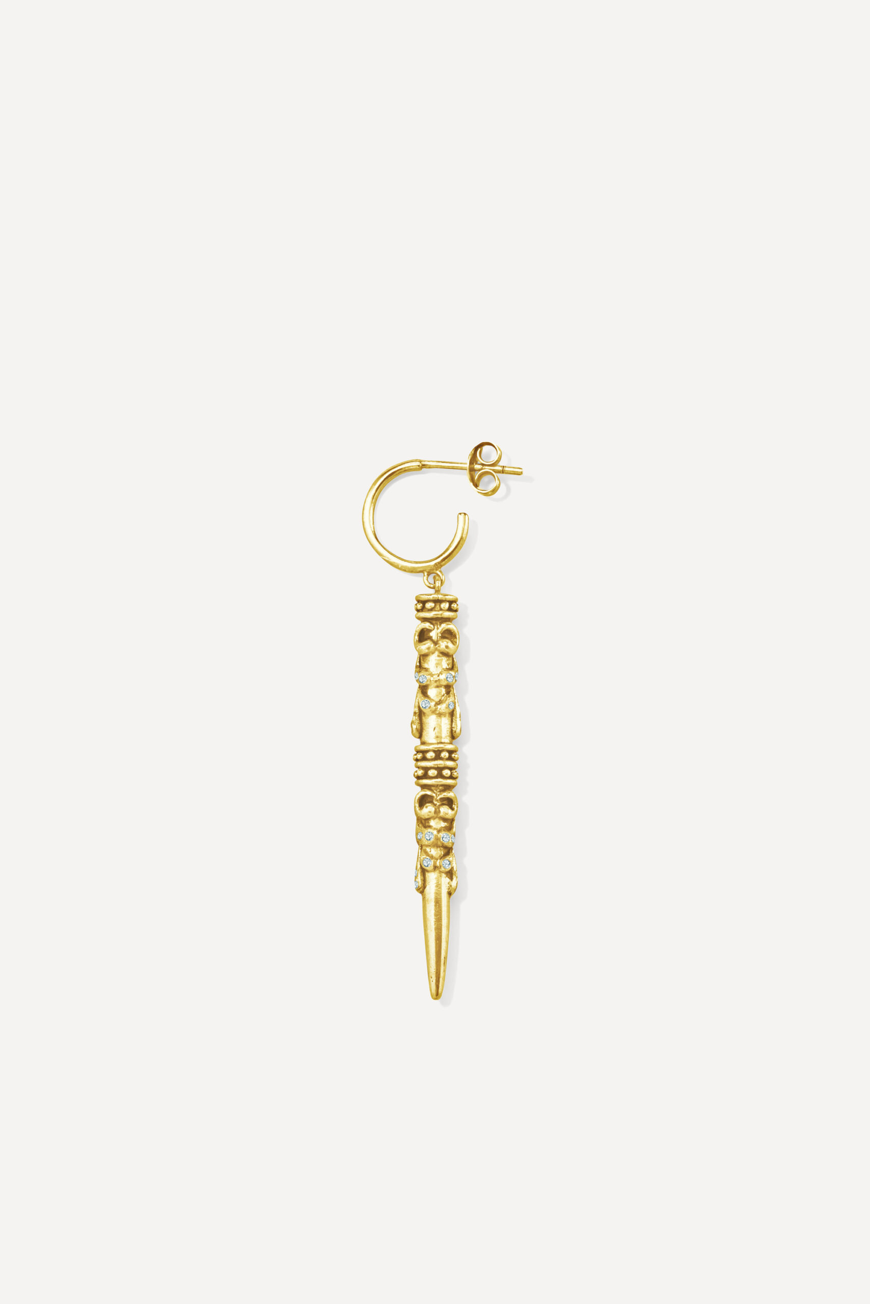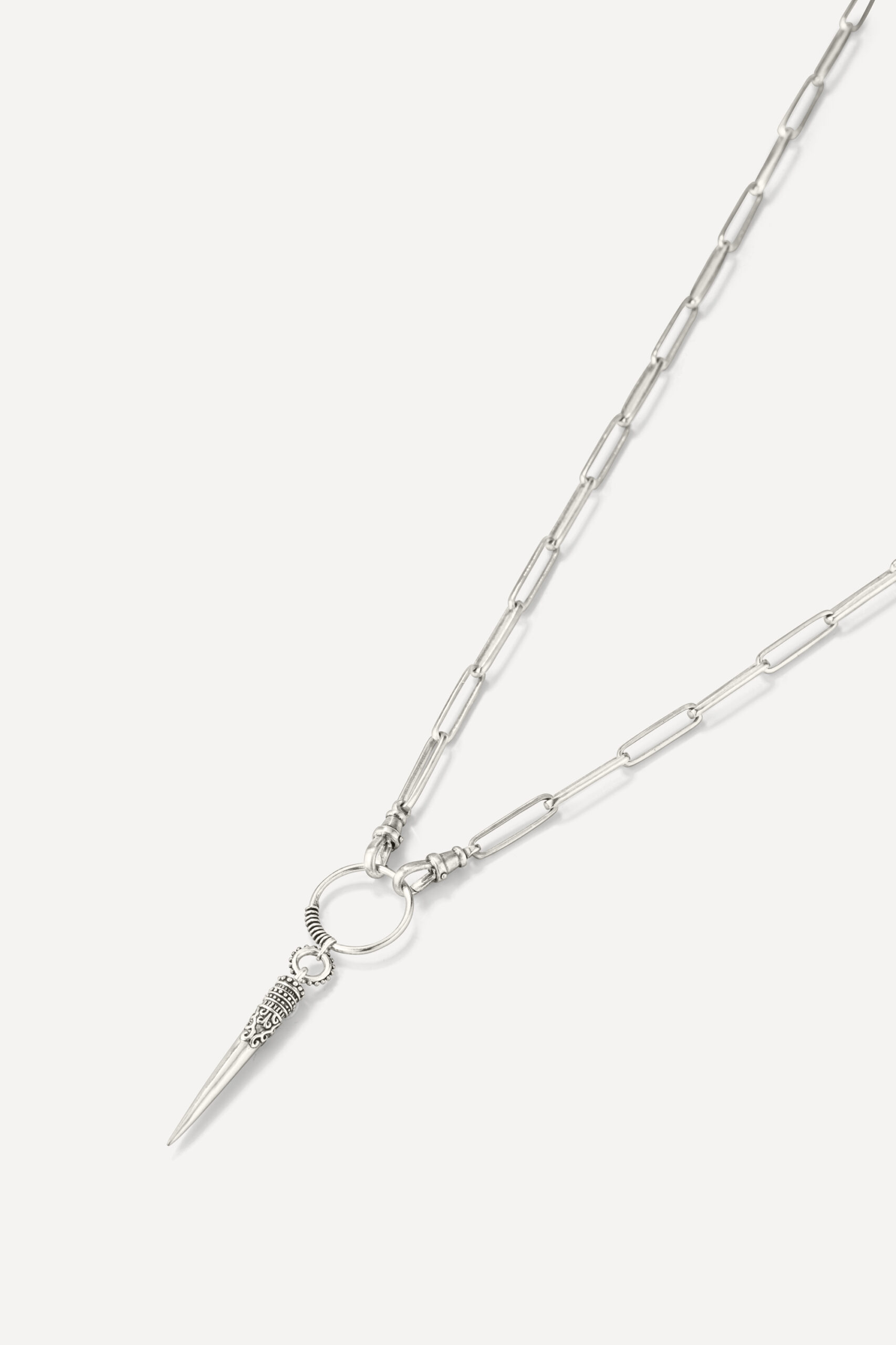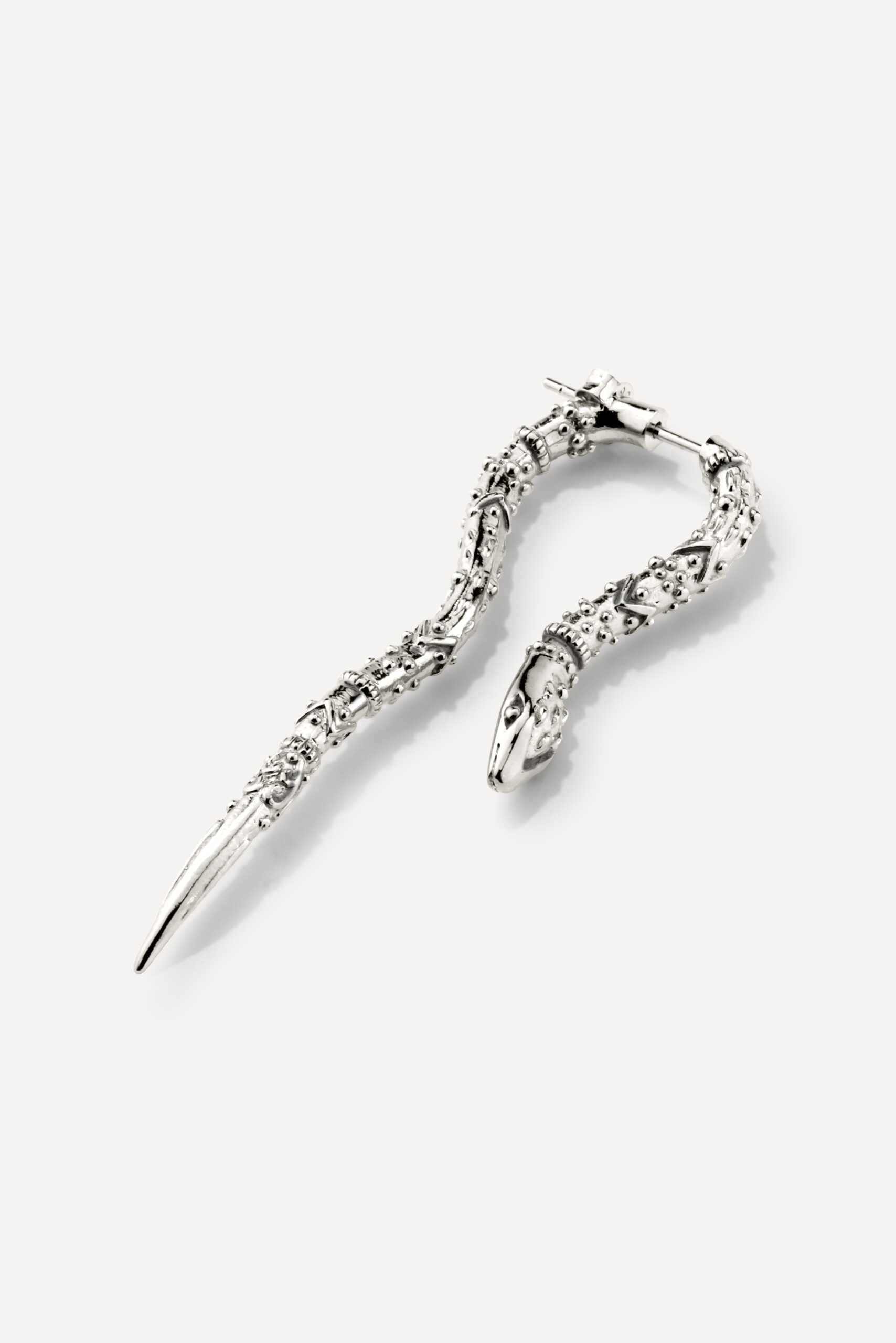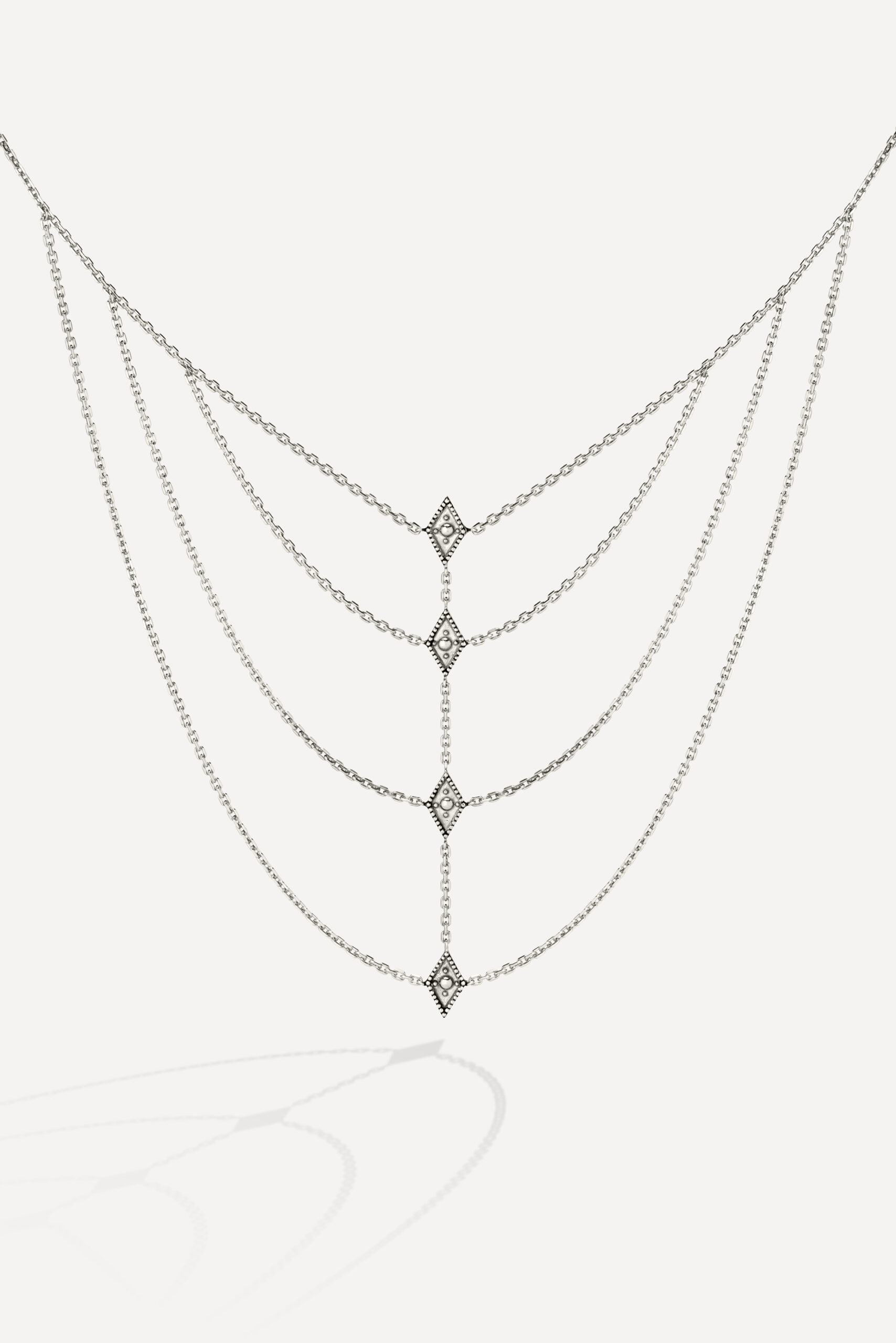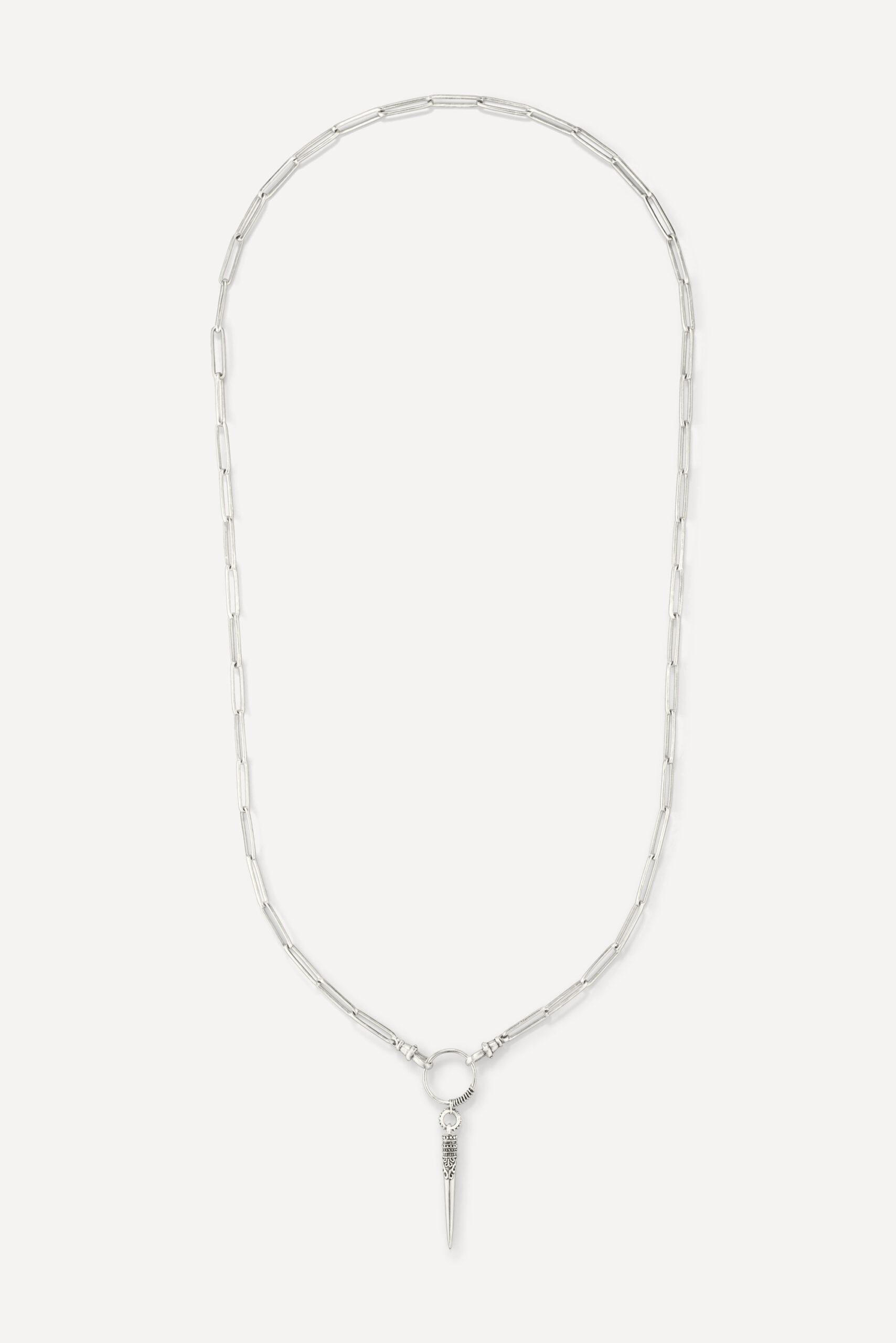 Le périple commence avec la monoboucle Amazonie et la bague Snake, deux pièces qui revisitent le serpent, et pour cause : cet animal symbolique occupe une place à part dans de nombreuses cultures traditionnelles, mais aussi dans l’iconographie du rock. D’autres pièces s’inscrivent à mi-chemin entre ambiance tribale et irrévérence punk, comme la boucle Jiji, une pointe travaillée avec des inclusions de zirconiums, ou le sautoir Savan, qui associe une pique gravée à une chaîne rock à maillons XL.