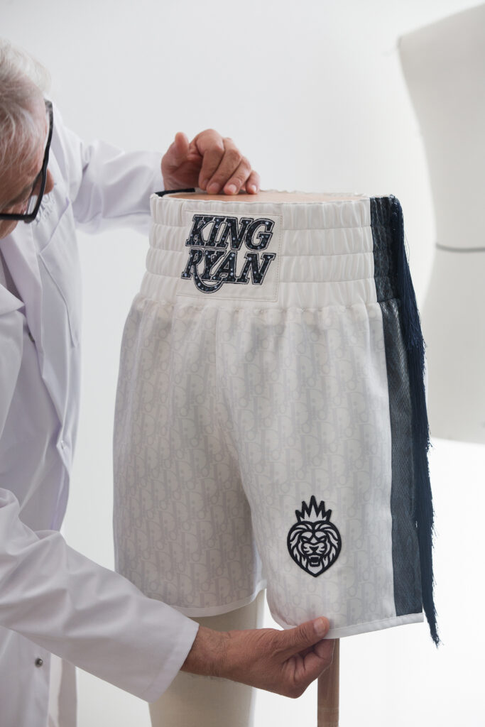 Ryan Garcia won the Super Light weight fight at Crypto.com Arena dressed in Dior men’s collection shorts and robe made of white duchess silk satin distinguished by the classic all-over Dior Oblique pattern with precious blue leather ornamentation embossed with a gauffered python motif embroidered with “Dior” and “King Ryan” logos.