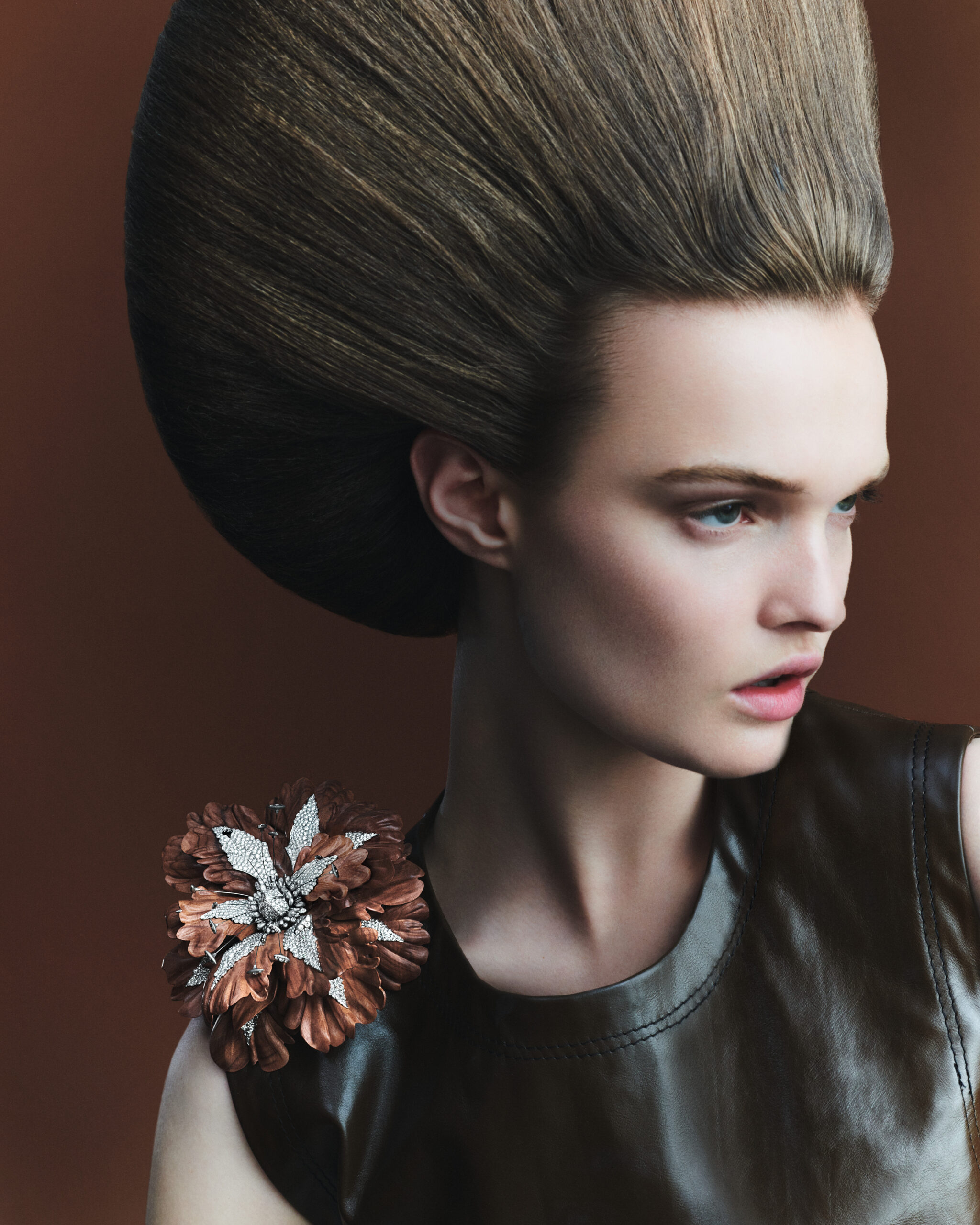 Droite, solide, matricielle, la femme terre est une invitation à plonger dans une géologie primaire célébrant la puissance de la nature. la palette des ocres, des bruns, des argiles s’associe ici à des formes organiques, végétales et animales. A commencer par la broche bois diamant, et sa sculpture d’épaule aimantée. chaque pétale a été scanné puis reproduit en bois de palissandre de santos sur une structure en or ajourée.