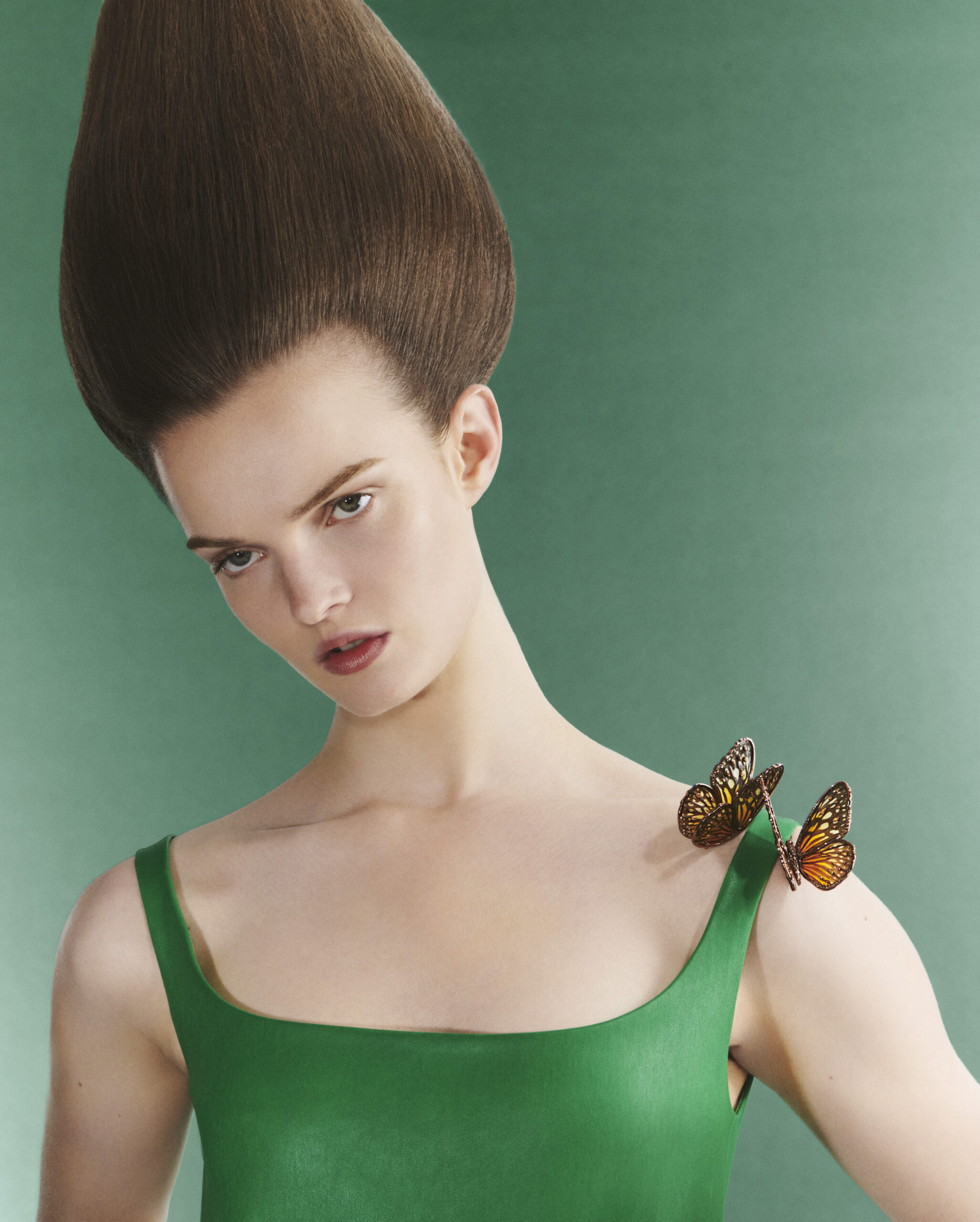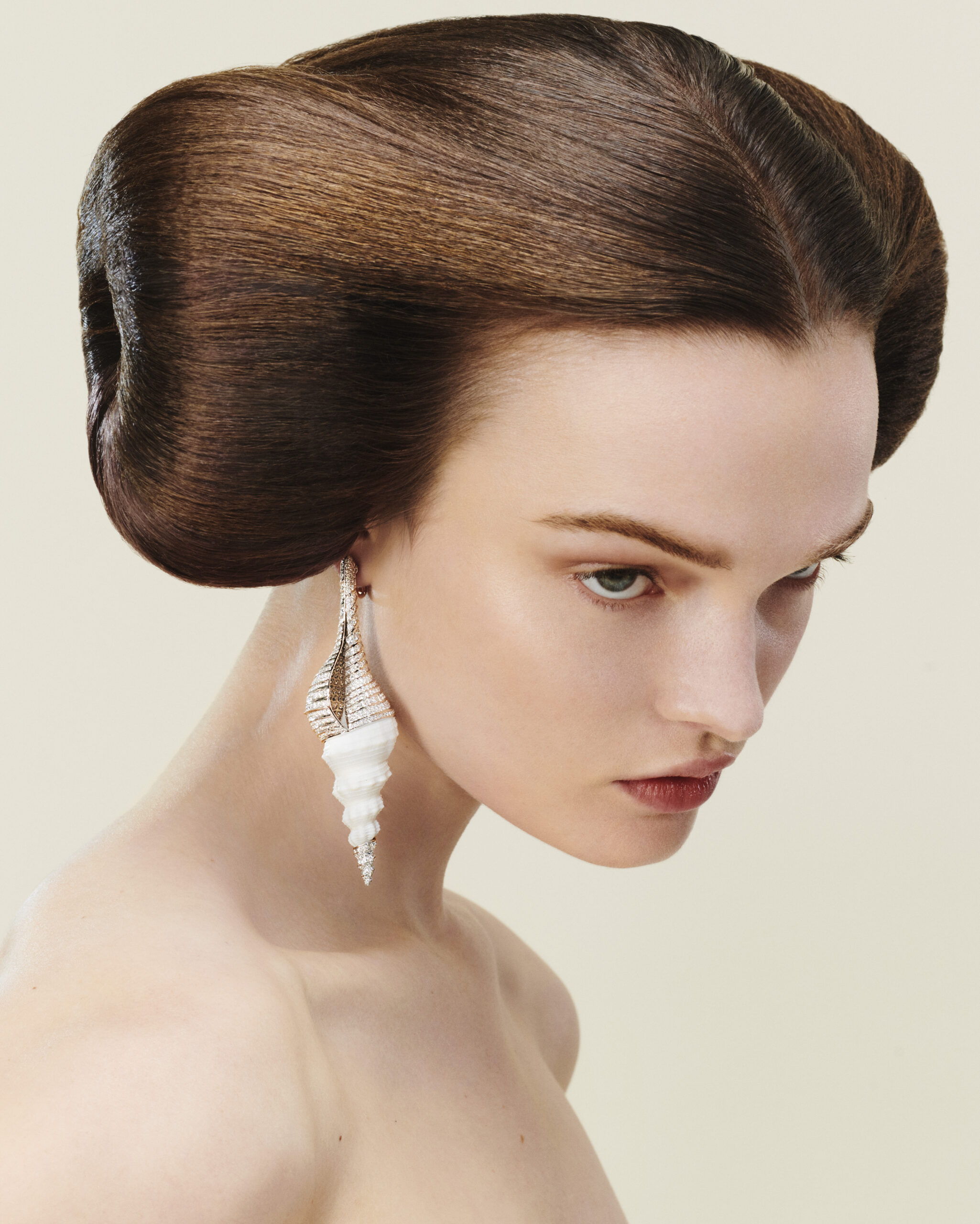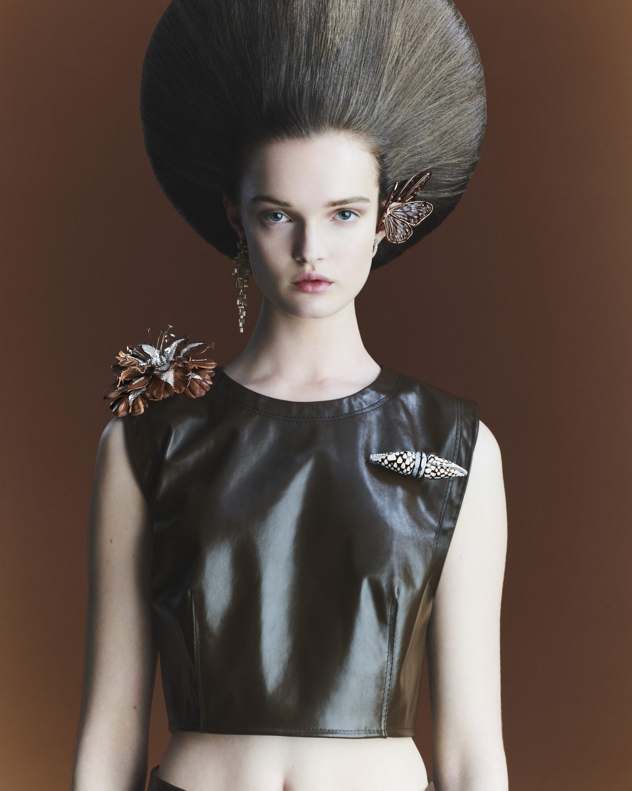 Posée sur l’épaule, les pistils de titane de cette fleur imaginaire entretiennent l’illusion du vrai, alors que sa palette chromatique questionne l’idée même de nature. délicatement disposée sur le haut de l’oreille, la boucle d’oreille papillon diamant vibre au même tempo, entre véritables ailes de coléoptères prêts à s’envoler et diamant poire enserrant le lobe. Plongeant au coeur même des forces telluriques, les boucles d’oreilles cristaux multiplient les effets de cube. A mi-chemin entre design vintage et recherche scientifique sur les cristallisations géométriques, elles sont interprétées ici en or rose et blanc, quartz fumé et diamants. une imposante broche vient reprendre l’emblématique silhouette jack, associant deux coquillages conus marmoreus aux volumes et aux mouchetages parfaitement appairés. Leur beauté fragile est célébrée par une ligne d’or et de diamants qui soulignent leurs contours, tandis que du cristal de roche vient parer leurs extrémités.
