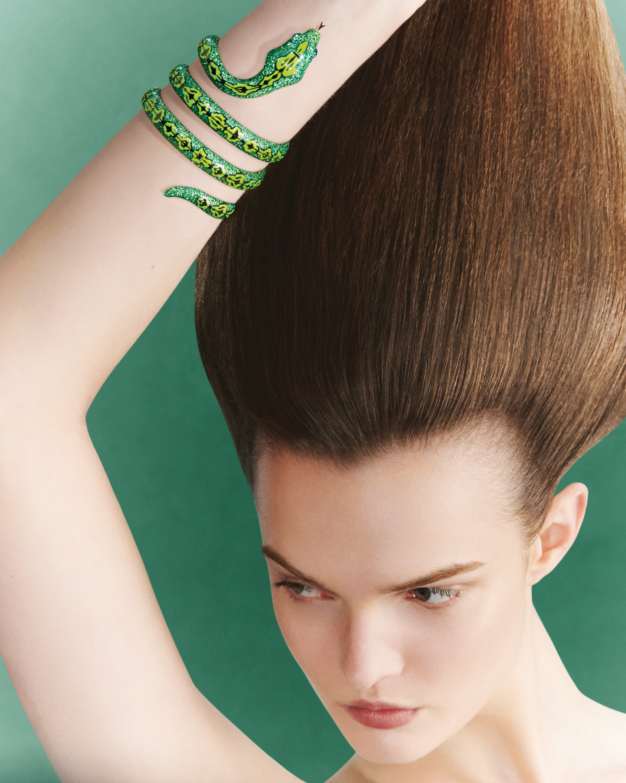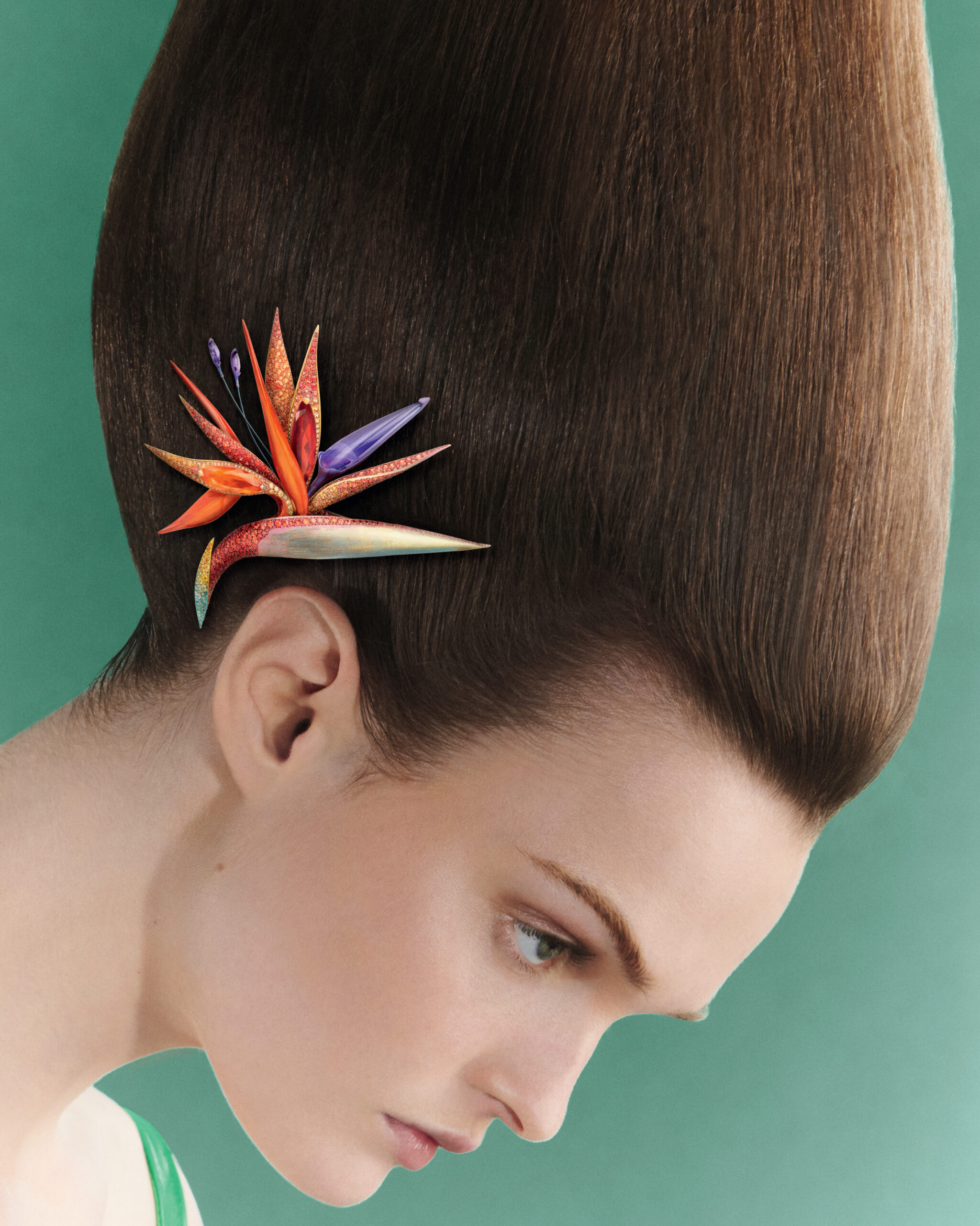 L’effet poids-plume est aussi celui d’une broche, où des ailes de papillons lideopsis vulgaris ont été traitées pour durer dans le temps, puis scannées de manière à concevoir une structure en or reproduisant leur courbes originelles. Le bracelet toucan apporte à son tour un jeu de volumes et de couleurs sans pareil. Son bec puissant est sculpté à partir de trois blocs de citrine qui s’imbriquent parfaitement les uns dans aux autres, créant un dégradé de couleurs. Son regard en onyx et titane bleu, sur fond de spinelles noirs et diamants blancs, contribue à donner au toucan tout son caractère. le bracelet serpent en titane, se pare de tsavorites et de laque brillante aux couleurs vert citron. il multiplie les emmaillements pour une souplesse reptilienne. A ses côtés, une fleur de paradis, portée en broche comme en bijou de tête, reproduit dans le titane l’effet duveteux de cette fleur tropicale.