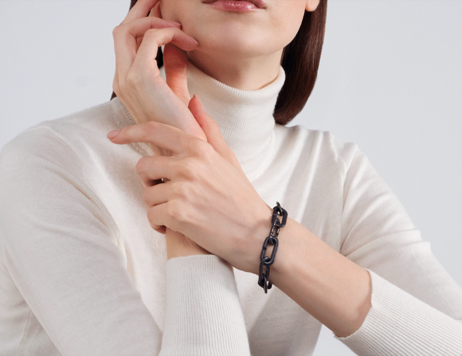 Mon Jeu est la réinterprétation du concept de la chaîne selon Vhernier. Les éléments caractérisés par une fente subtile permettent que des modules s’ajoutent et se combinent entre eux en fonction de son goût et de sa personnalité. La collection s’enrichit désormais de maillons en titane noir mat et maillons en or bruni, recouverts d’un magnifique pavage de diamants noirs.