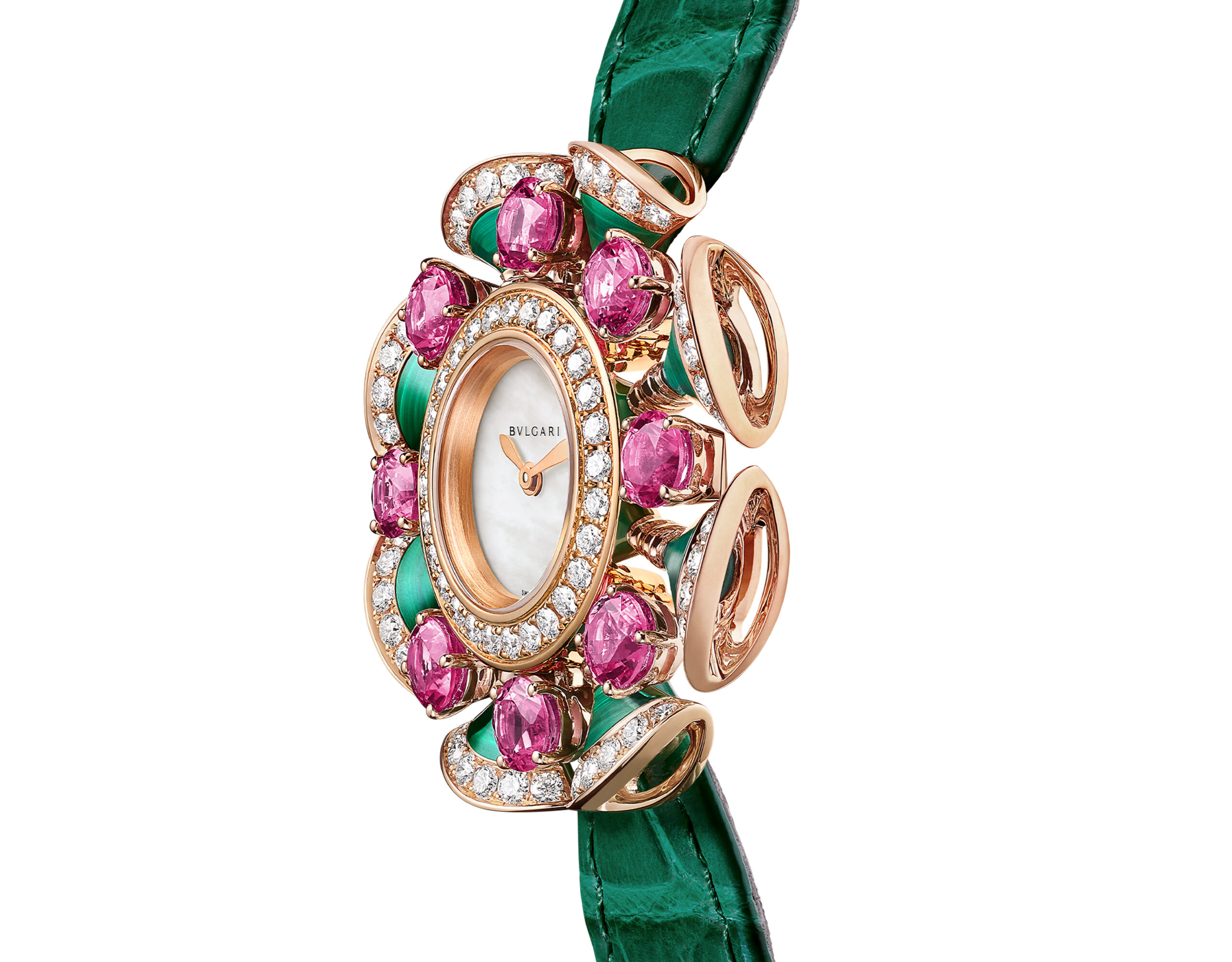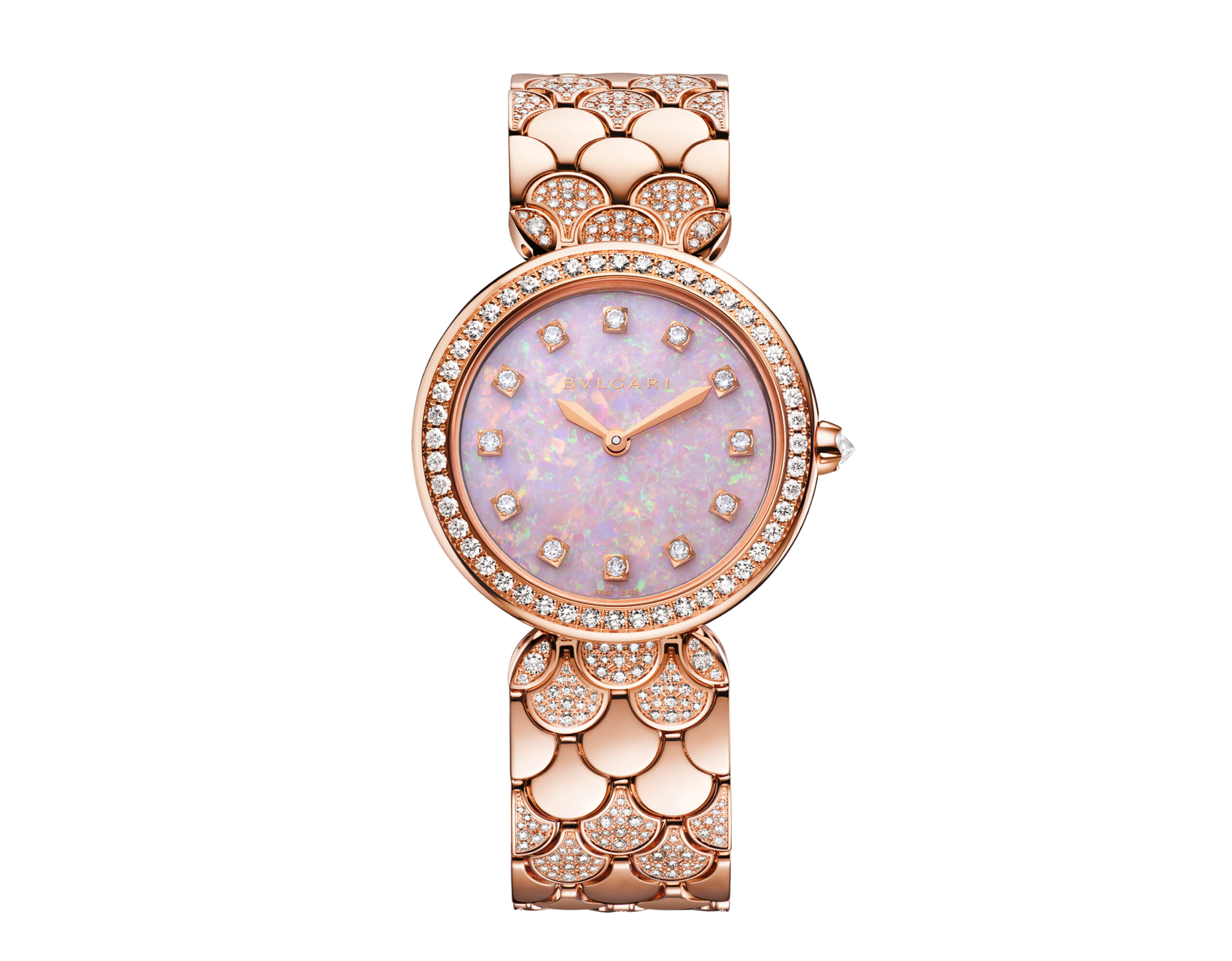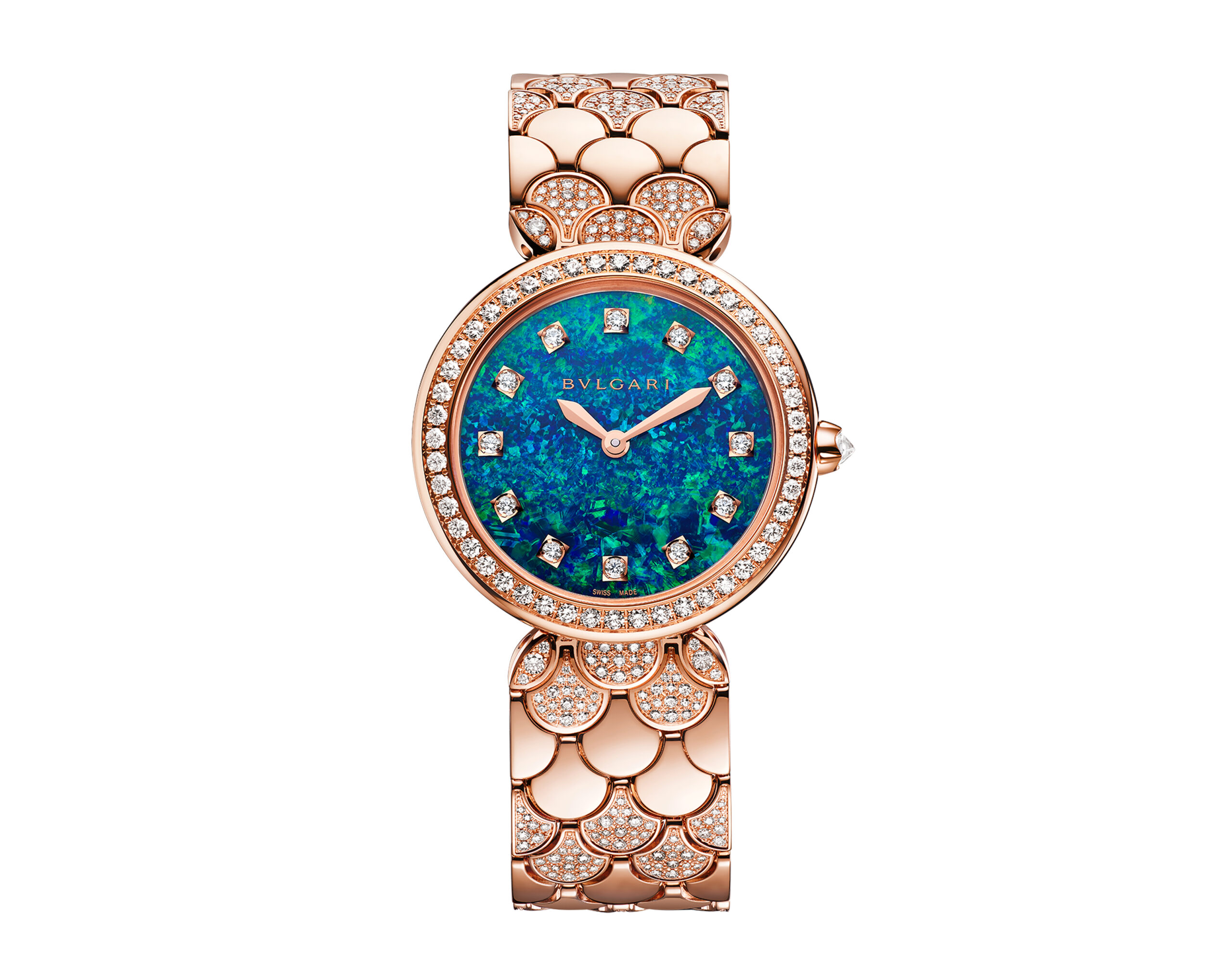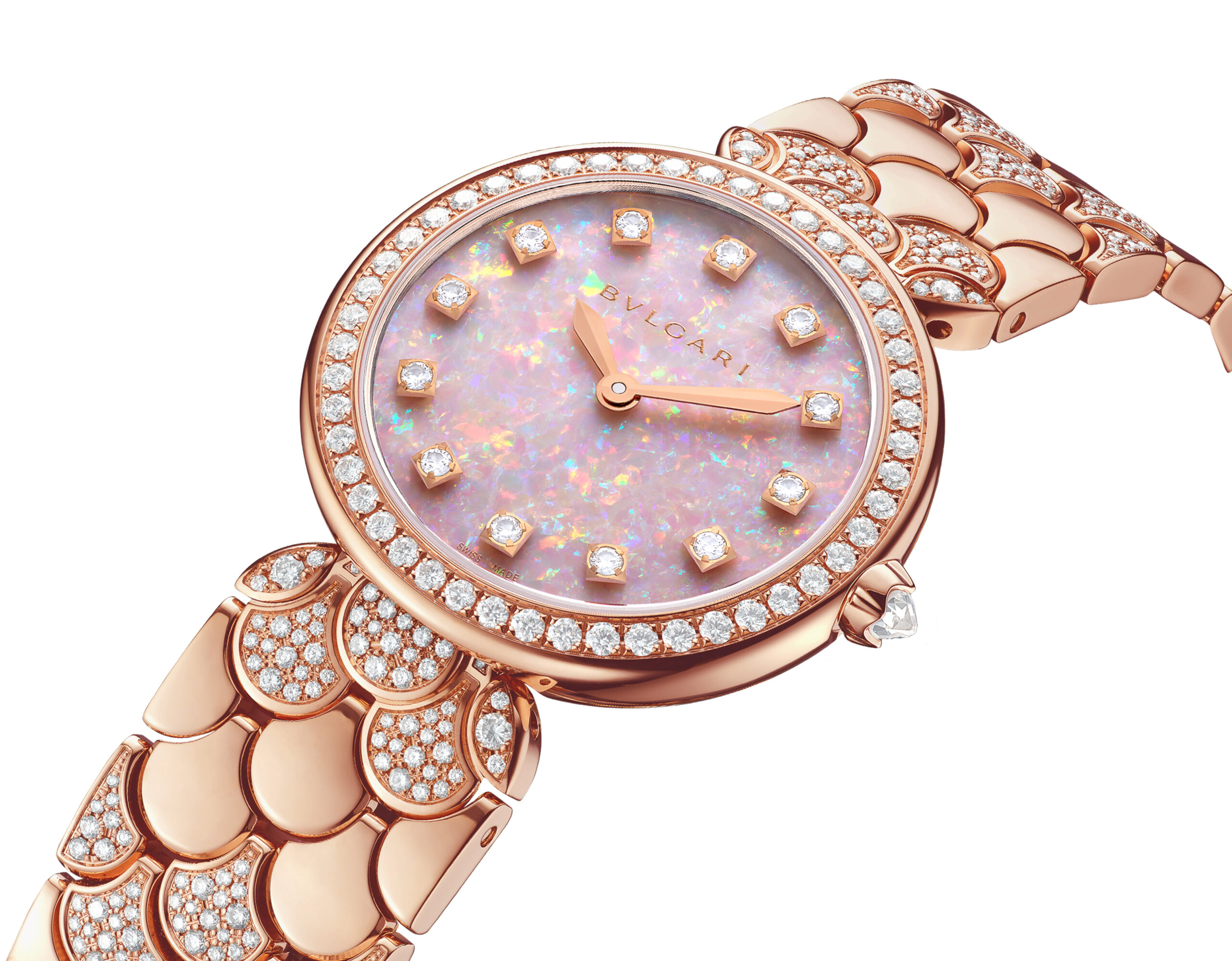 Sa silhouette élancée et ses lignes douces sont dignes de l’élégance de BULGARI et en font une montre cocktail idéale au quotidien. Déclinée en deux modèles inédits en or rose serti de diamants, elle exprime sa créativité et sa singularité à travers ses cadrans en pierres dures et l’éclat irisé de l’opale.