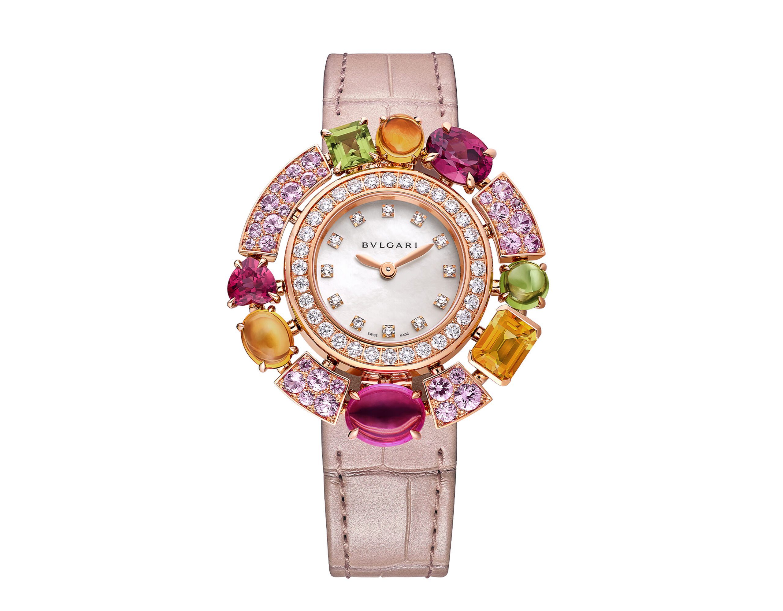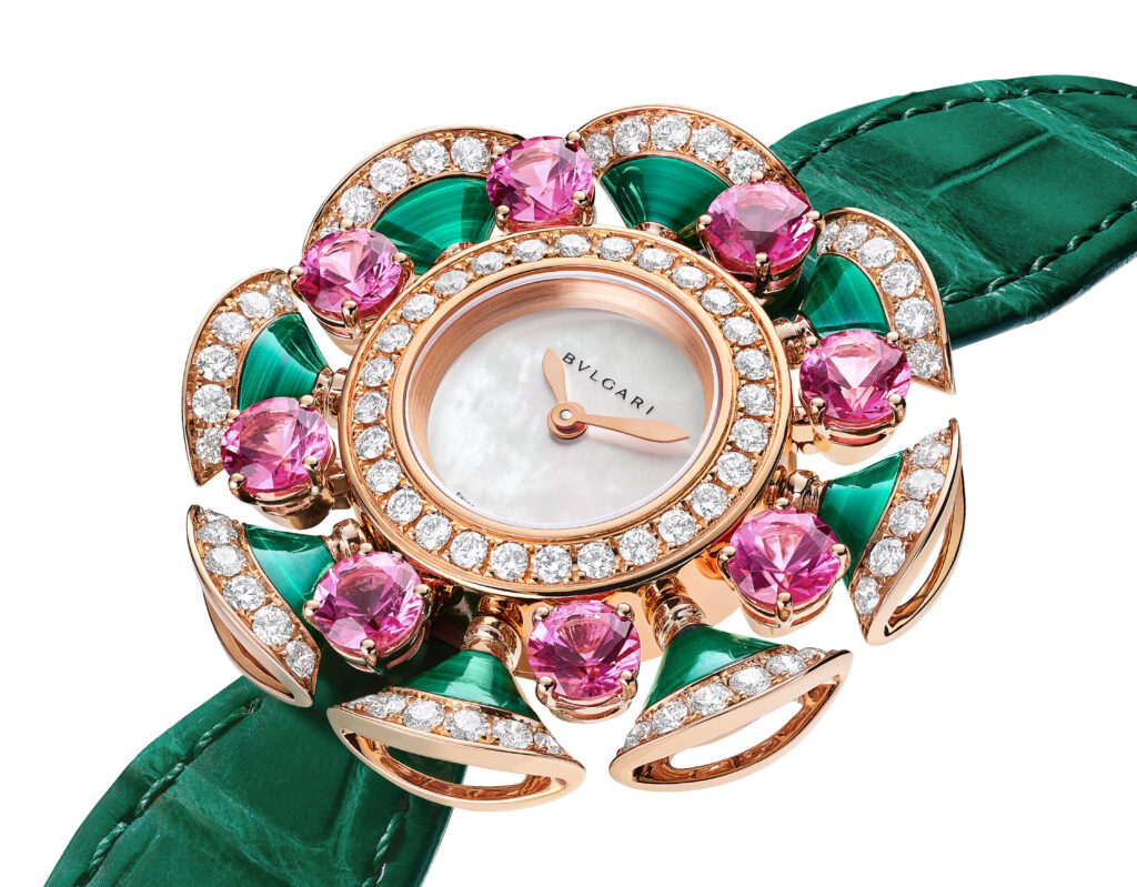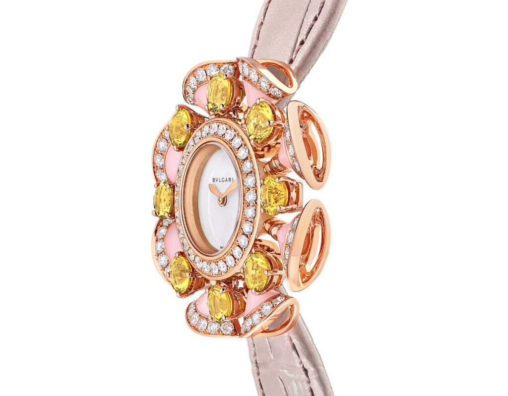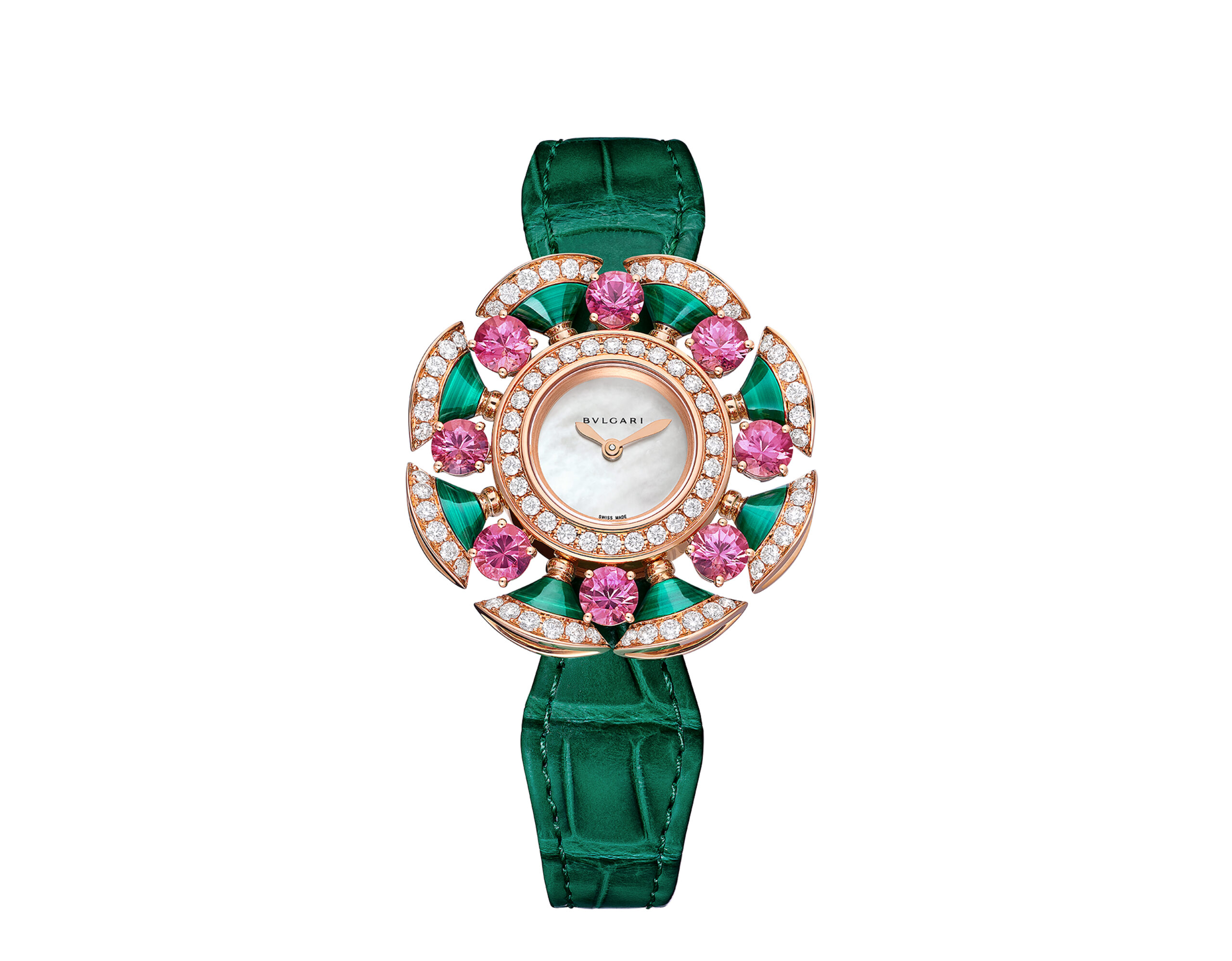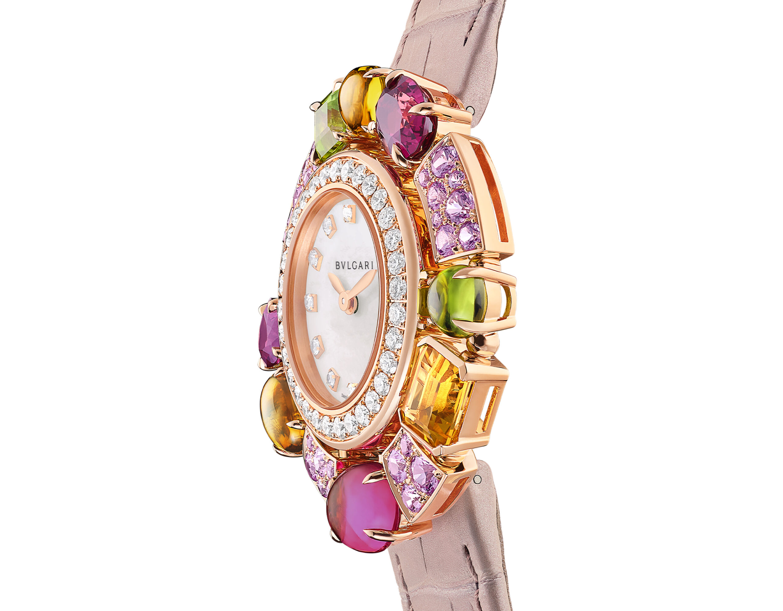Sa silhouette élancée et ses lignes douces sont dignes de l’élégance de BULGARI et en font une montre cocktail idéale au quotidien. Déclinée en deux modèles inédits en or rose serti de diamants, elle exprime sa créativité et sa singularité à travers ses cadrans en pierres dures et l’éclat irisé de l’opale.