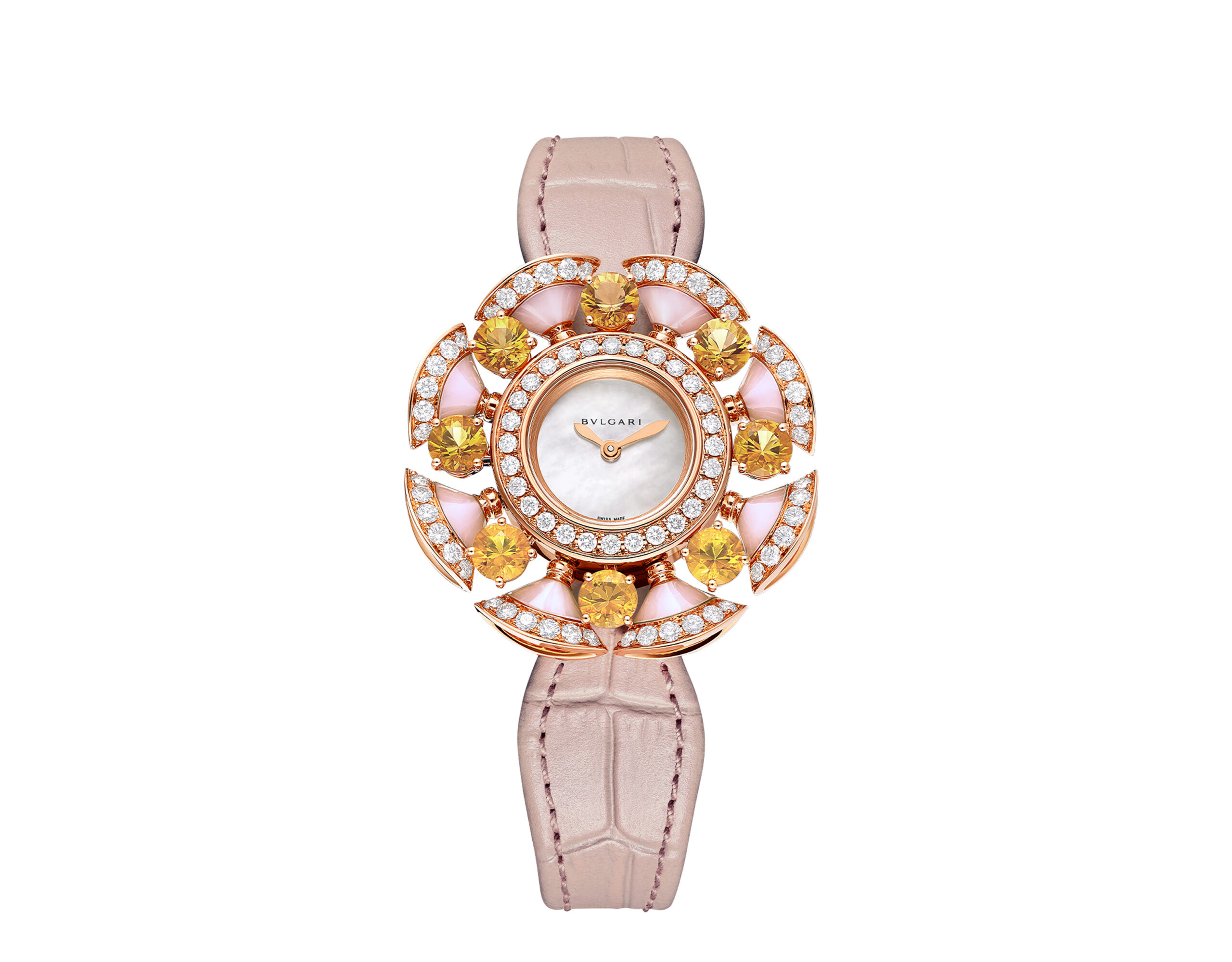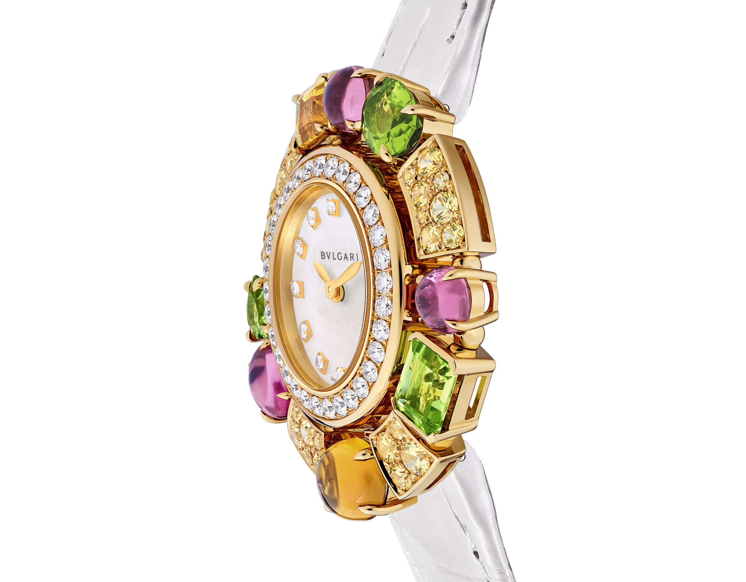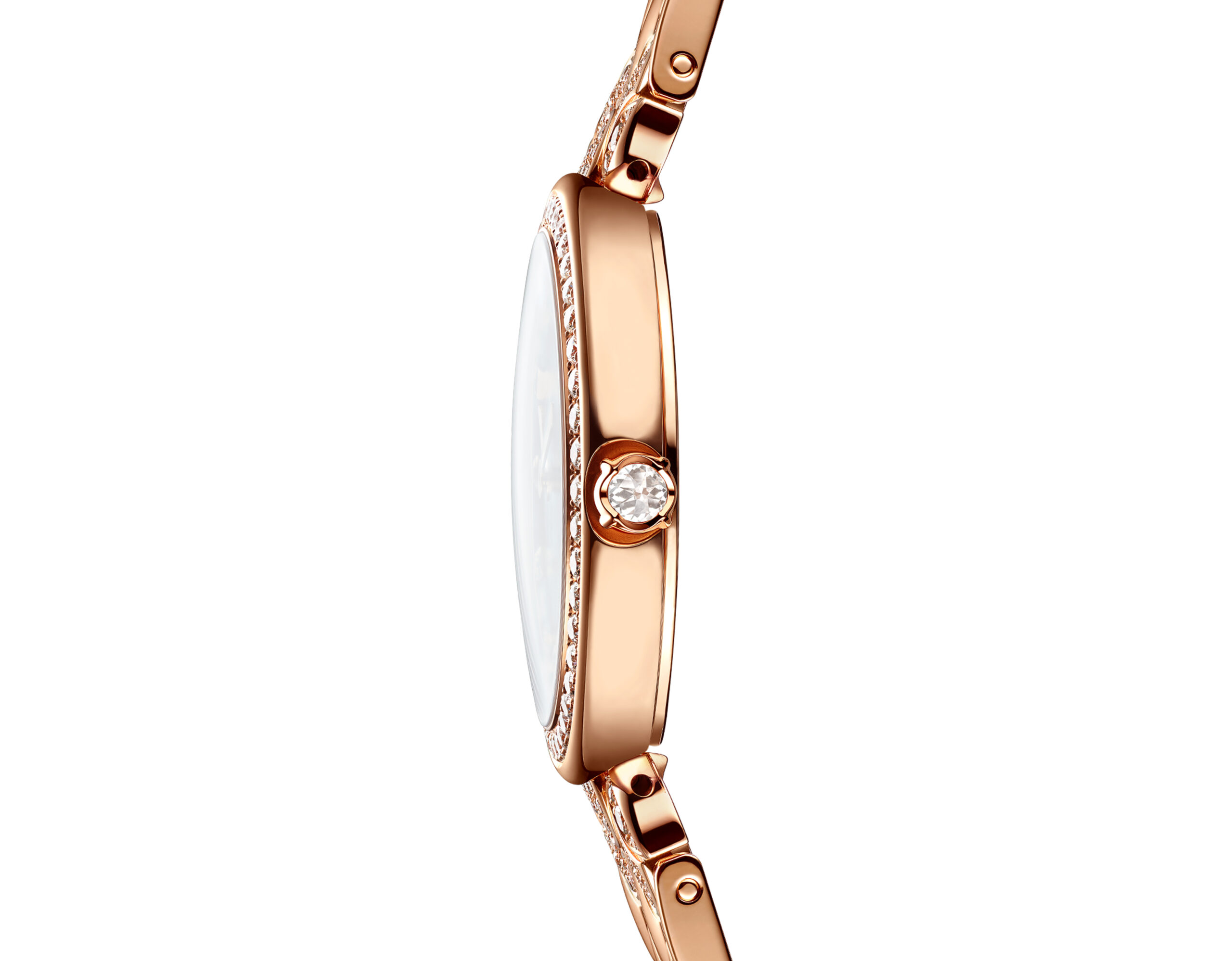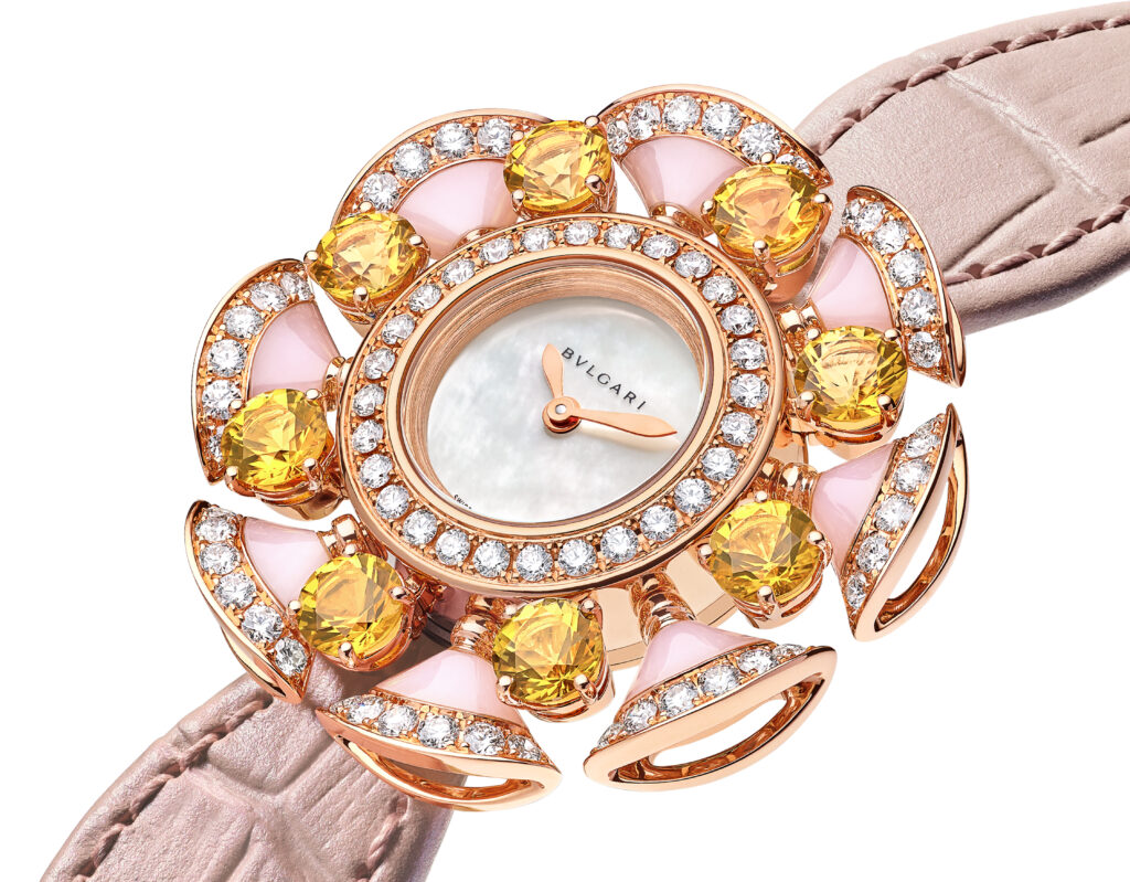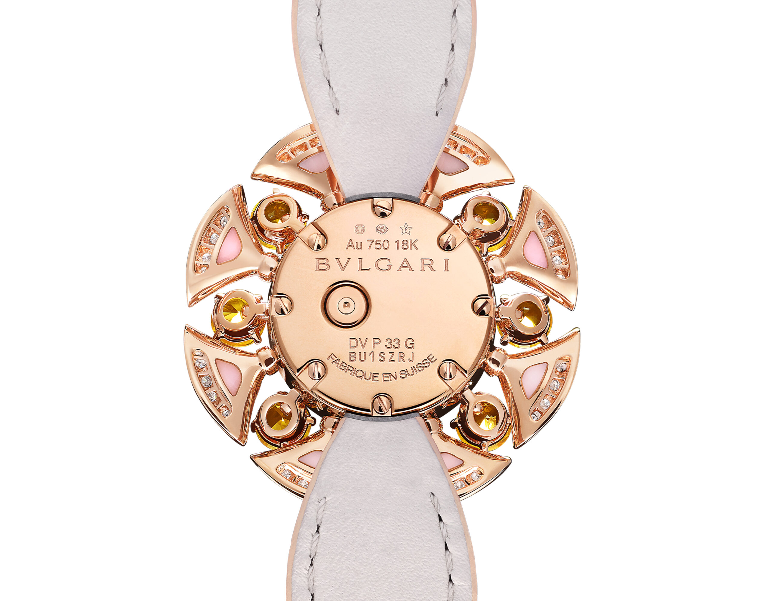 Sa silhouette élancée et ses lignes douces sont dignes de l’élégance de BULGARI et en font une montre cocktail idéale au quotidien. Déclinée en deux modèles inédits en or rose serti de diamants, elle exprime sa créativité et sa singularité à travers ses cadrans en pierres dures et l’éclat irisé de l’opale.