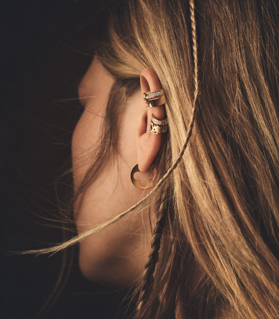 La versatilité s’exprime dans un sautoir qui se métamorphose avec aisance en bracelet multi-rangs ou en collier au gré de ses envies. Des créoles sculpturales et une ear cuff en or rose sertie développent la force géométrique de leurs