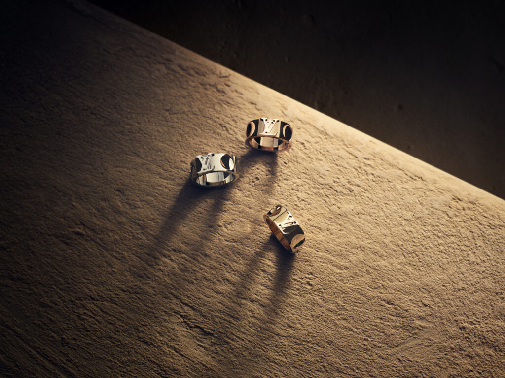 Sur des pièces en or jaune, or blanc ou en or rose 18 carats, destinées aux femmes mais également aux hommes, l’empreinte des clous des malles scande à l’infini sa stimulante impression de vivacité aux côtés des puissantes initiales LV imaginées par Georges Vuitton en 1896 ou de la mythique Fleur de Monogram, élégamment ajourée.