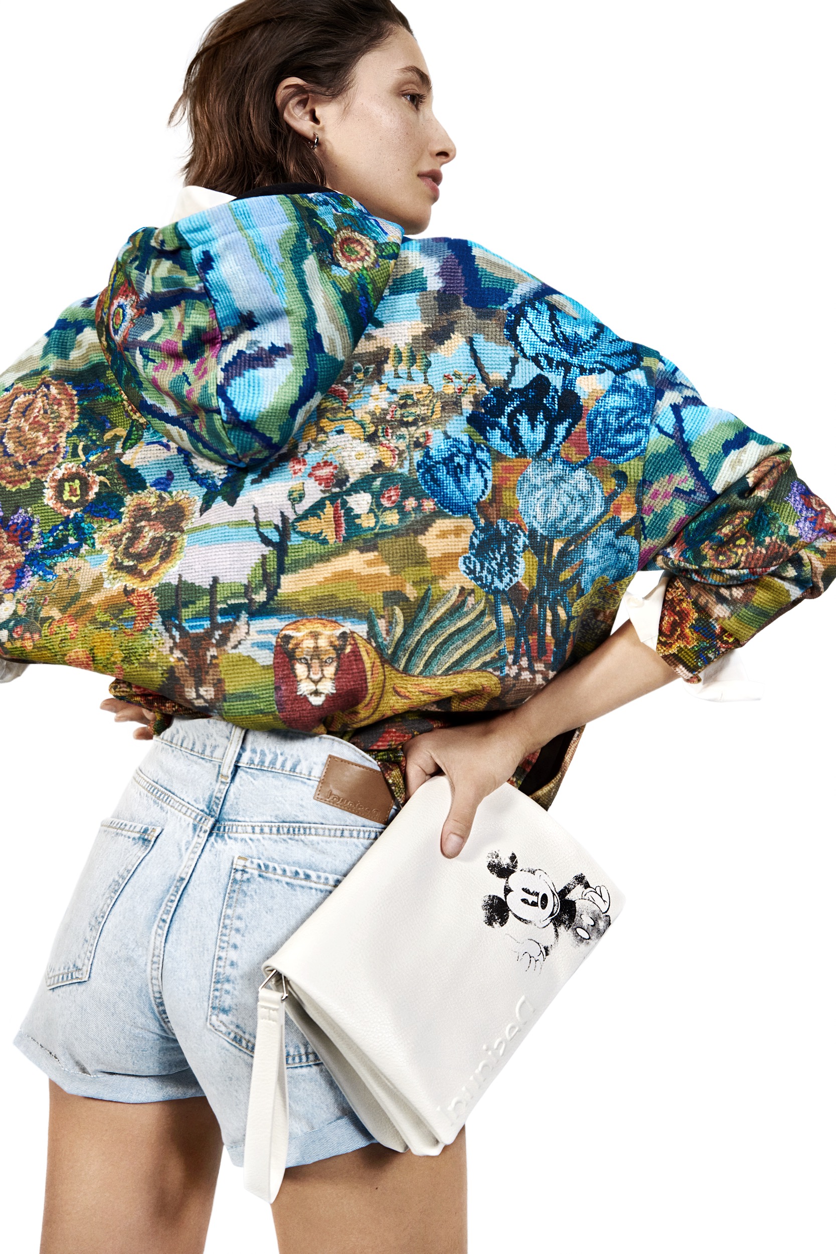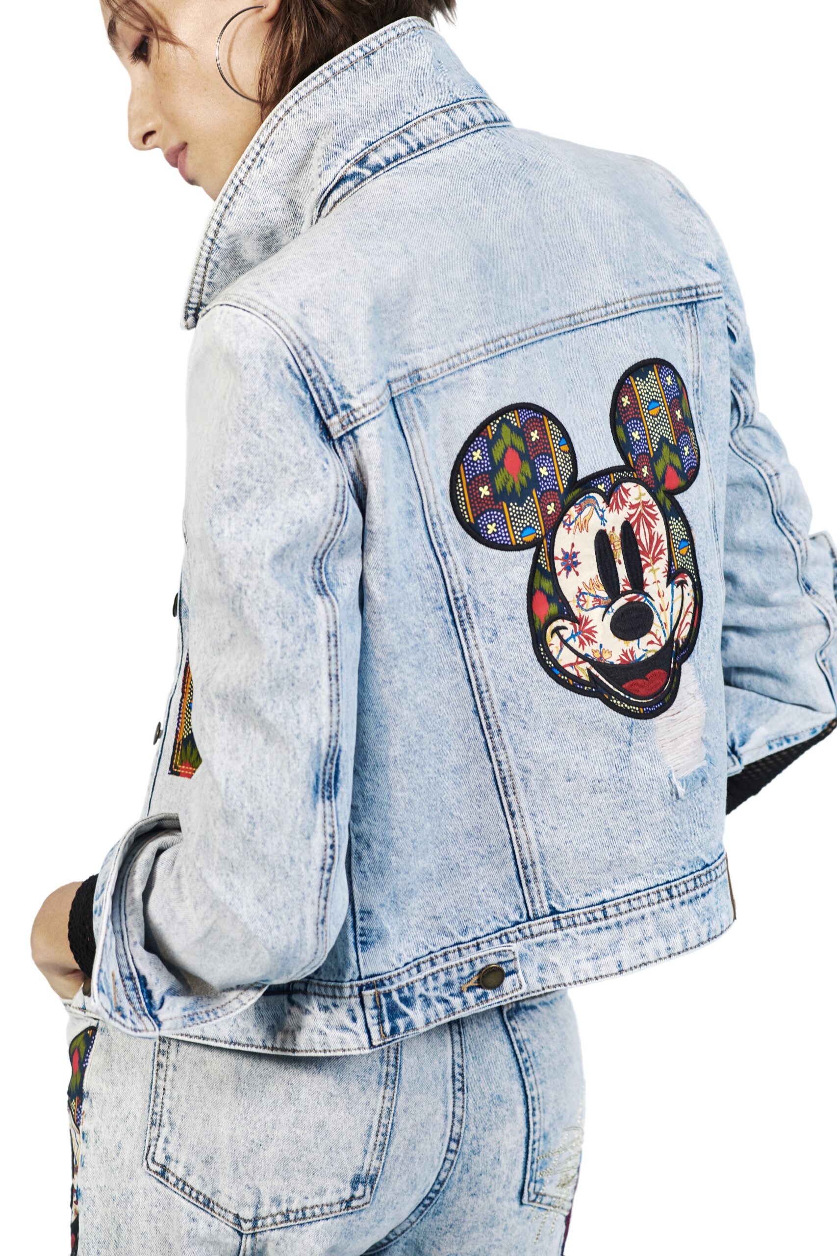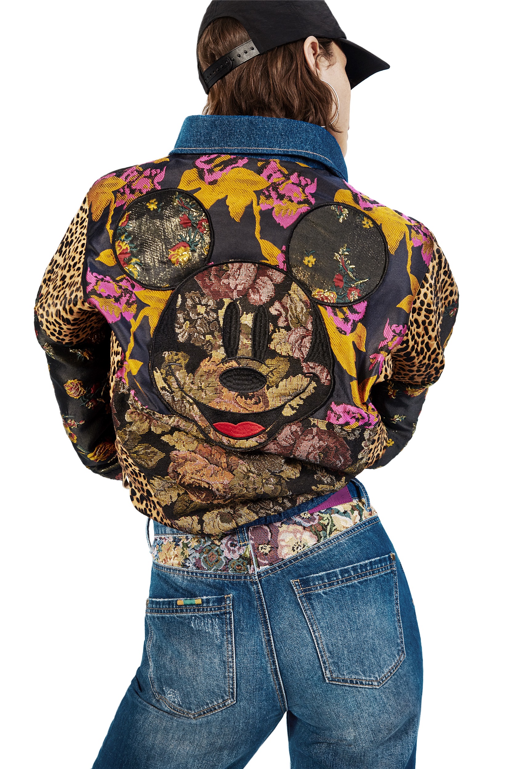 Un autre design incontournable de la capsule est la veste bomber, créée avec un patchwork de brocarts, d’animal print et de denim. Au dos, on devine un grand empiècement de Mickey Mouse, le personnage emblématique de Disney, élaboré avec différents tissus et broderies.