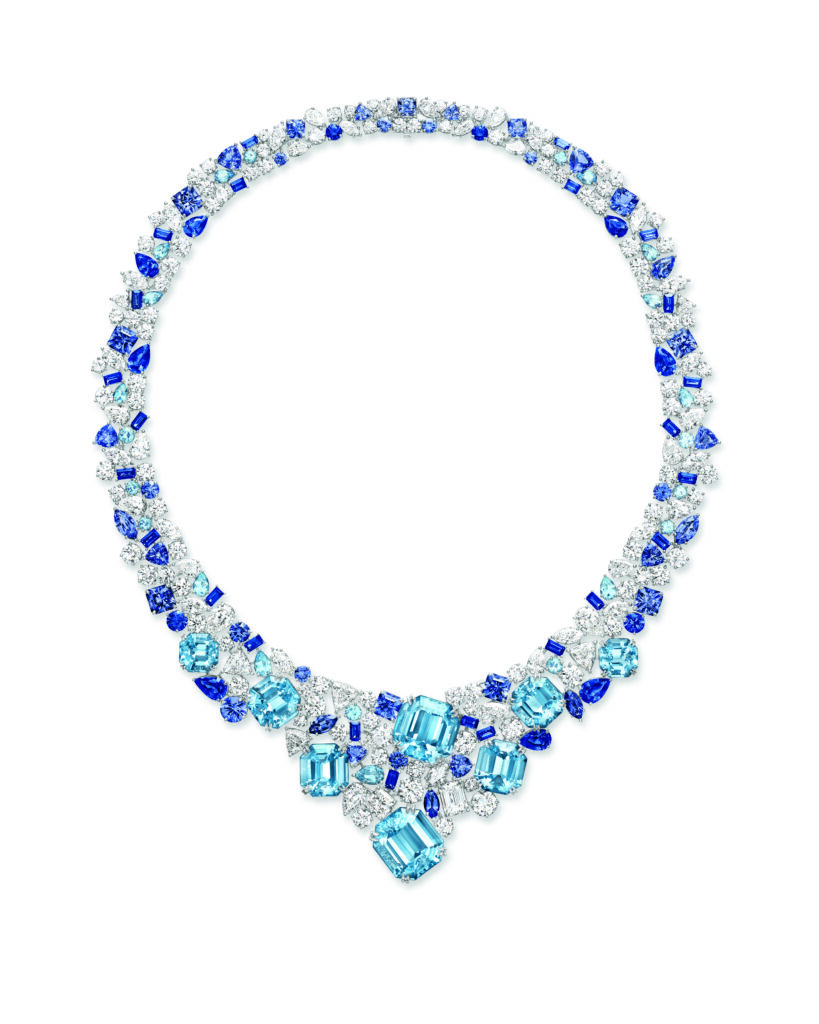 Une myriade de pierres précieuses aux nuances de bleu et de vert rappelle les eaux paisibles d’îles lointaines. Cette vue aérienne de l’une des destinations les plus idylliques des Caraïbes se distingue par son dégradé dans lequel la côte bordée de palmiers et d’eaux cristallines rencontre le bleu profond de l’océan. Pour refléter la topographie colorée de l’île, les experts Harry Winston ont recherché les pierres les plus incroyables qui, ensemble, forment un dégradé parfait, du vert clair au bleu profond, en miroir de la nature. Une palette aquatique de tourmaline indigolite, Paraíba bleue, Paraíba verte, tourmaline menthe et verte associée aux diamants, suggère avec magie le paysage époustouflant. Les pierres taillées en forme de poire et montées sur le collier Island Waters semblent flotter au-dessus de leur monture pour un bijou à la beauté onirique.