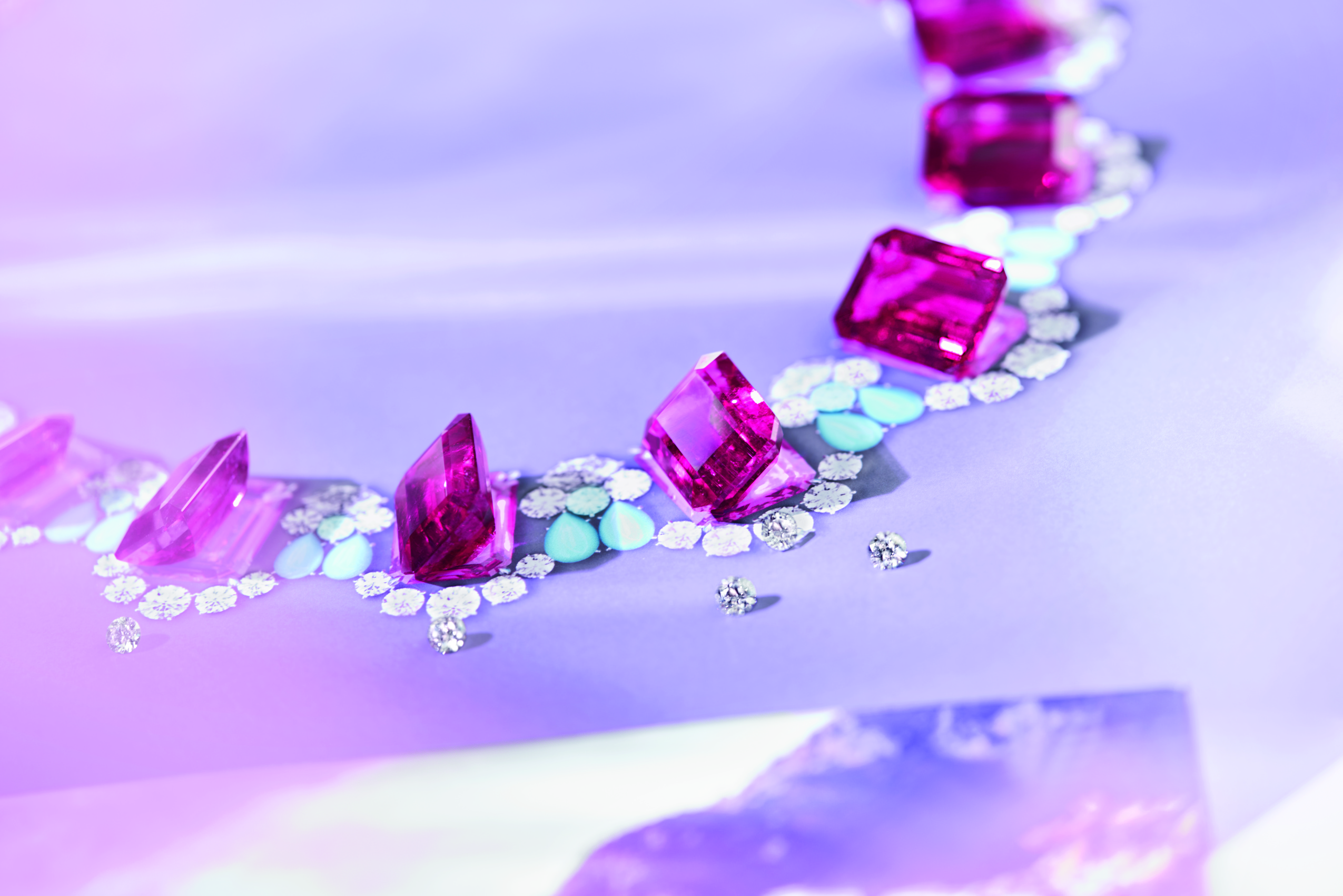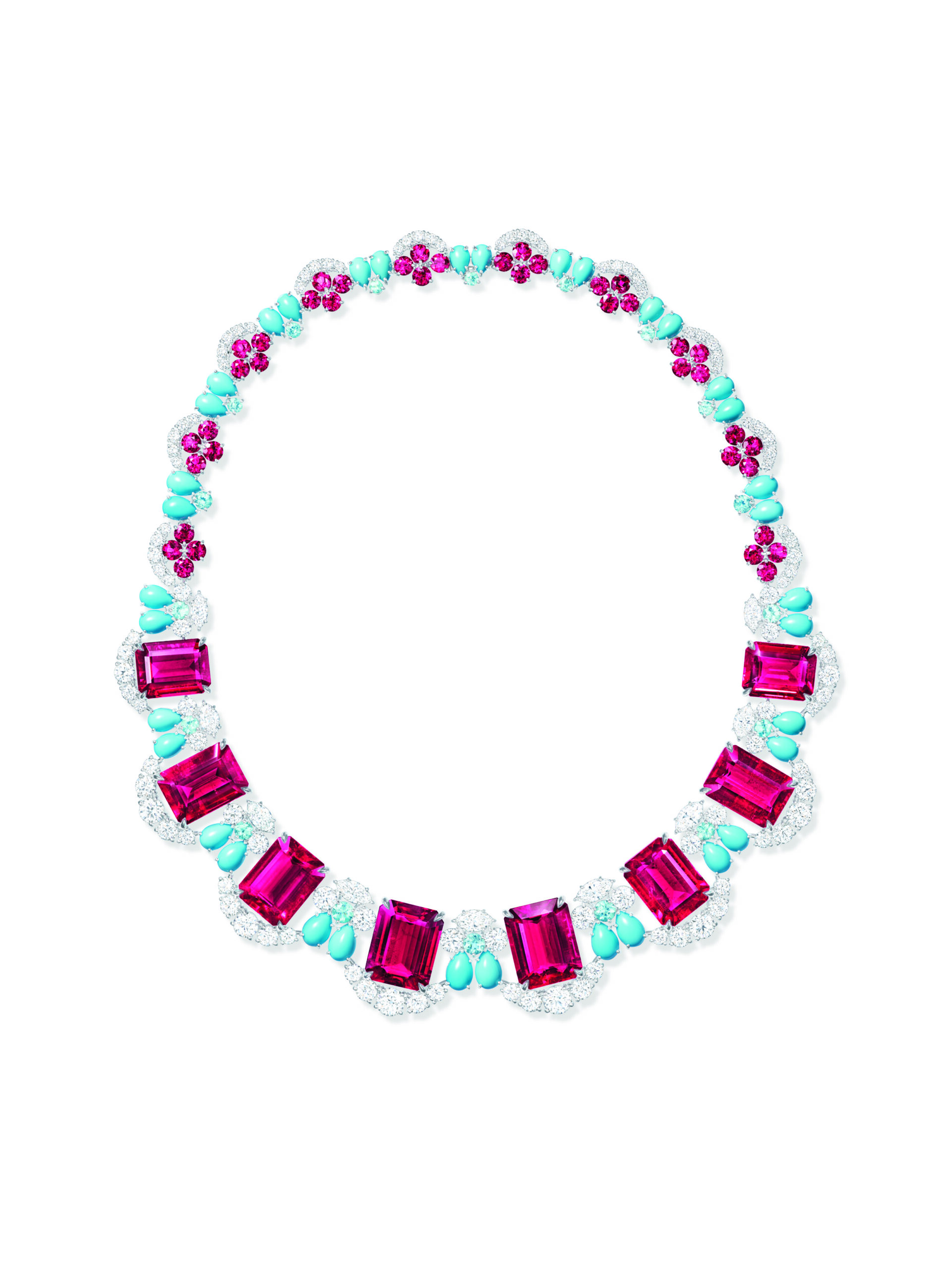 Des fleurs parfumées réinterprétées en gemmes fuchsia baignées d’une eau turquoise. Une parure extraordinaire, composée d’un collier et de boucles d’oreilles qui déploient une farandole de rubellites, de tourmalines Paraíba, de turquoises et de diamants : tout le charme et la beauté des paysages méditerranéens. Le collier Bougainvillea est serti de huit rubellites taille émeraude arrangées de sorte à évoquer les superbes pétales roses du bougainvillier, typique de la région côtière, tandis que les turquoises et les tourmalines Paraíba capturent la magnificence de la mer en toile de fond. Les boucles d’oreilles assorties déclinent les mêmes couleurs vibrantes, avec deux pierres taille émeraude suspendues à une cascade de diamants, turquoises et tourmalines Paraíba.