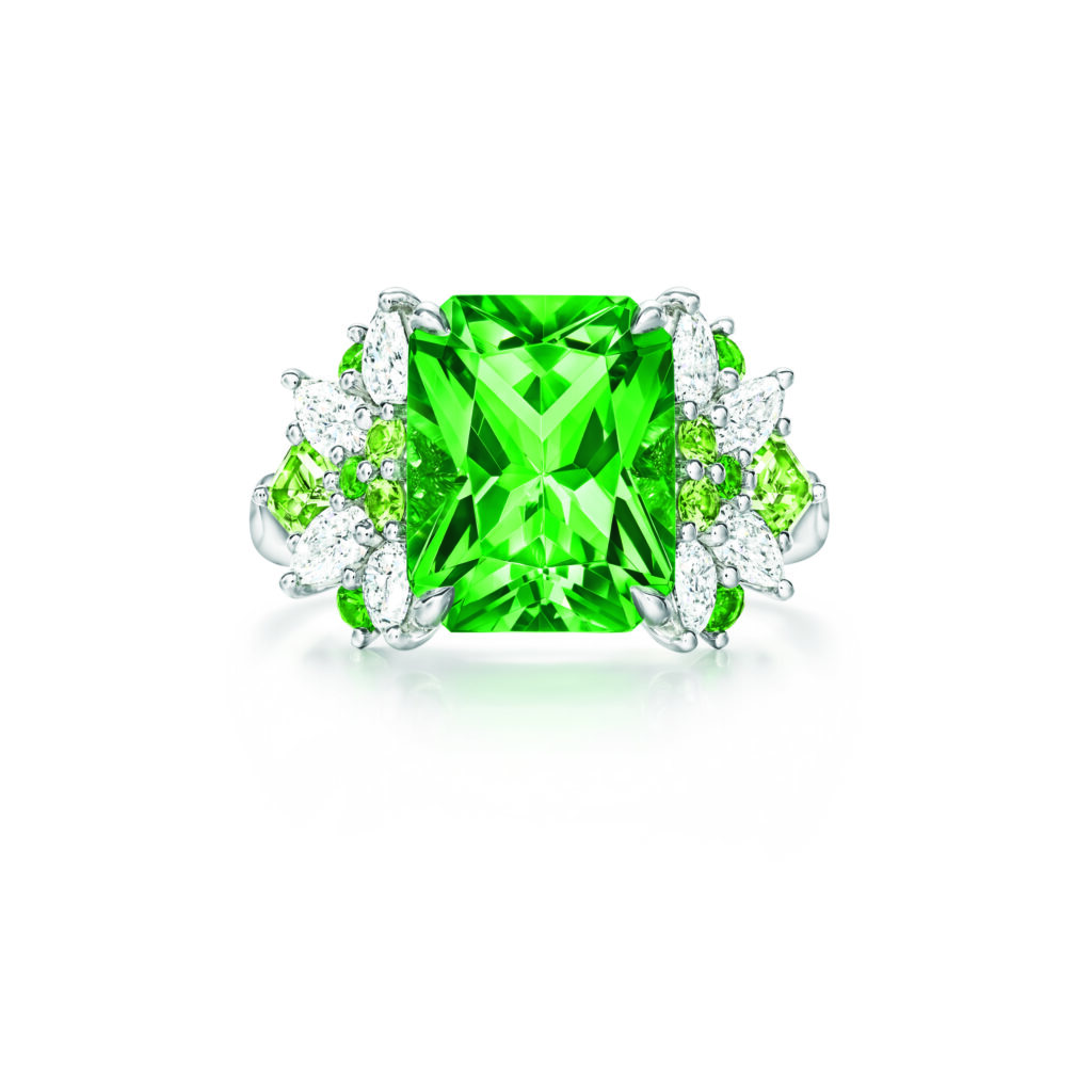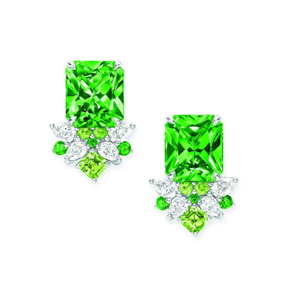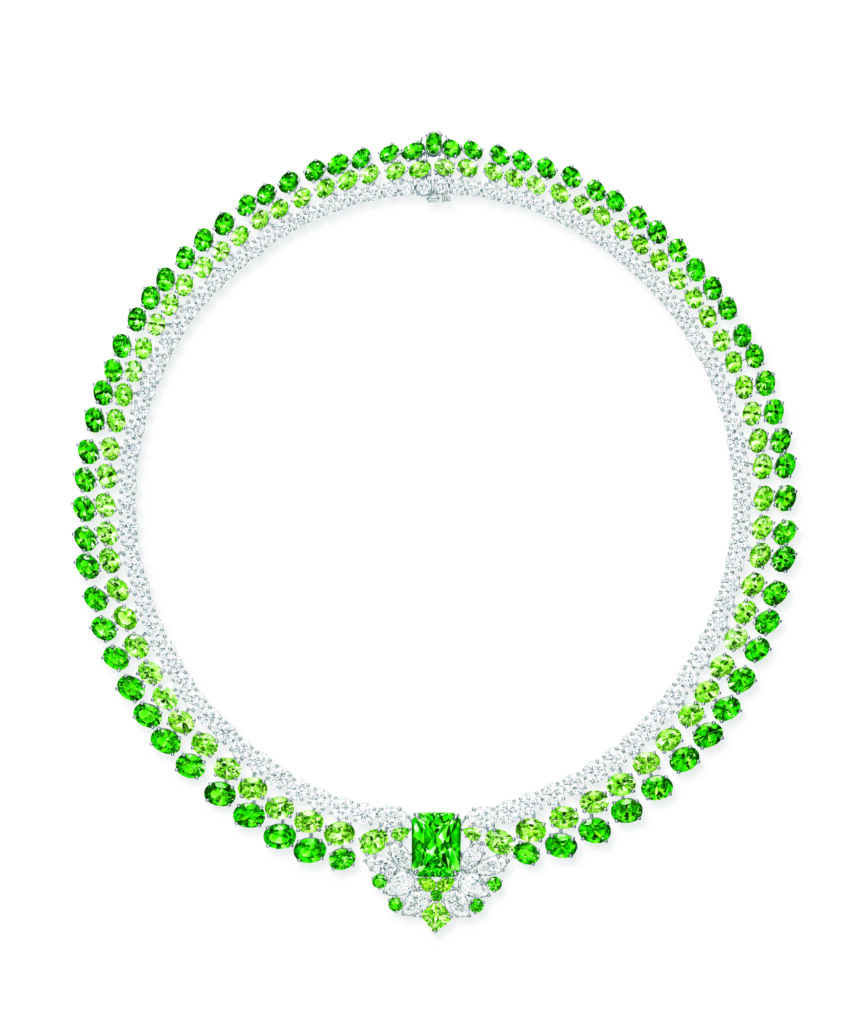 L’essence magique de la nature prend vie à travers des pierres aussi luxuriantes que son paysage. La parure Rainforest — collier, boucles d’oreilles et bague — réunit des grenats tsavorite verts aux nuances variées qui capturent la profusion de la forêt tropicale. Un grenat tsavorite taille émeraude repose au centre de trois rangs consécutifs de pierres dégradées qui semblent flotter sur leur monture — un vert foncé, suivi d’un vert plus clair et enfin de diamants. Ce design sophistiqué, ainsi que la palette de couleurs, représentent les différentes strates de la forêt, tandis que l’anneau de diamants symbolise les rayons de lumière qui transpercent la canopée et illuminent les cascades et ruisseaux jaillissant du sol.