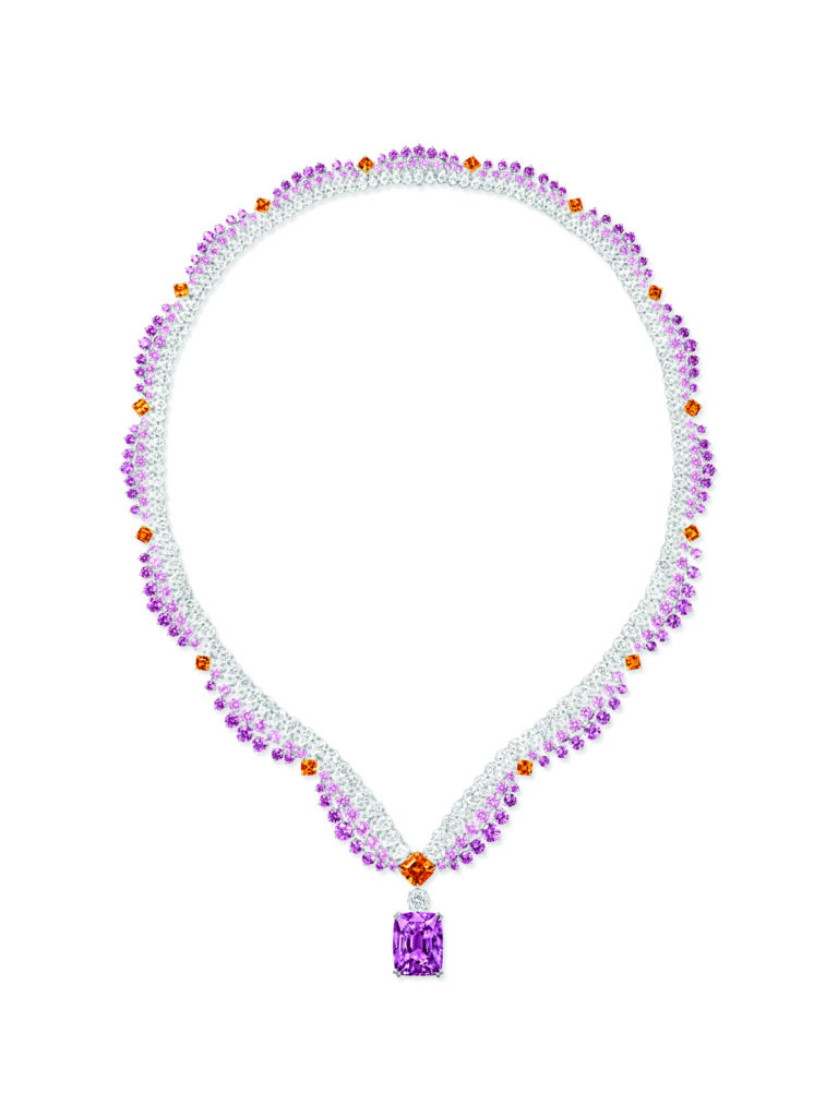 Les nuances du coucher de soleil interprétées par de sublimes joyaux. Le collier et la bague Colors of Sunset rappellent la beauté solennelle de l’une des sept merveilles naturelles du monde. Saphirs rose-violacé et grenats spessartite orange se marient aux diamants dans un harmonieux collier ondulant qui évoque les spectaculaires vues sur le Grand Canyon au