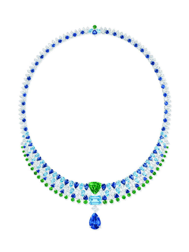Un jardin verdoyant qui fleurit dans une création de joaillerie contemporaine. Les magnifiques jardins de Marrakech ont inspiré le collier Le Jardin. Façonné à partir de saphirs, aigues-marines, grenats tsavorites et diamants, ce collier à plusieurs rangs est à la fois classique et contemporain grâce à la disposition travaillée de ses pierres. Au centre, se trouve un trio de pierres précieuses exceptionnelles taille fancy: un grenat tsavorite de forme triangulaire, une aigue-marine taille émeraude sertie horizontalement et un saphir taille poire.