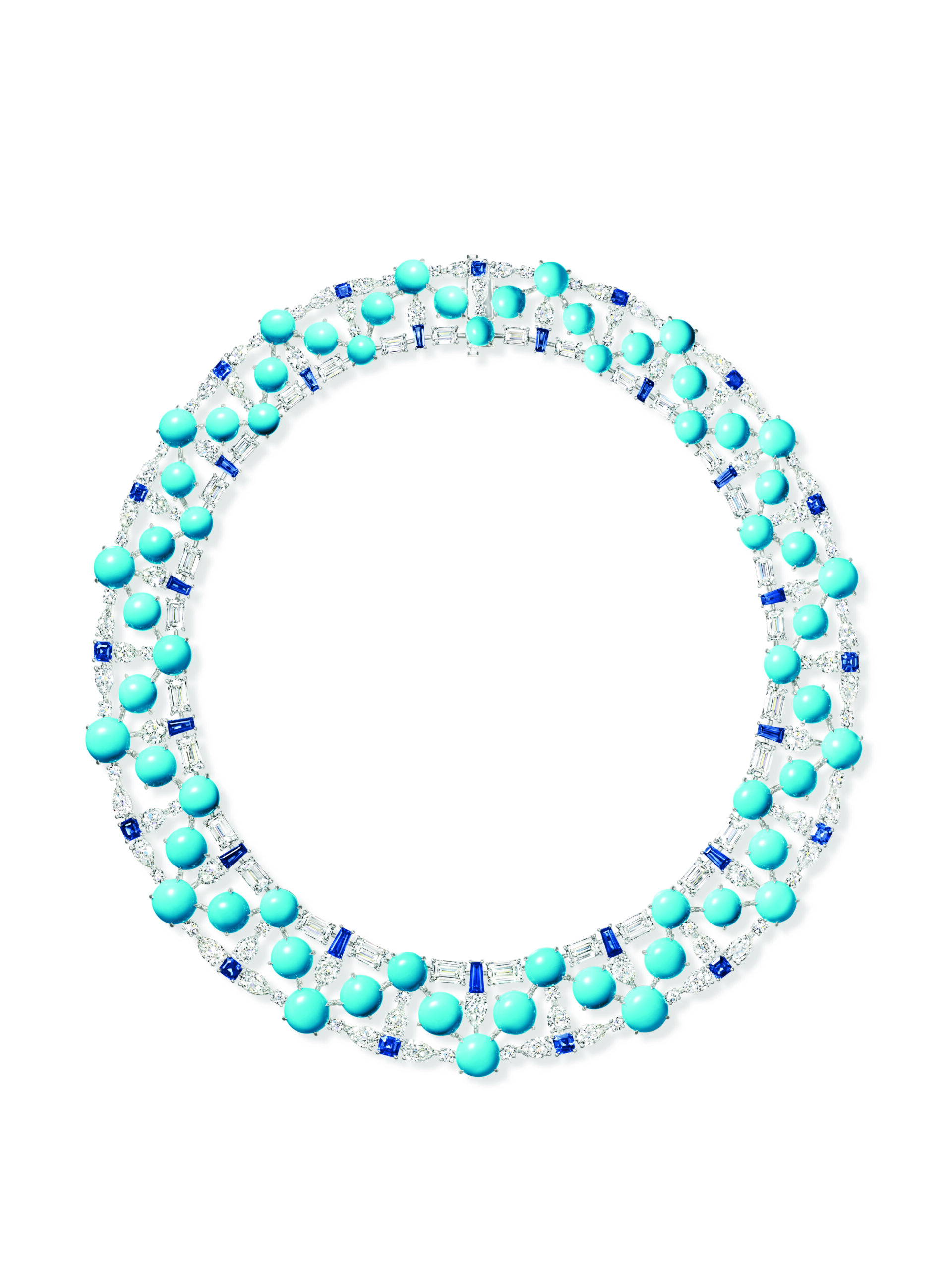 Le joyau du Pacifique capturé dans une parure aux gemmes incomparables. La ligne Turquoise Waters se compose d’un collier et de boucles d’oreilles sertis de rangs de turquoises taille cabochon, parsemés de diamants et saphirs, pour capturer le bleu vif de la mer et les nuances dorées du sable des Fidji. Les superbes pierres bleutées de ce collier plastron sont animées d’un mouvement qui lui donne sa forme tout en épousant les courbes de celle qui le porte.