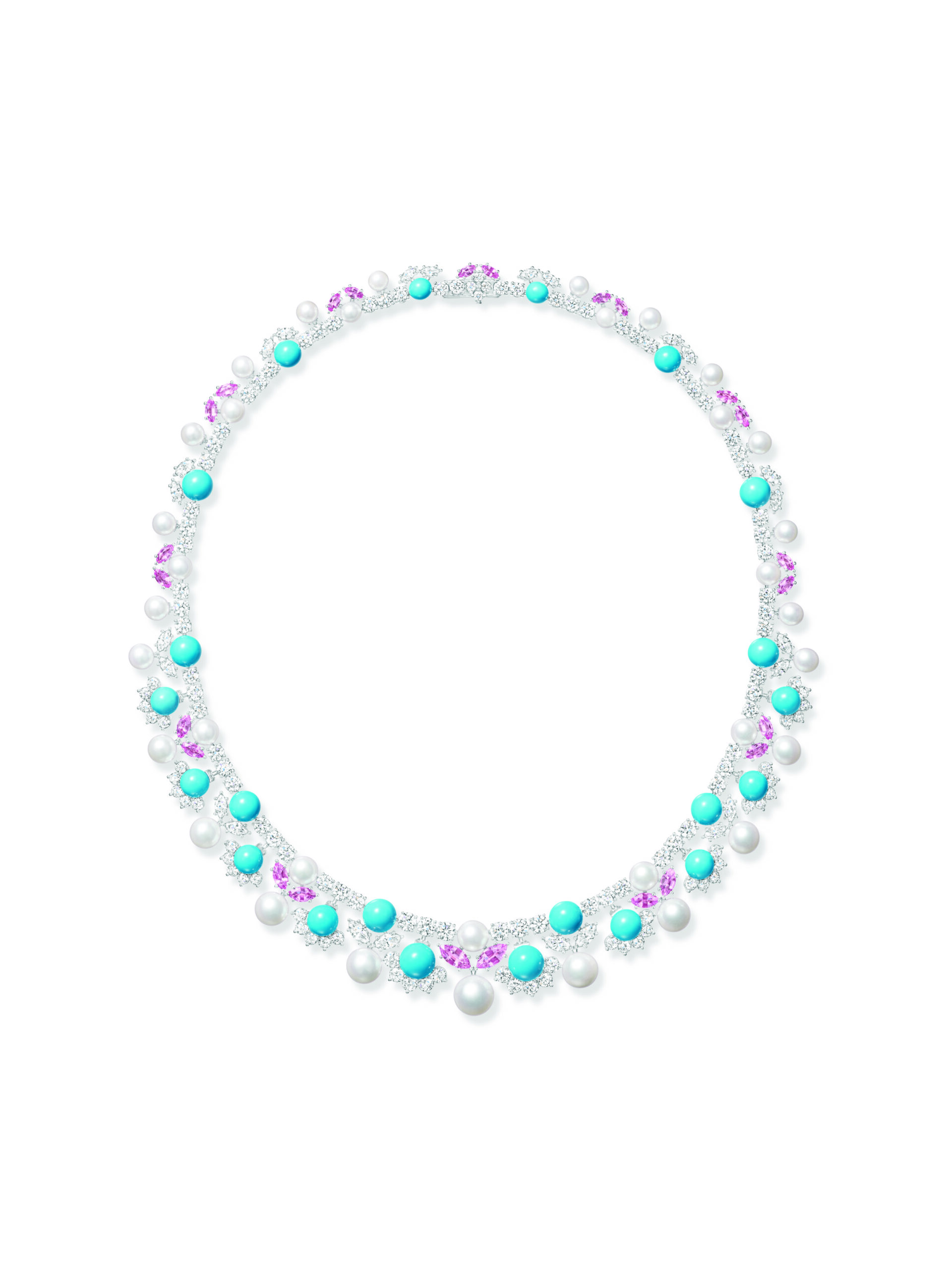 Le paradis en perles et nuances de rose. Île du Pacifique, Okinawa est une destination à la beauté absolue. Le collier Paradise Harbor rappelle Okinawa au lever du soleil, quand ses eaux sont calmes et que le soleil commence à pointer à l’horizon, lançant ses rayons aux teintes rose clair et violine sur l’océan bleu marine. Ce collier, au style résolument Winston, est serti de diamants et de perles de turquoise alternant avec des perles blanches, le tout rehaussé de saphirs roses.