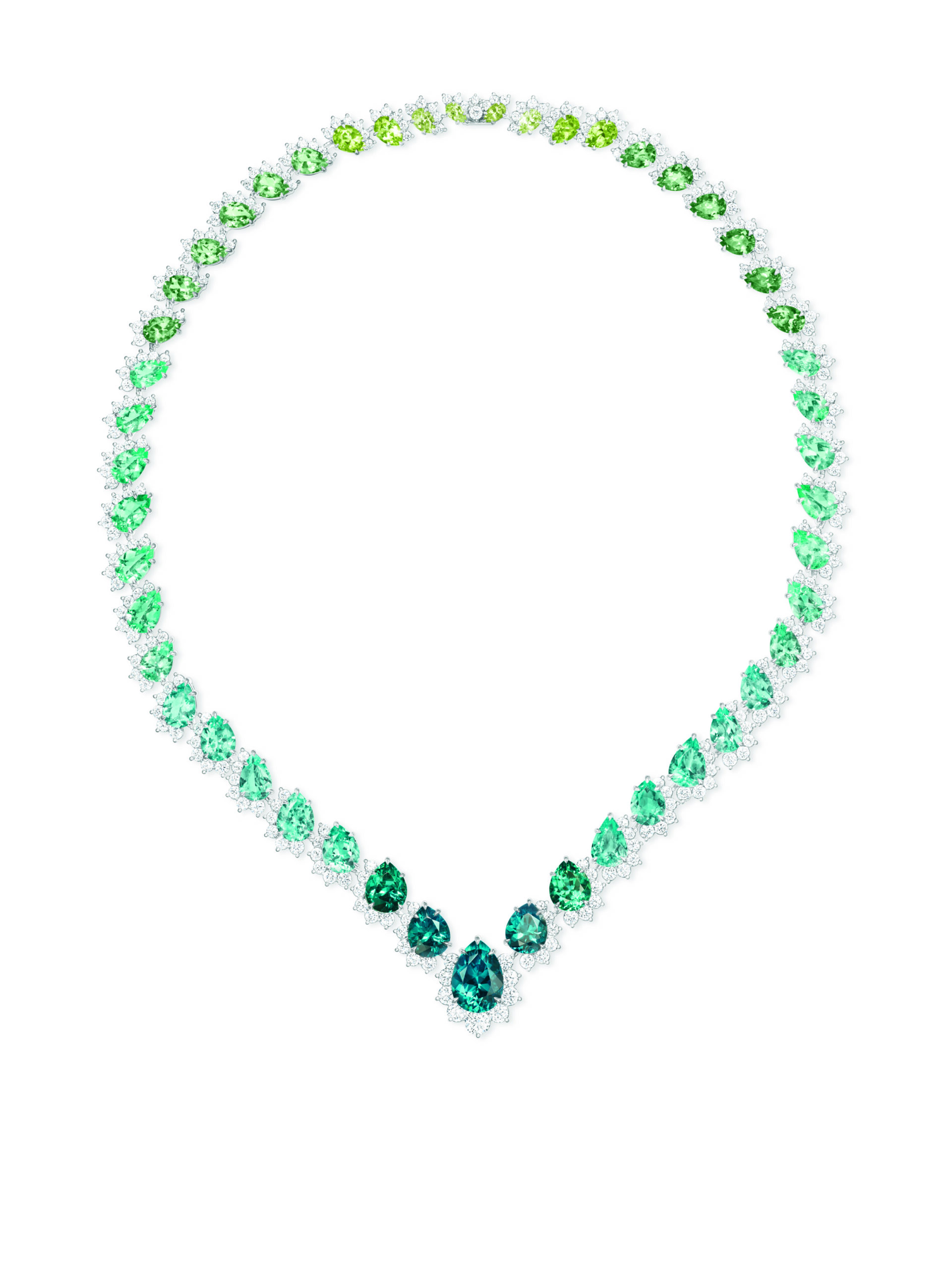 Une myriade de pierres précieuses aux nuances de bleu et de vert rappelle les eaux paisibles d’îles lointaines. Cette vue aérienne de l’une des destinations les plus idylliques des Caraïbes se distingue par son dégradé dans lequel la côte bordée de palmiers et d’eaux cristallines rencontre le bleu profond de l’océan. Pour refléter la topographie colorée de l’île, les experts Harry Winston ont recherché les pierres les plus incroyables qui, ensemble, forment un dégradé parfait, du vert clair au bleu profond, en miroir de la nature. Une palette aquatique de tourmaline indigolite, Paraíba bleue, Paraíba verte, tourmaline menthe et verte associée aux diamants, suggère avec magie le paysage époustouflant. Les pierres taillées en forme de poire et montées sur le collier Island Waters semblent flotter au-dessus de leur monture pour un bijou à la beauté onirique.