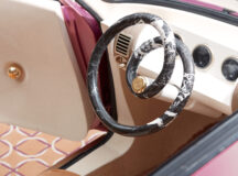 Renault 5 Diamant, soignée dans le moindre détail est réalisée à partir de matériaux d’excellence fournis par des artisans au savoir-faire reconnu et unique, suivie d’une exécution sans faille. Le show-car a bénéficié de l’expérience de Design et Solution, société spécialisée dans la réalisation de véhicules d’exception, chargée du développement, de l’assemblage et de la réalisation finale du show-car. En plus, plusieurs artisans qui travaillent au quotidien avec Pierre Gonalons ont participé au projet pour apporterleur expertise. En detail, le volant et le vide poches sont fabriqués en marbre recyclé par Minéral Expertise, employant un marbre français, le « Grand Antique d’Aubert », travaillé d’une manière tubulaire, qui le rend plus léger et malléable. Quant au tissu des fauteuils, il est produit par l’éditeur de textiles Métaphores, tandis que le tissu en crin de cheval gainant le tableau de bord est fabriqué par la société centenaire Le Crin, artisan qui maitrise le tissage manuel du crin de cheval. Le tapis de sol en laine mohair est fabriqué par Pinton, une des dernières manufactures de tapisserie d’art Français, historiquement installé à Aubusson. Enfin, la dorure des ornements de la voitures, comme du monogramme sur le capot, est réalisée par l’atelier Bertin-Aubert de Paris, qui se distingue par son savoir-faire et précision dans la réalisation.