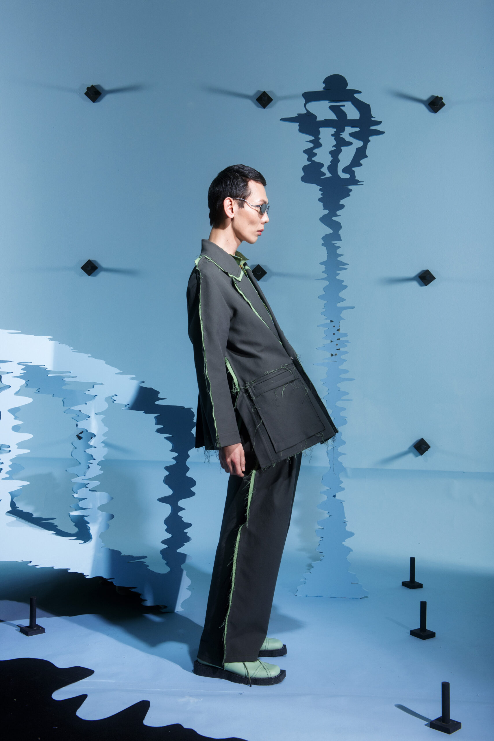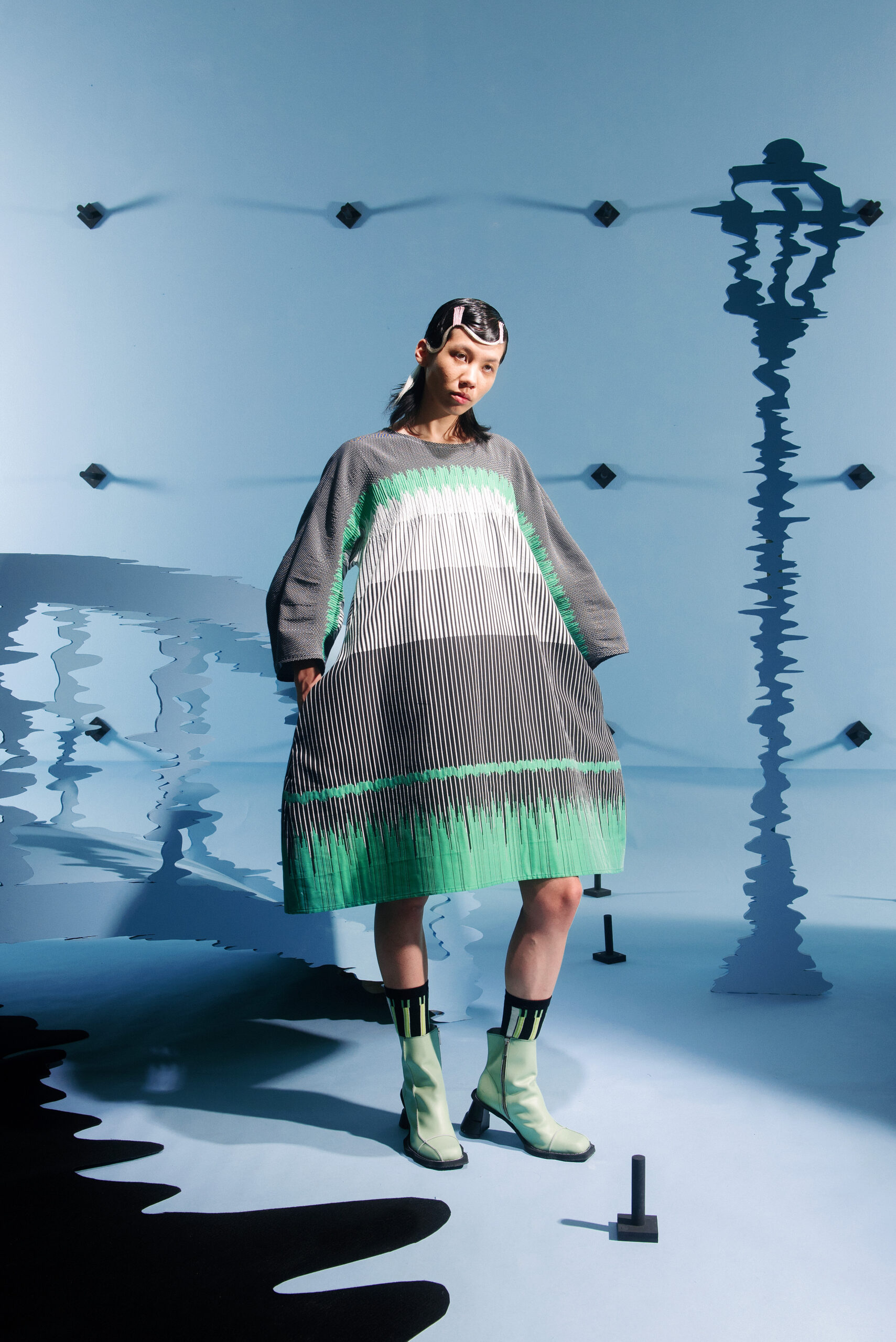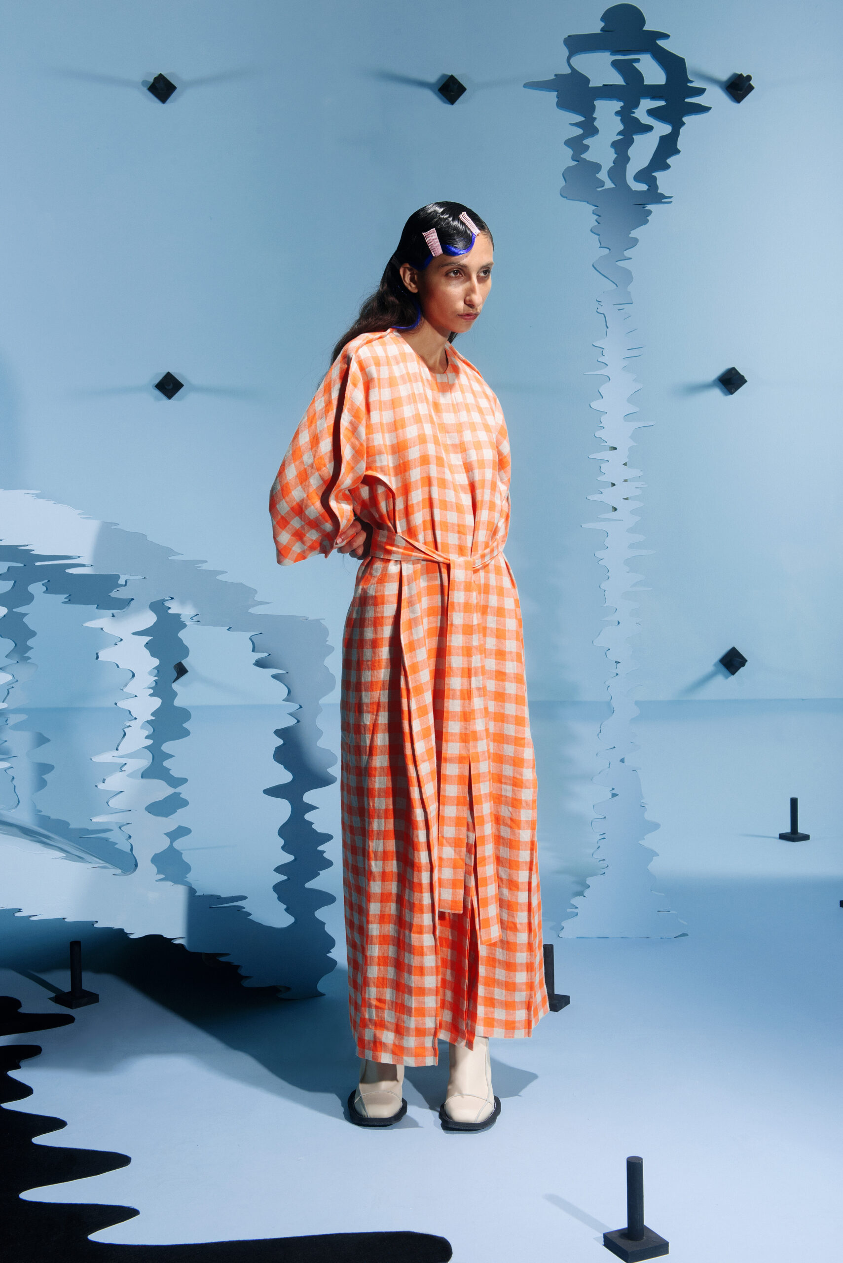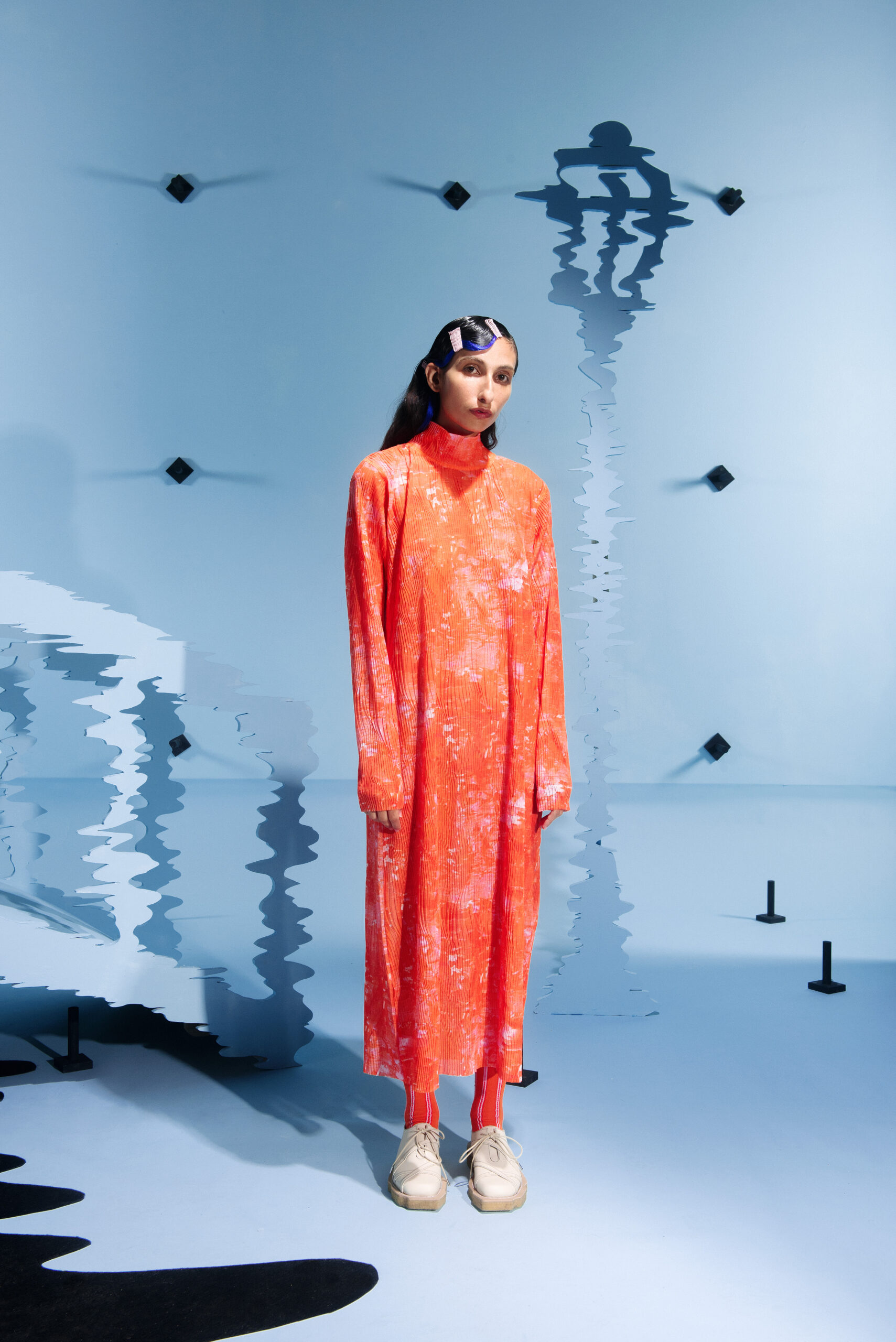 The collection’s color palette references the colors of nature and the manmade, showing the contrast between the calming of the blue and green with the noise of the orange.