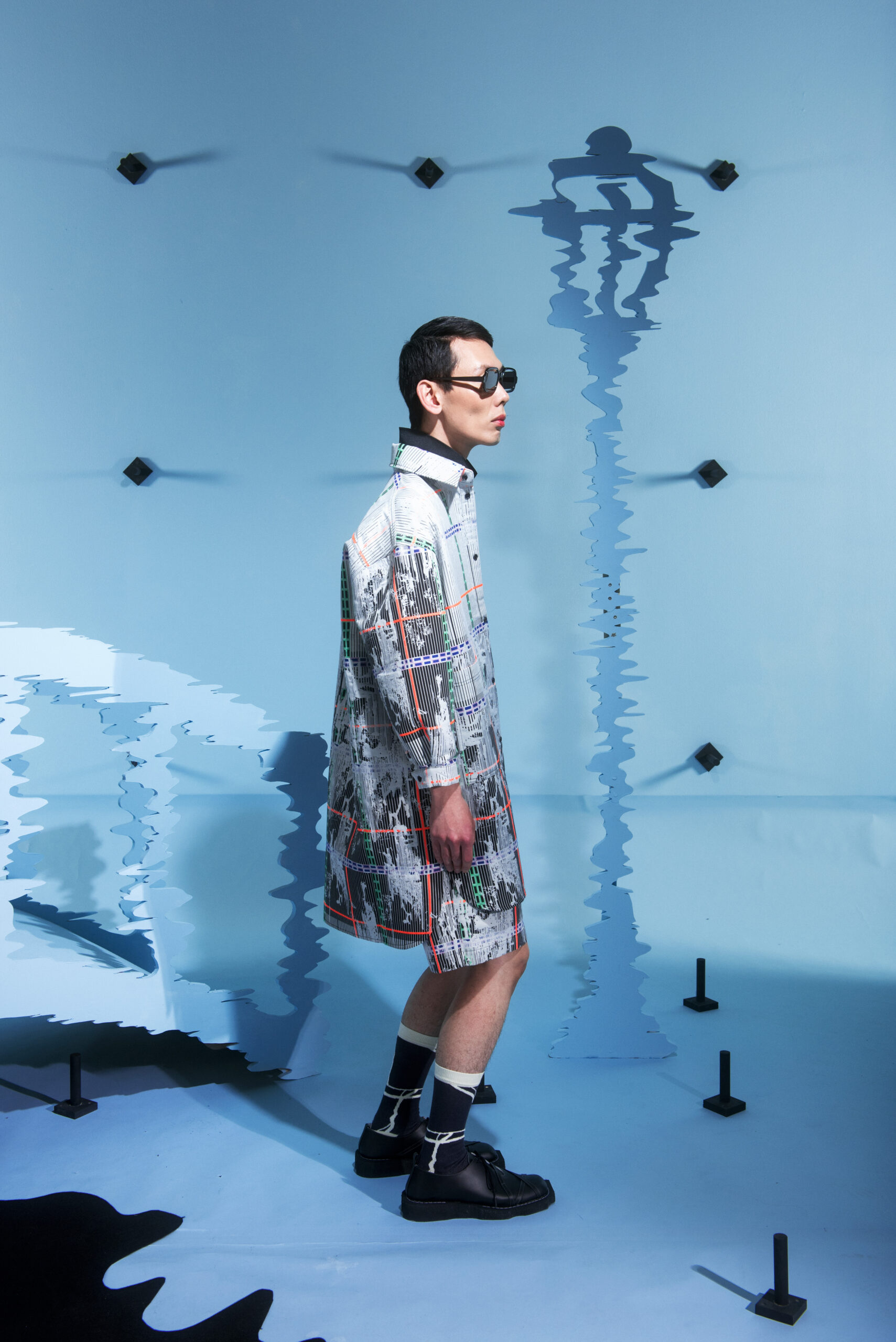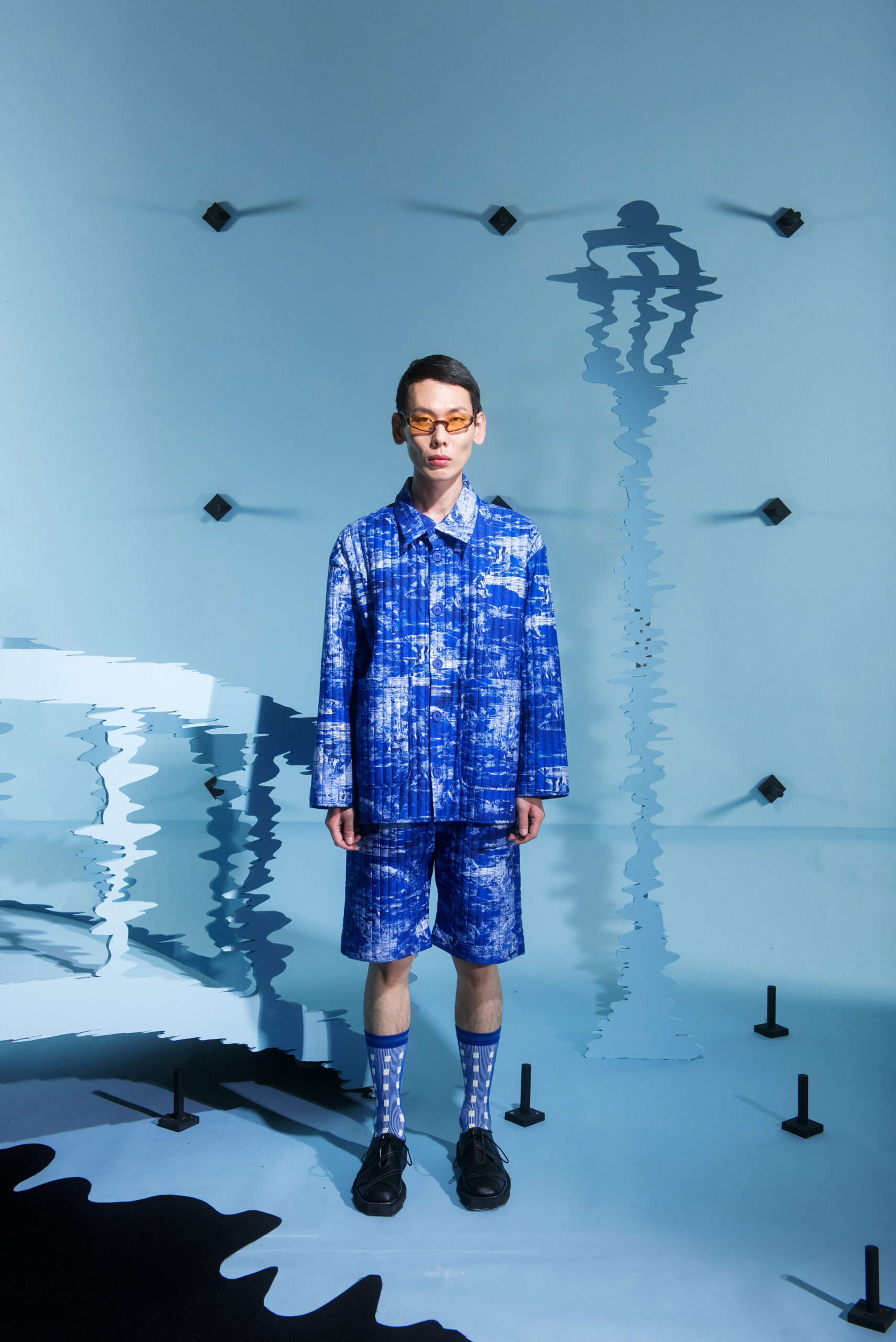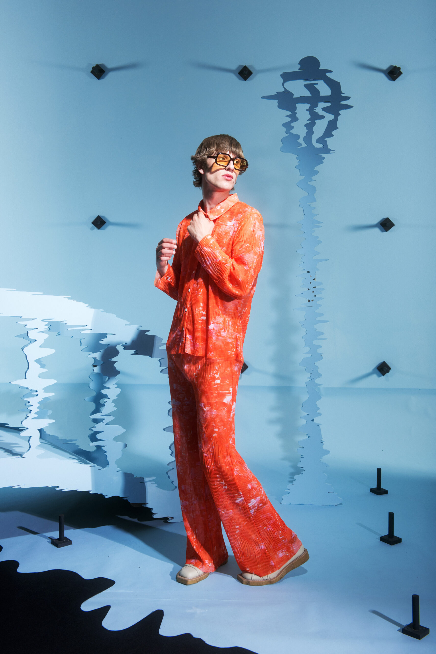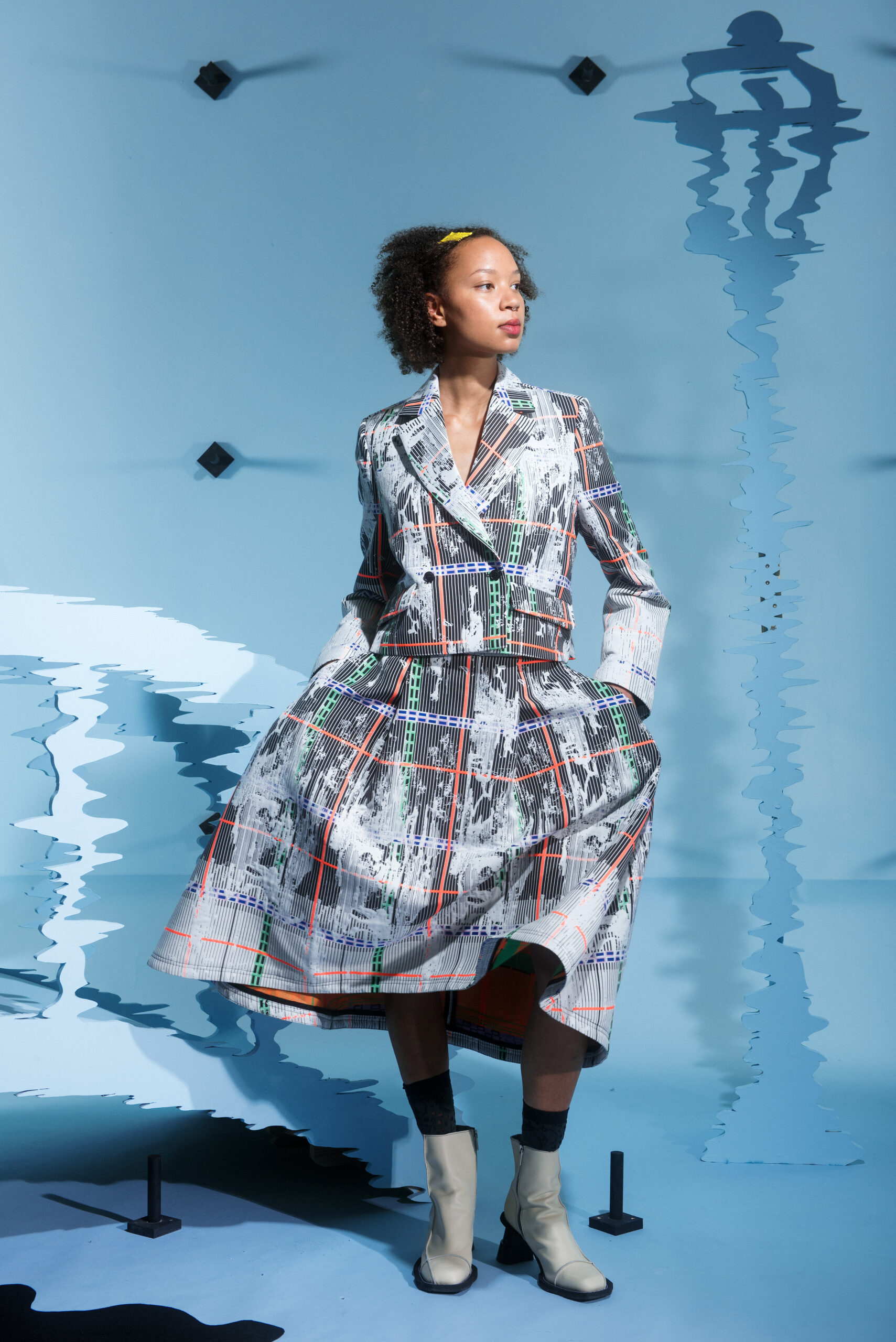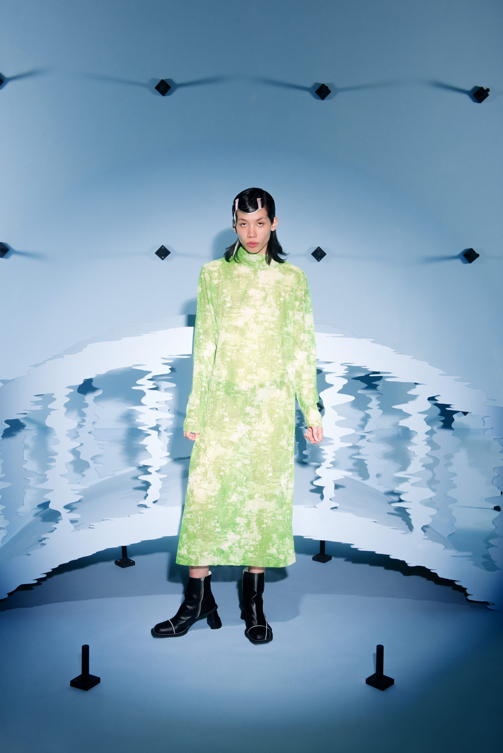 The collection’s color palette references the colors of nature and the manmade, showing the contrast between the calming of the blue and green with the noise of the orange.