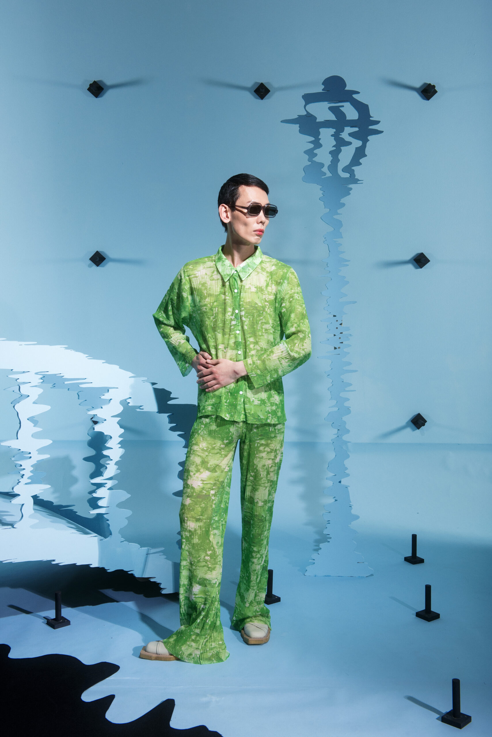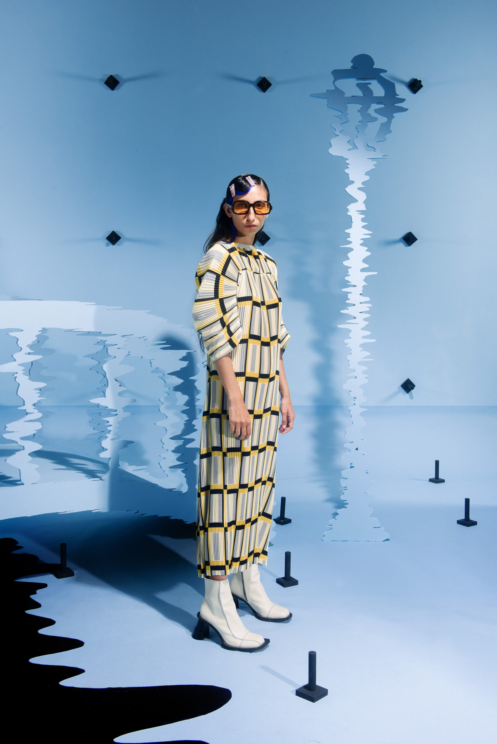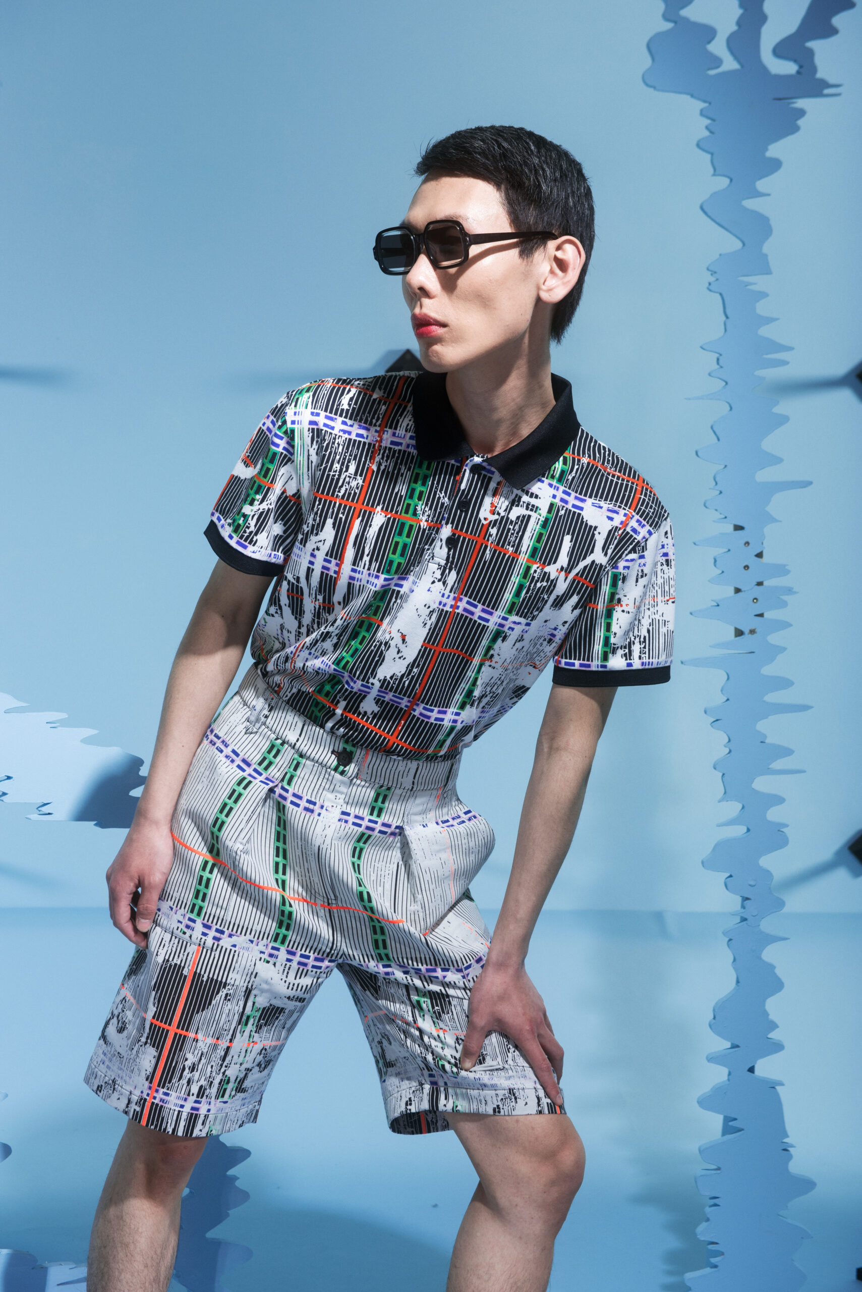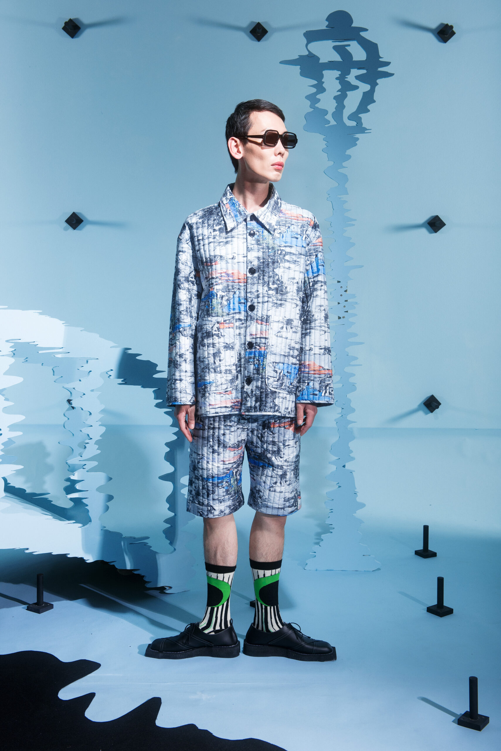 The collection’s color palette references the colors of nature and the manmade, showing the contrast between the calming of the blue and green with the noise of the orange.