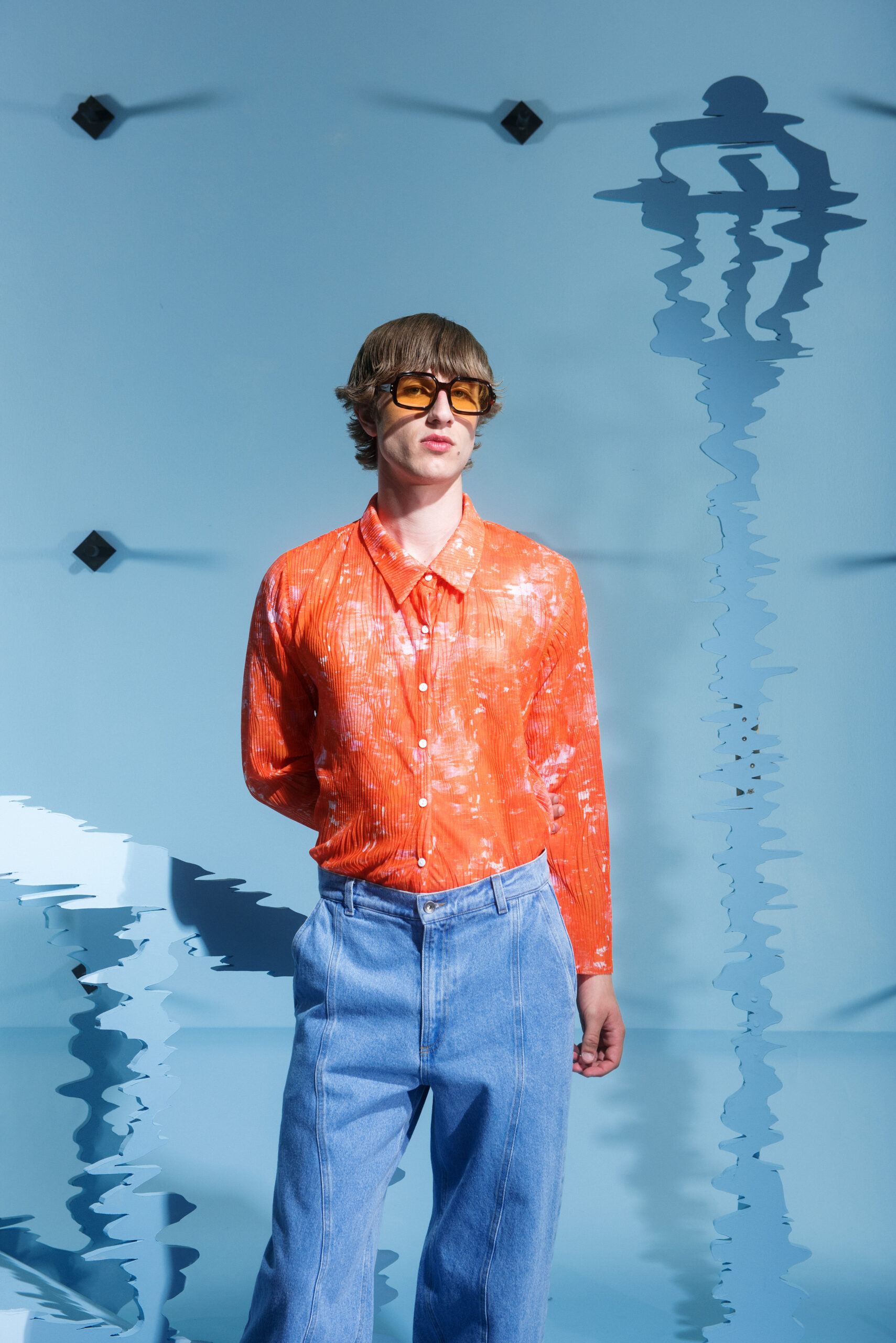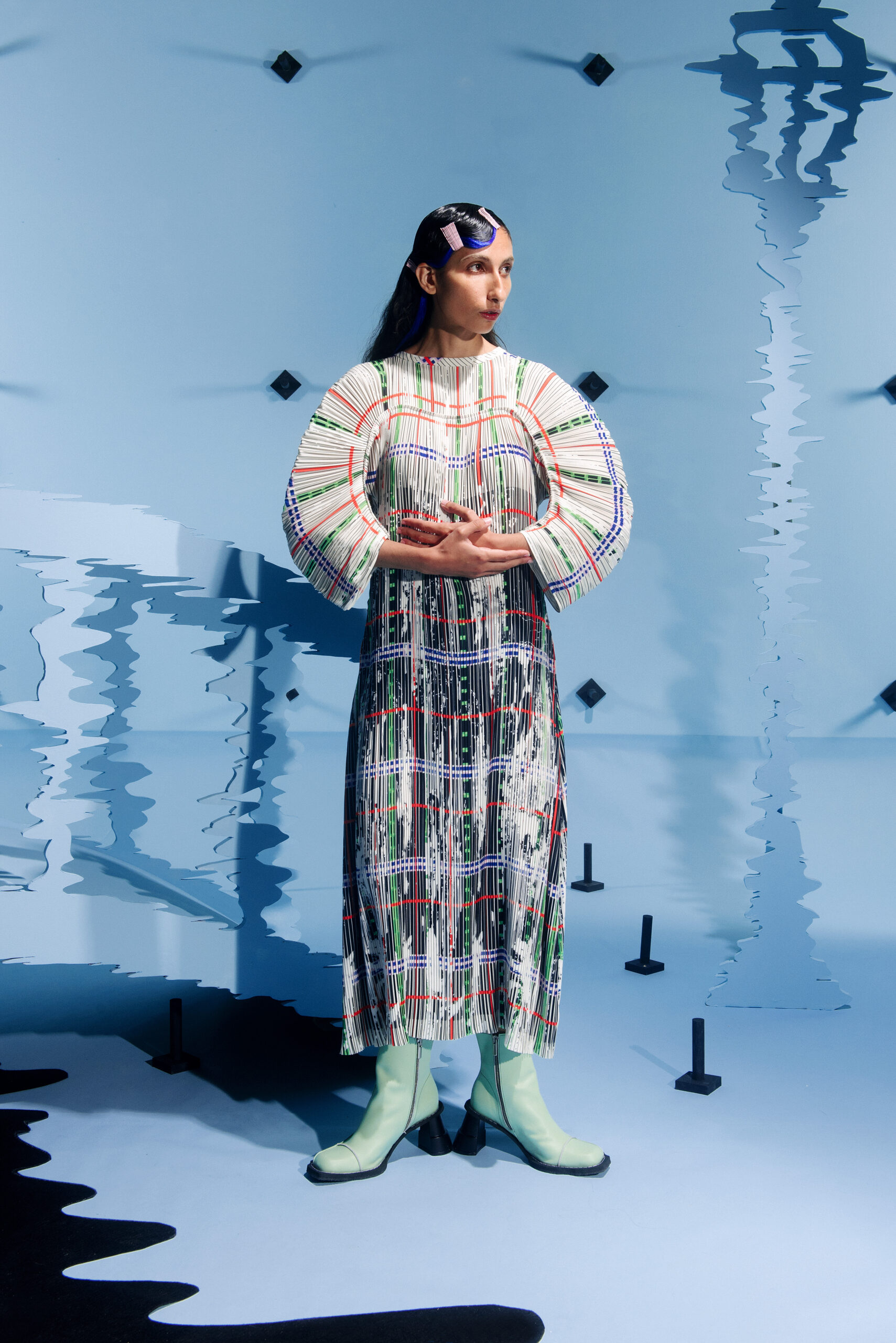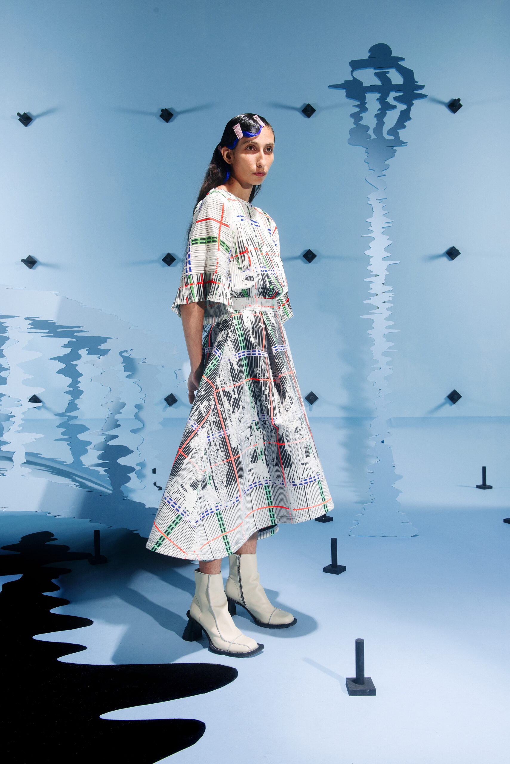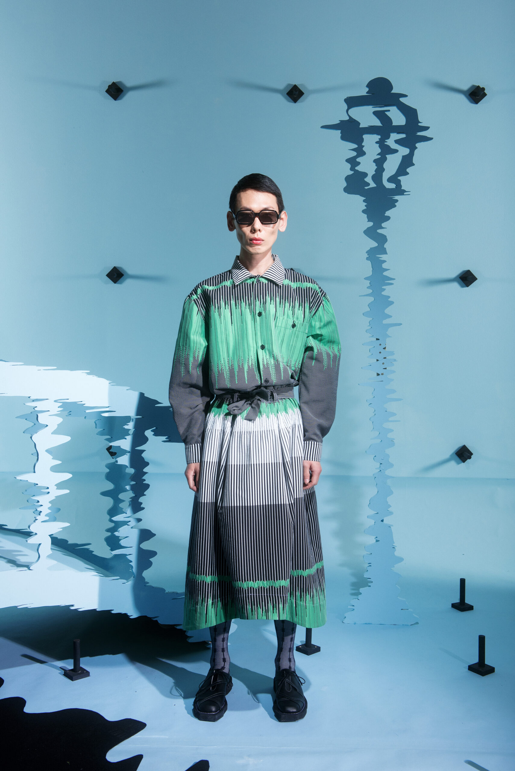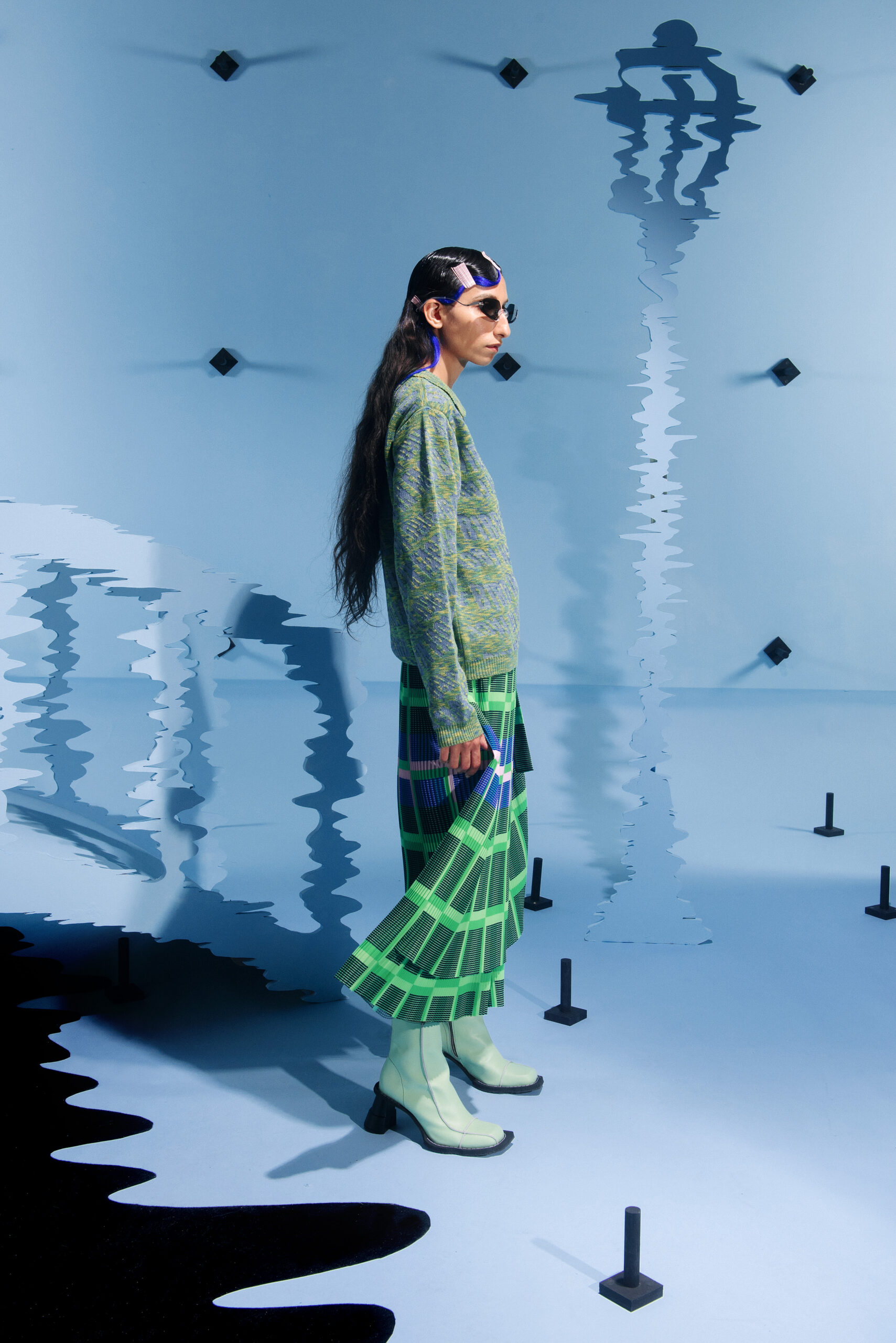 The collection’s color palette references the colors of nature and the manmade, showing the contrast between the calming of the blue and green with the noise of the orange.