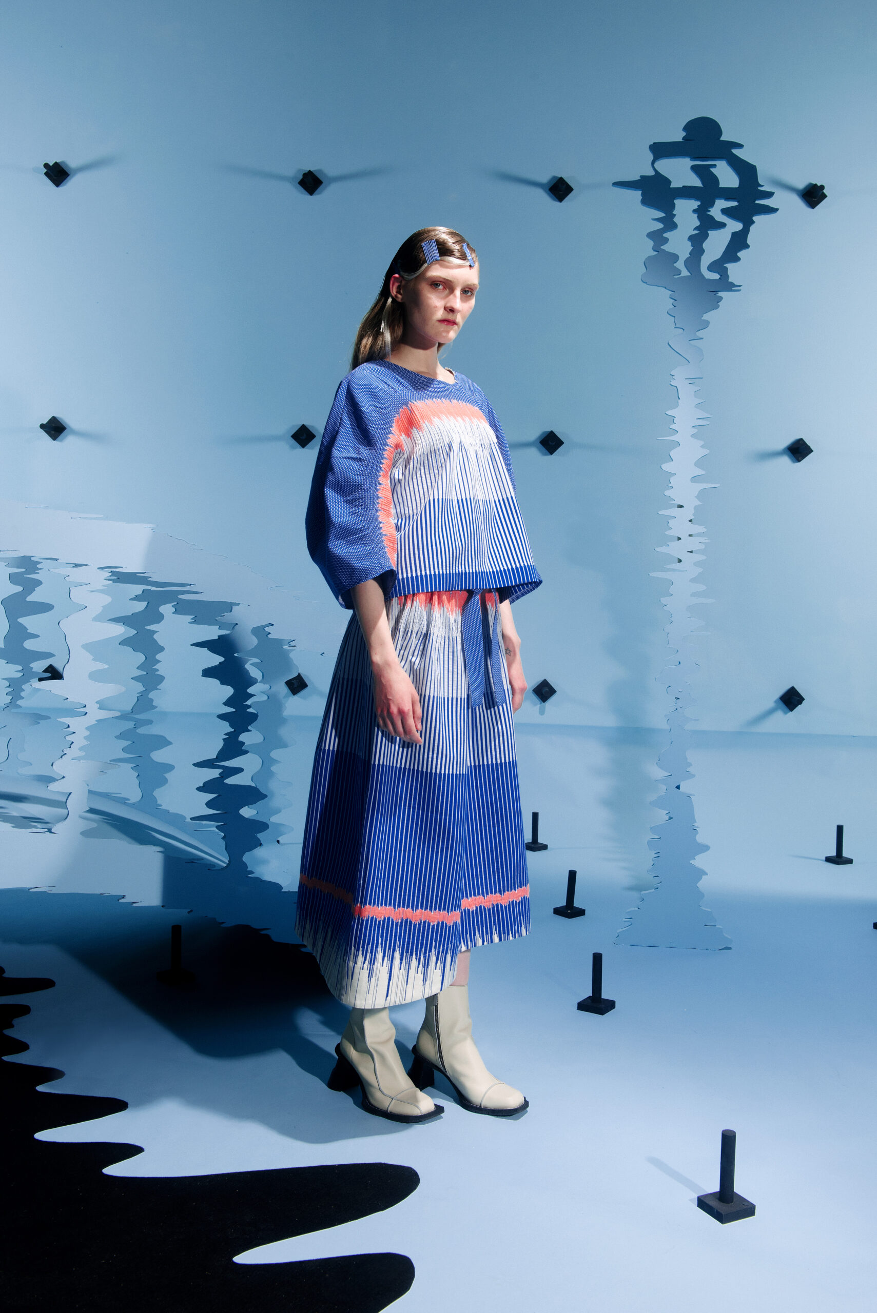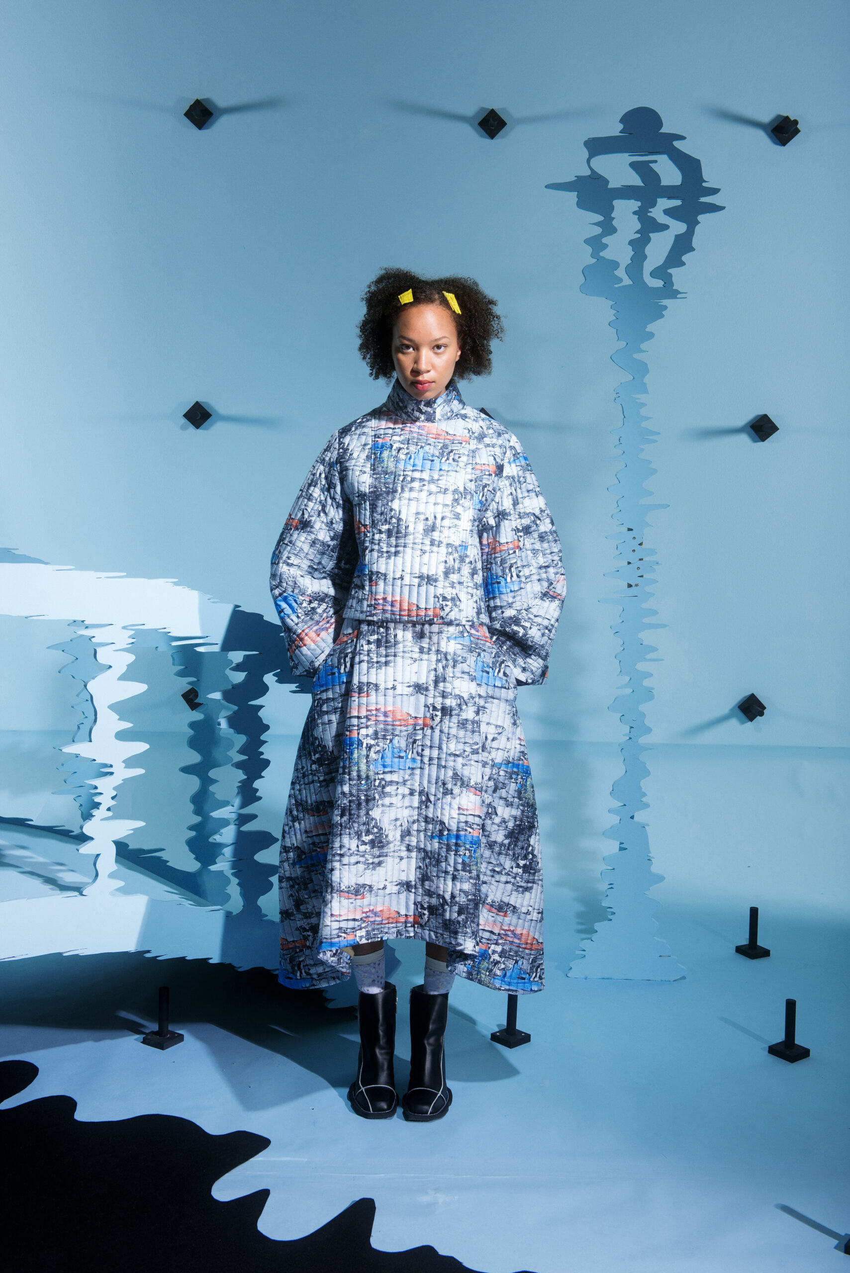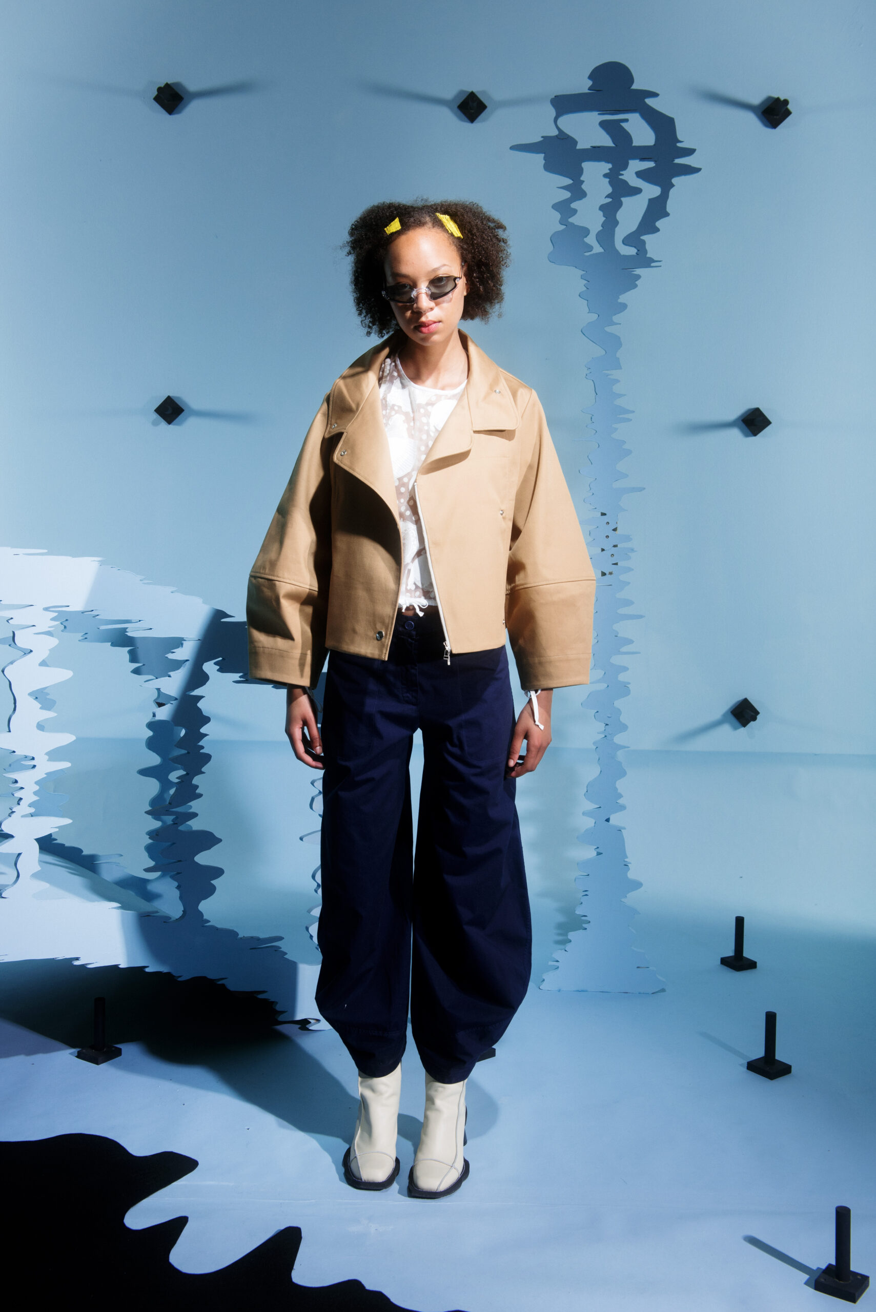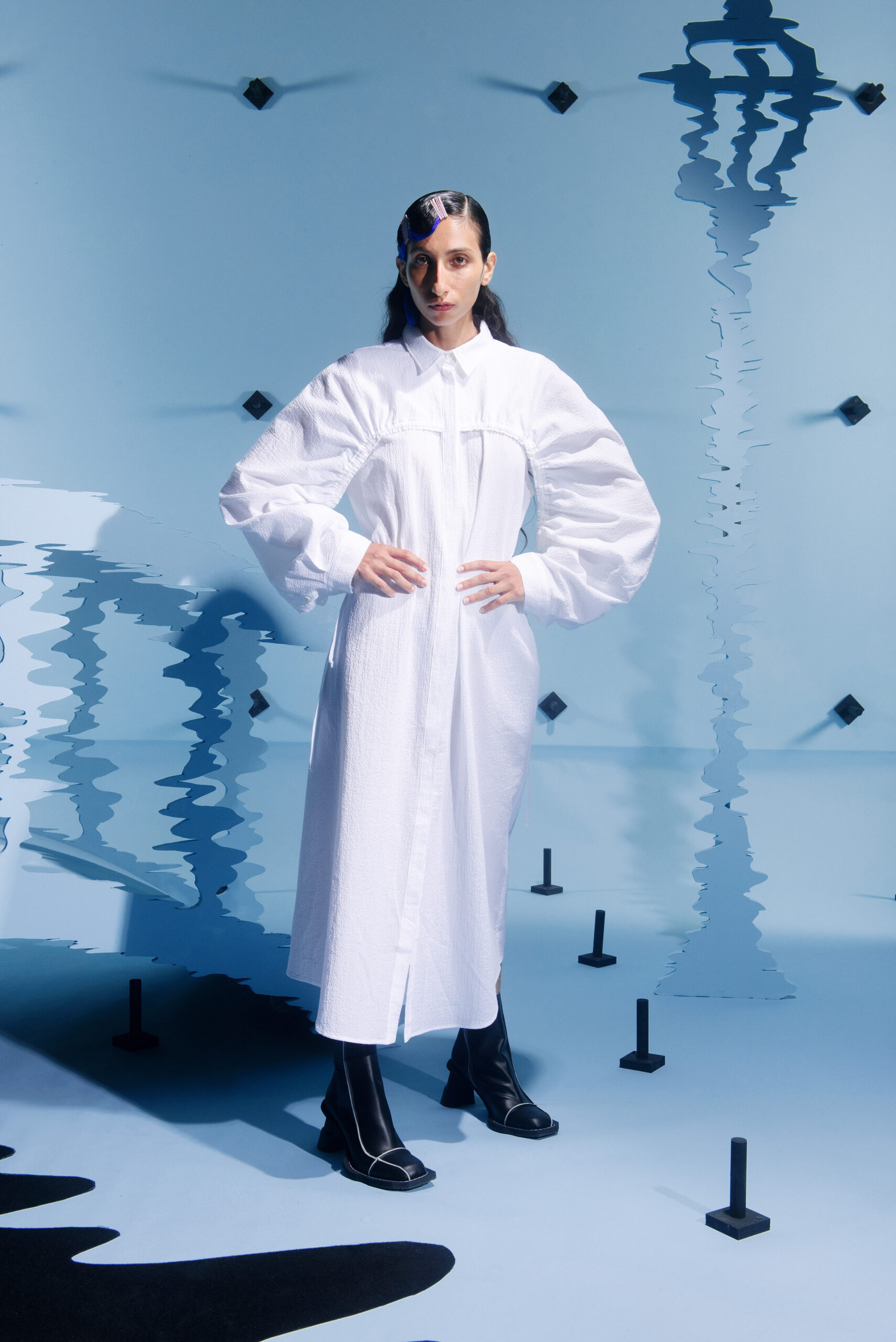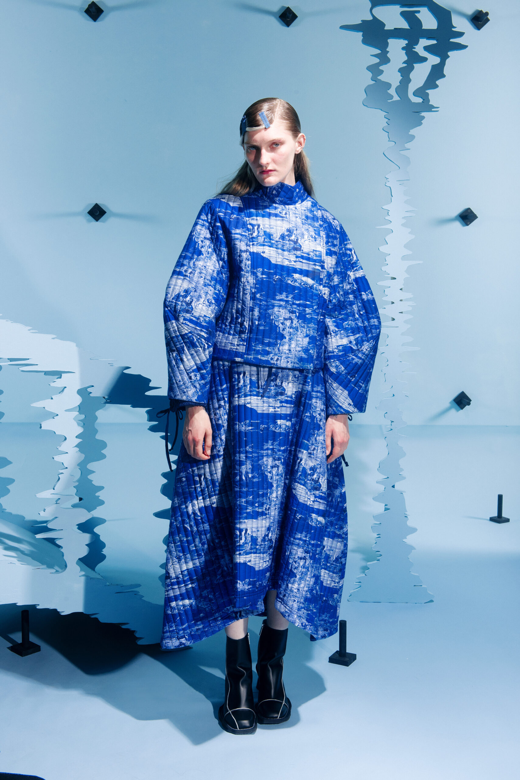 The silhouettes are inspired by the shapes and characteristics of bridges, where the body meets the construction when it arches and wraps itself around the human form. An homage to the hands that build – the collection reflects traces from the construction world in various elements, from silhouettes to details in the garments.
