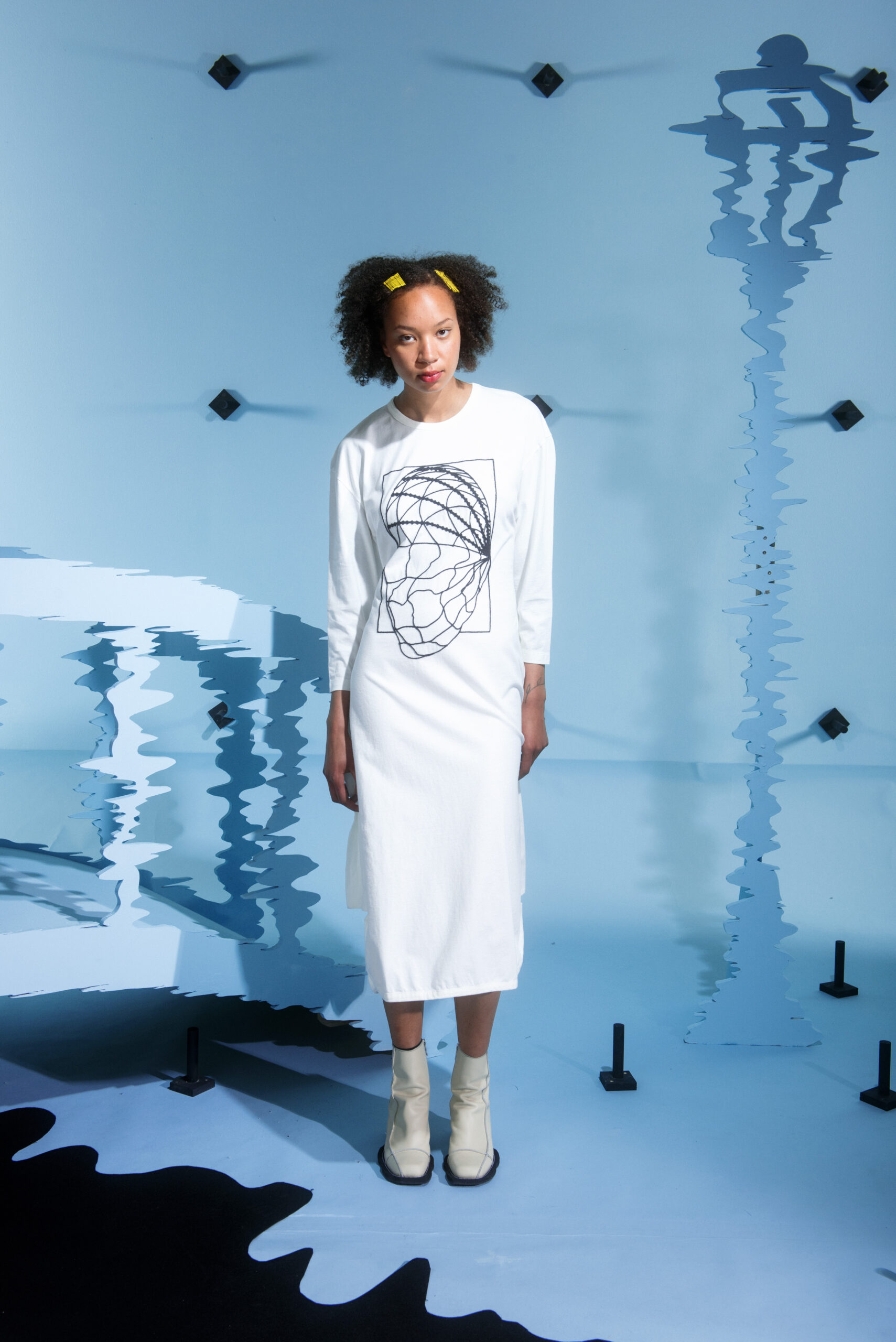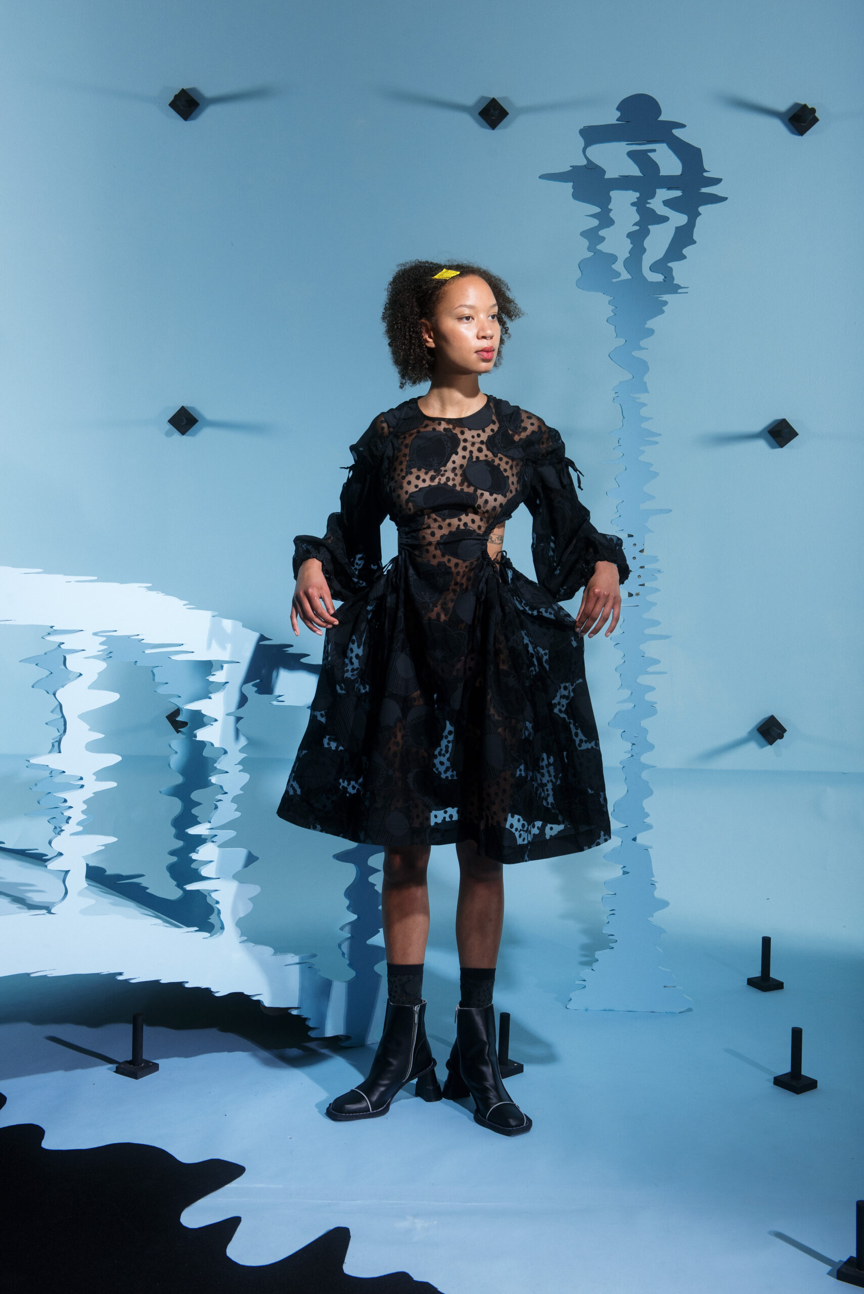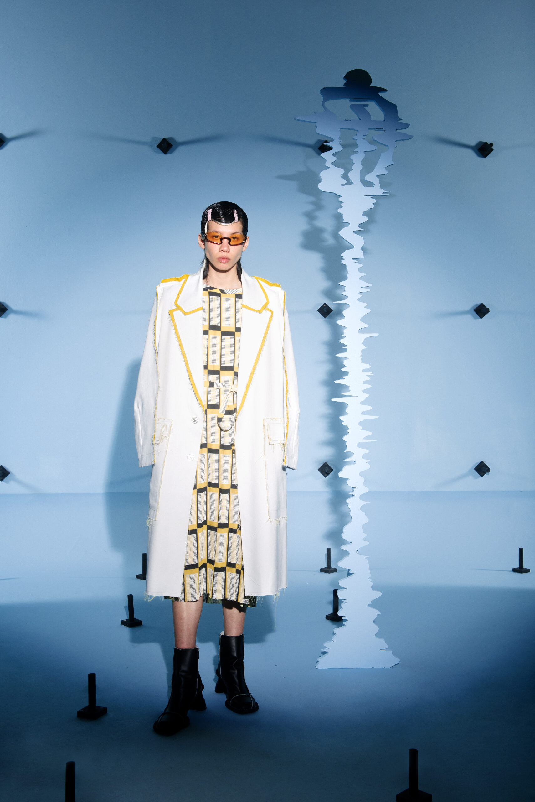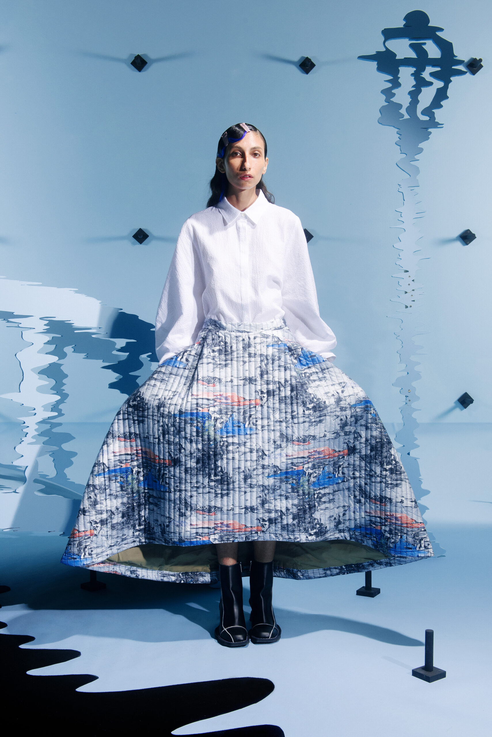 The silhouettes are inspired by the shapes and characteristics of bridges, where the body meets the construction when it arches and wraps itself around the human form. An homage to the hands that build – the collection reflects traces from the construction world in various elements, from silhouettes to details in the garments.