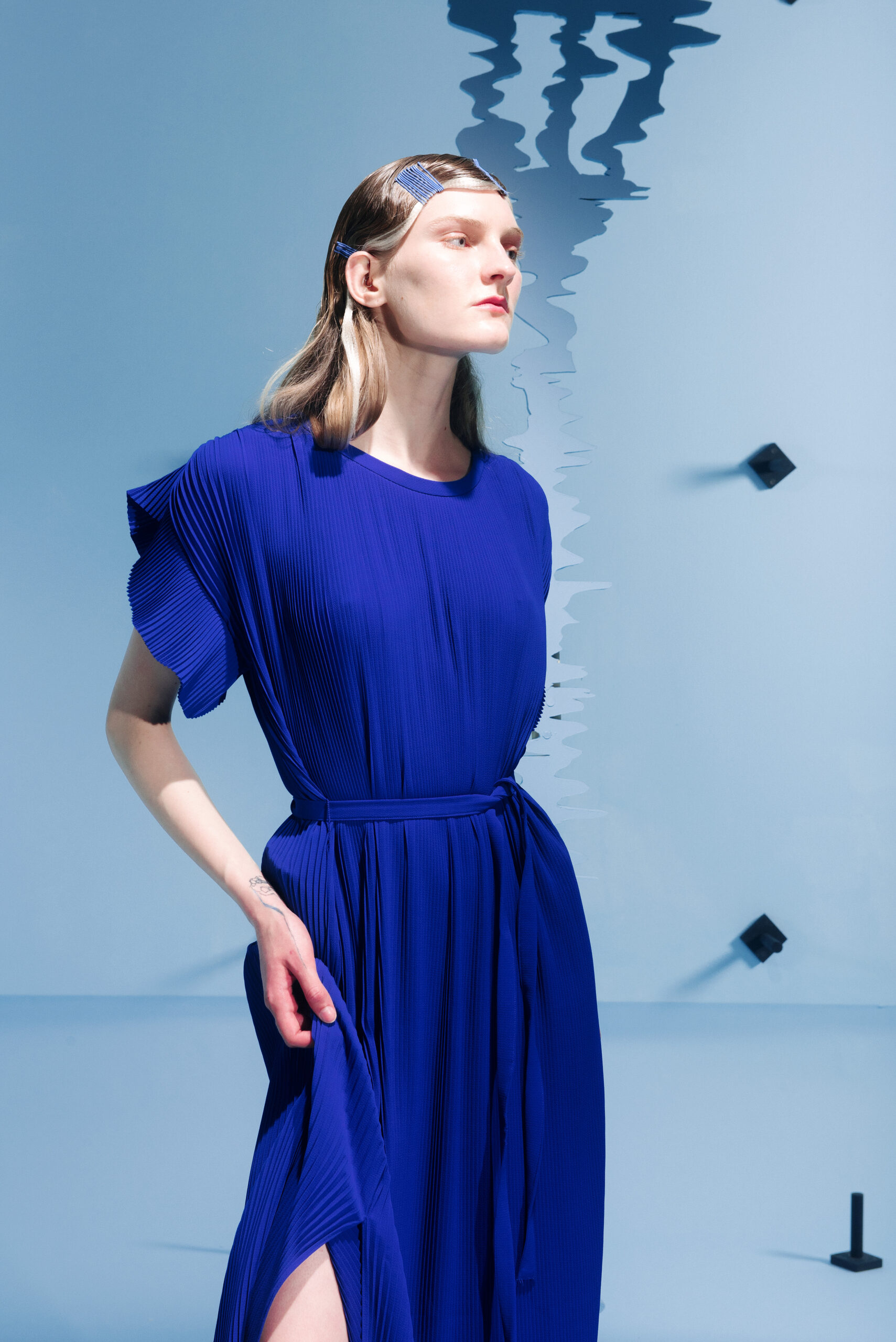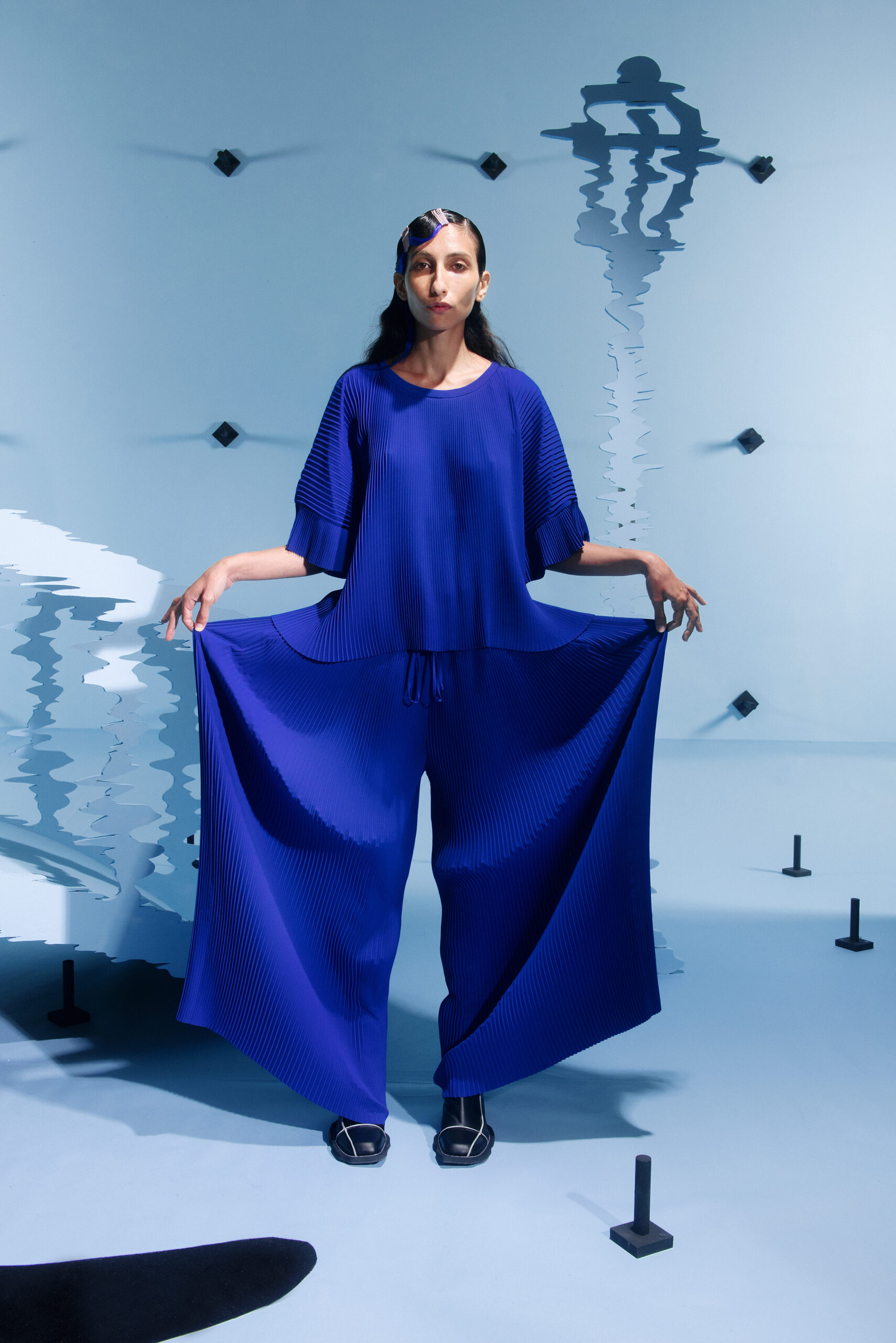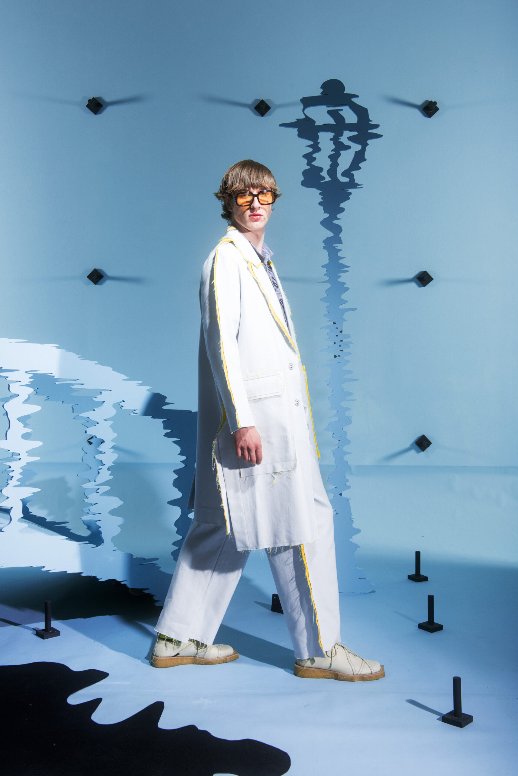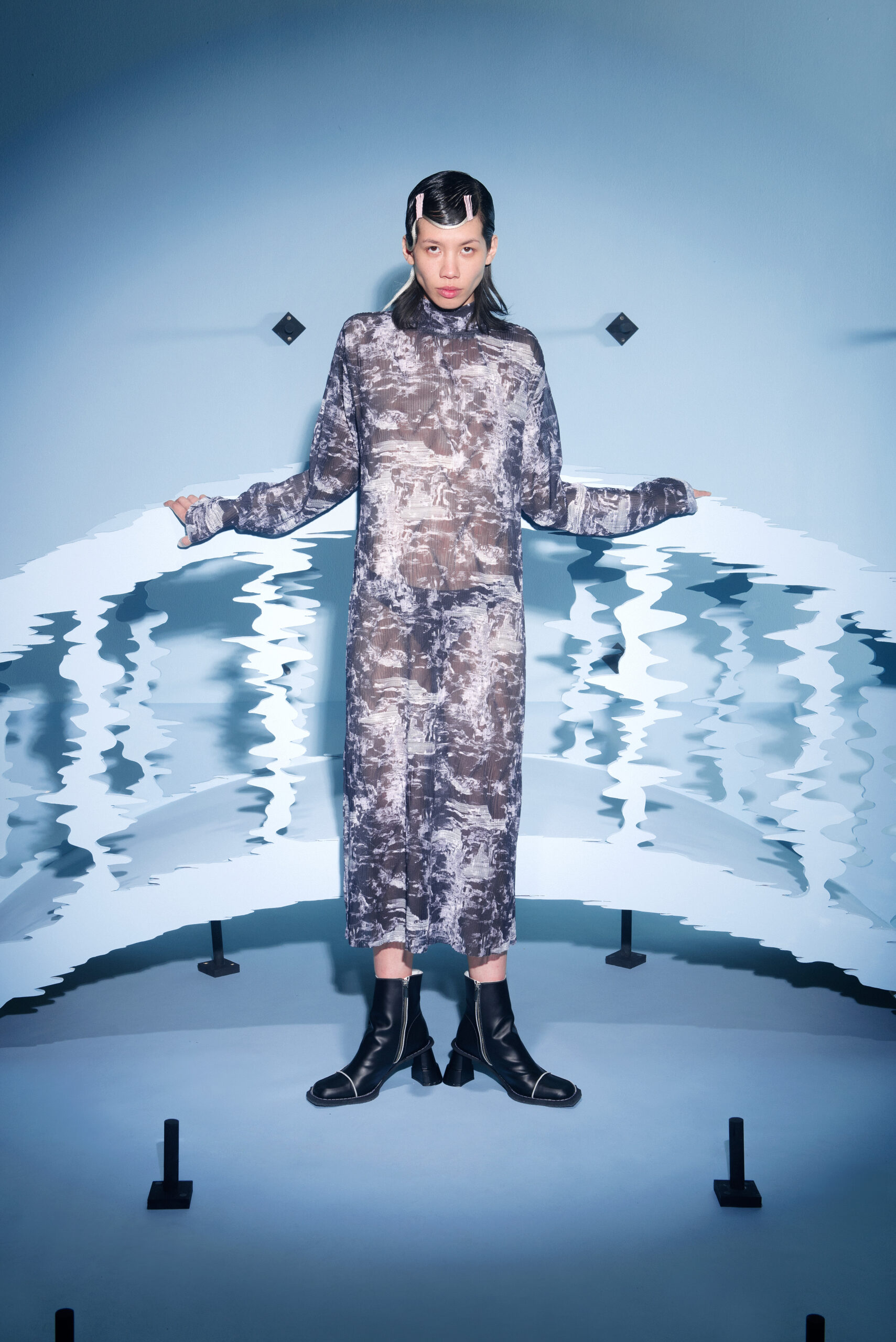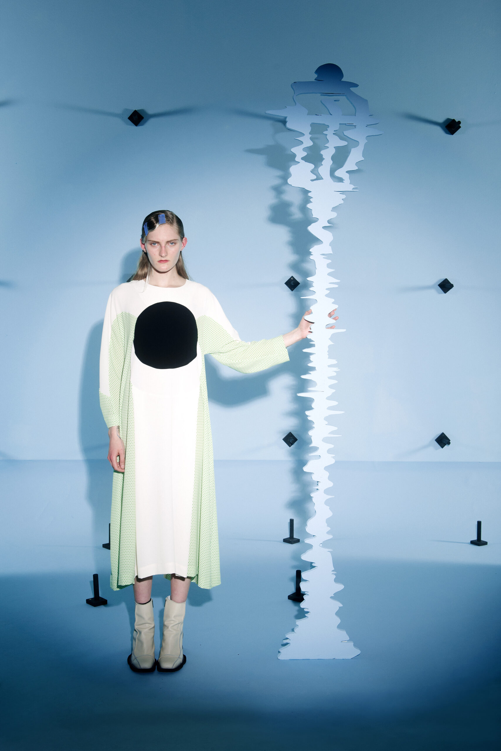The silhouettes are inspired by the shapes and characteristics of bridges, where the body meets the construction when it arches and wraps itself around the human form. An homage to the hands that build – the collection reflects traces from the construction world in various elements, from silhouettes to details in the garments.