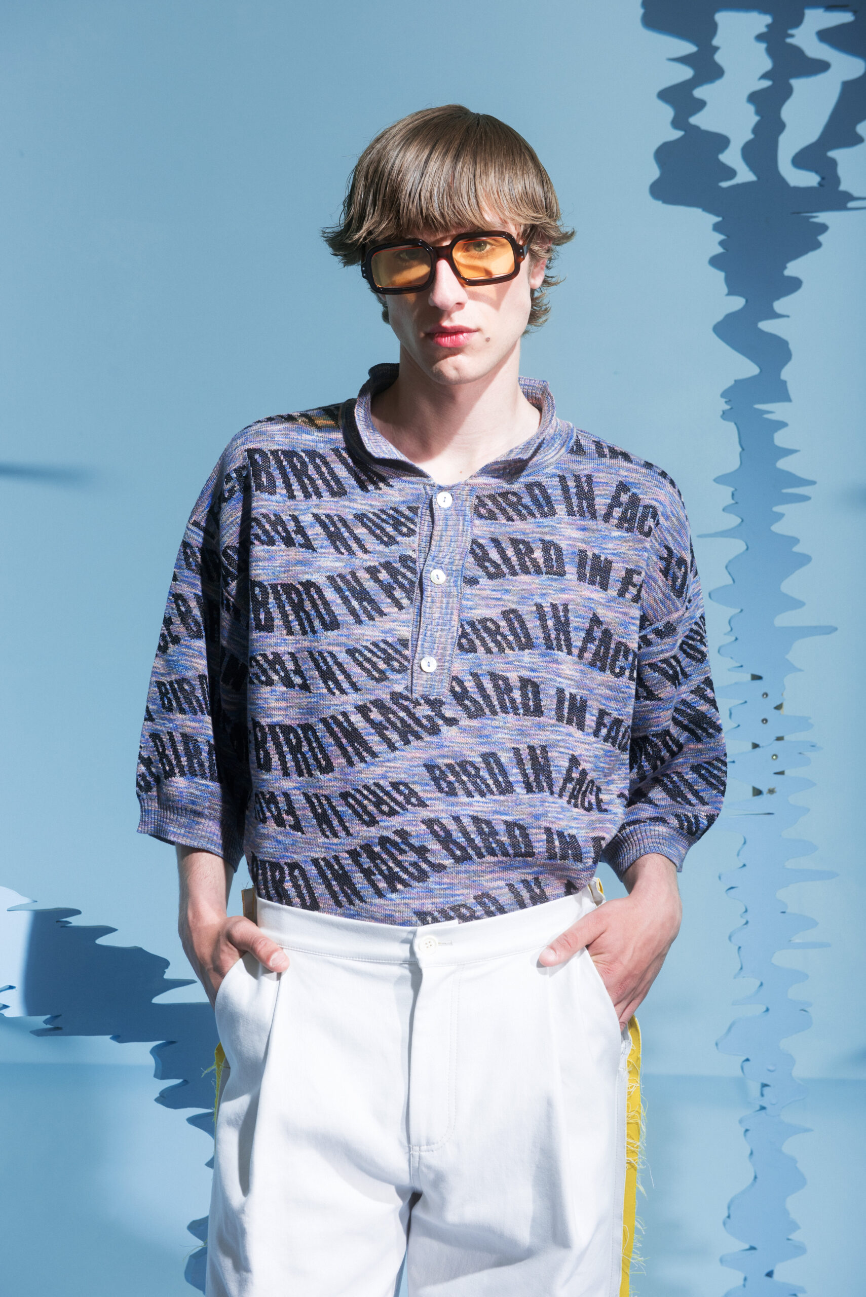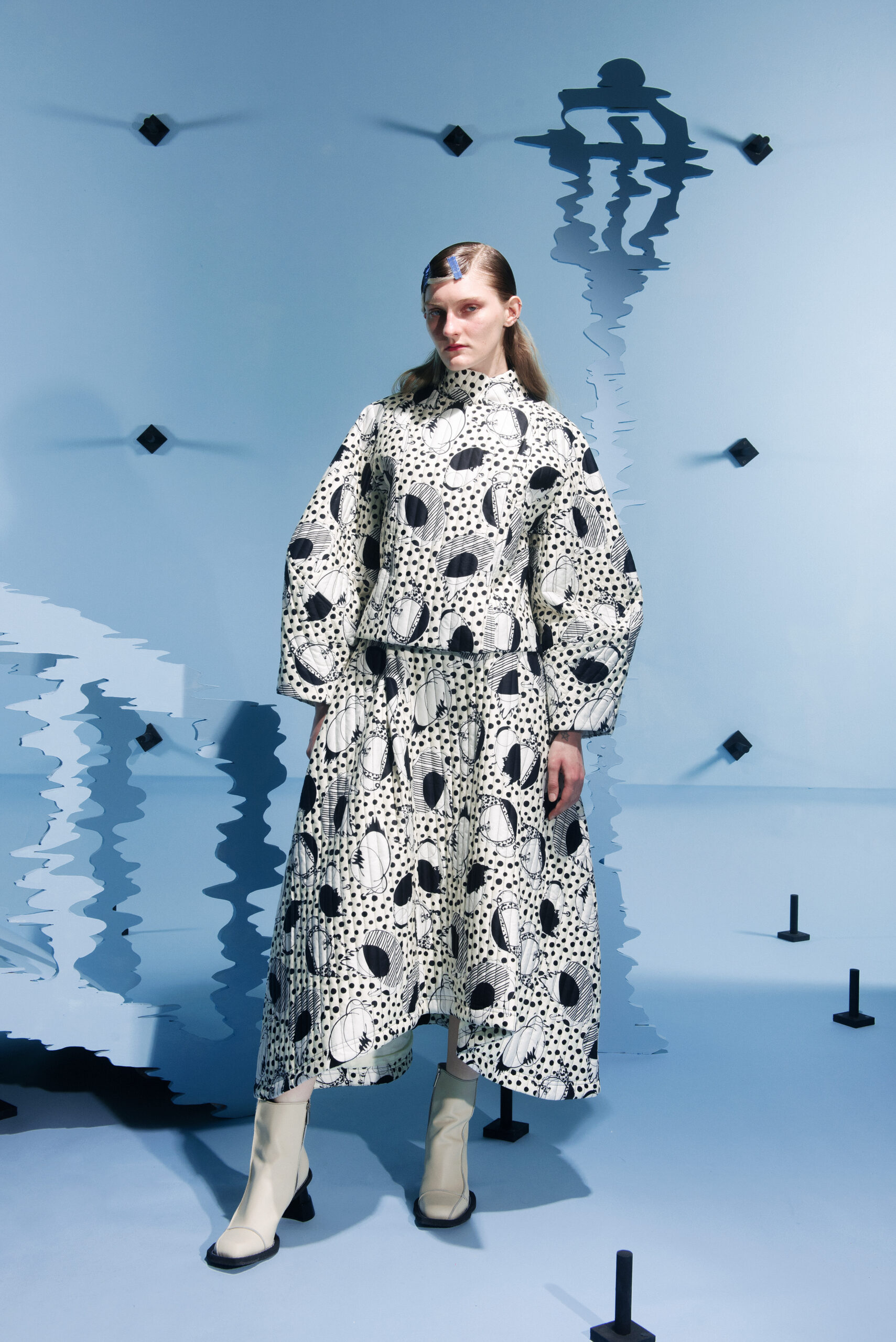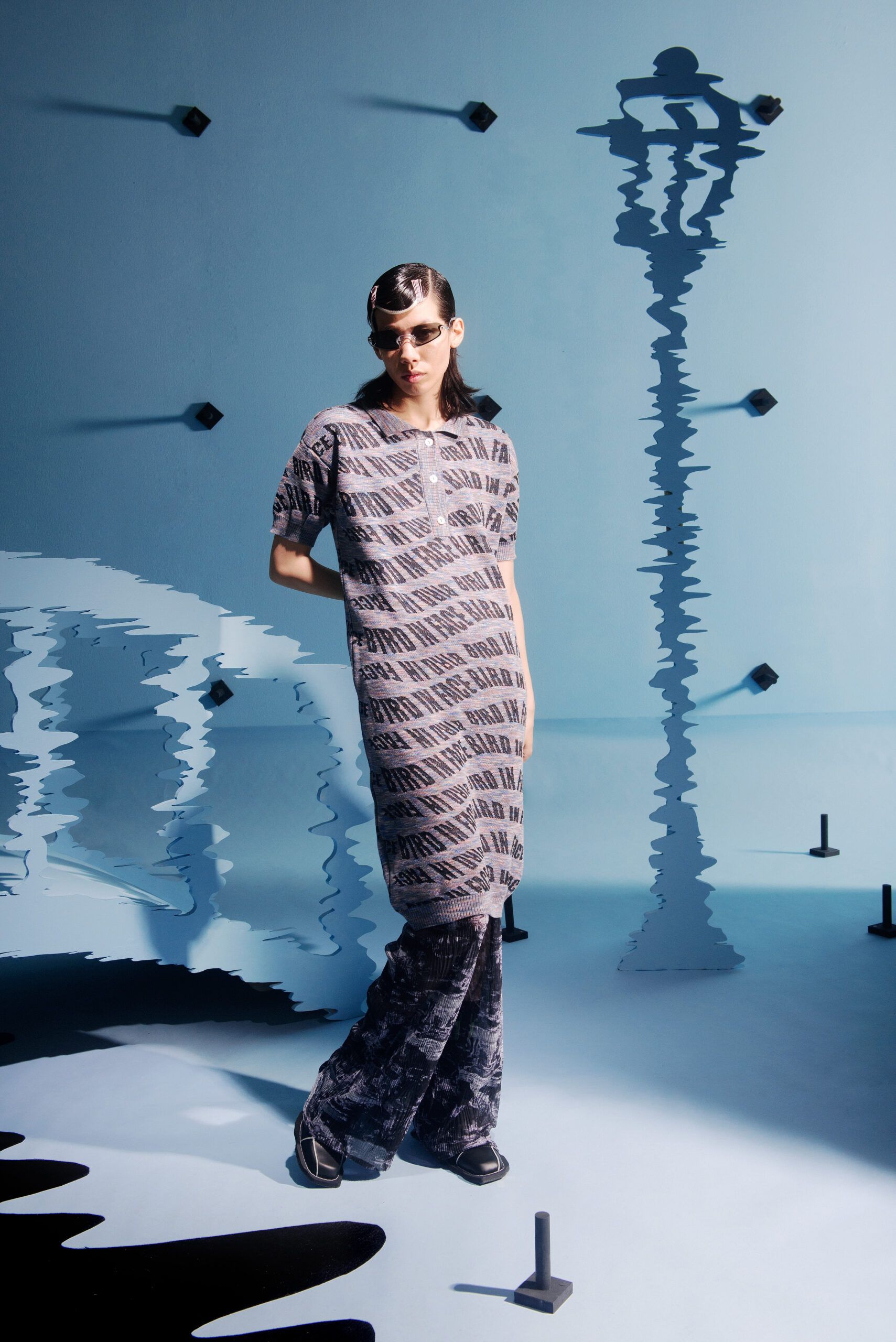 The prints take their inspiration from modular systems and distorted motives, using different scales to show abstract sensations or creating moving scenarios that differ from romantic to distressed. The birds are flying in between the collection, making the pants, dresses, shirts and jackets their nest.