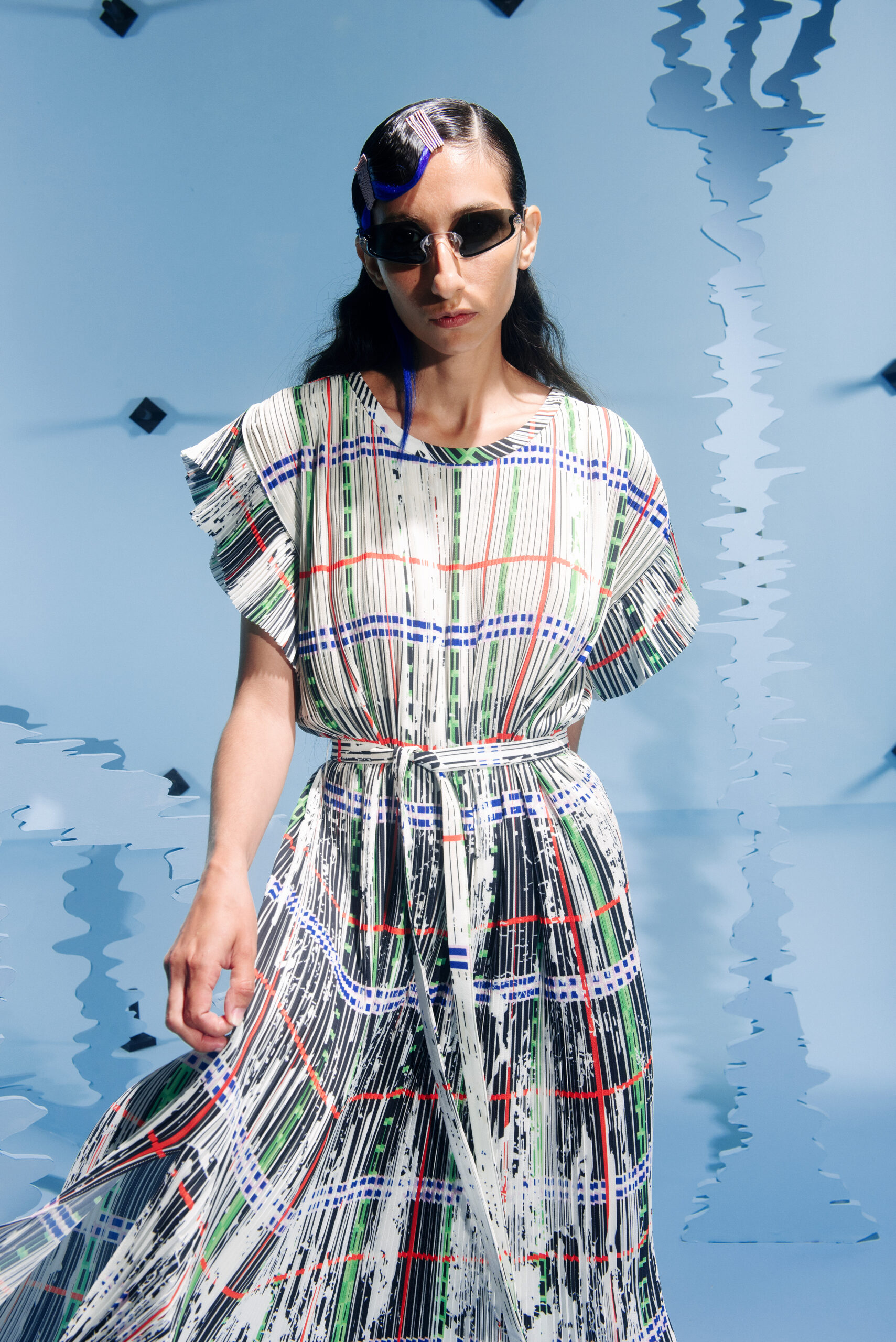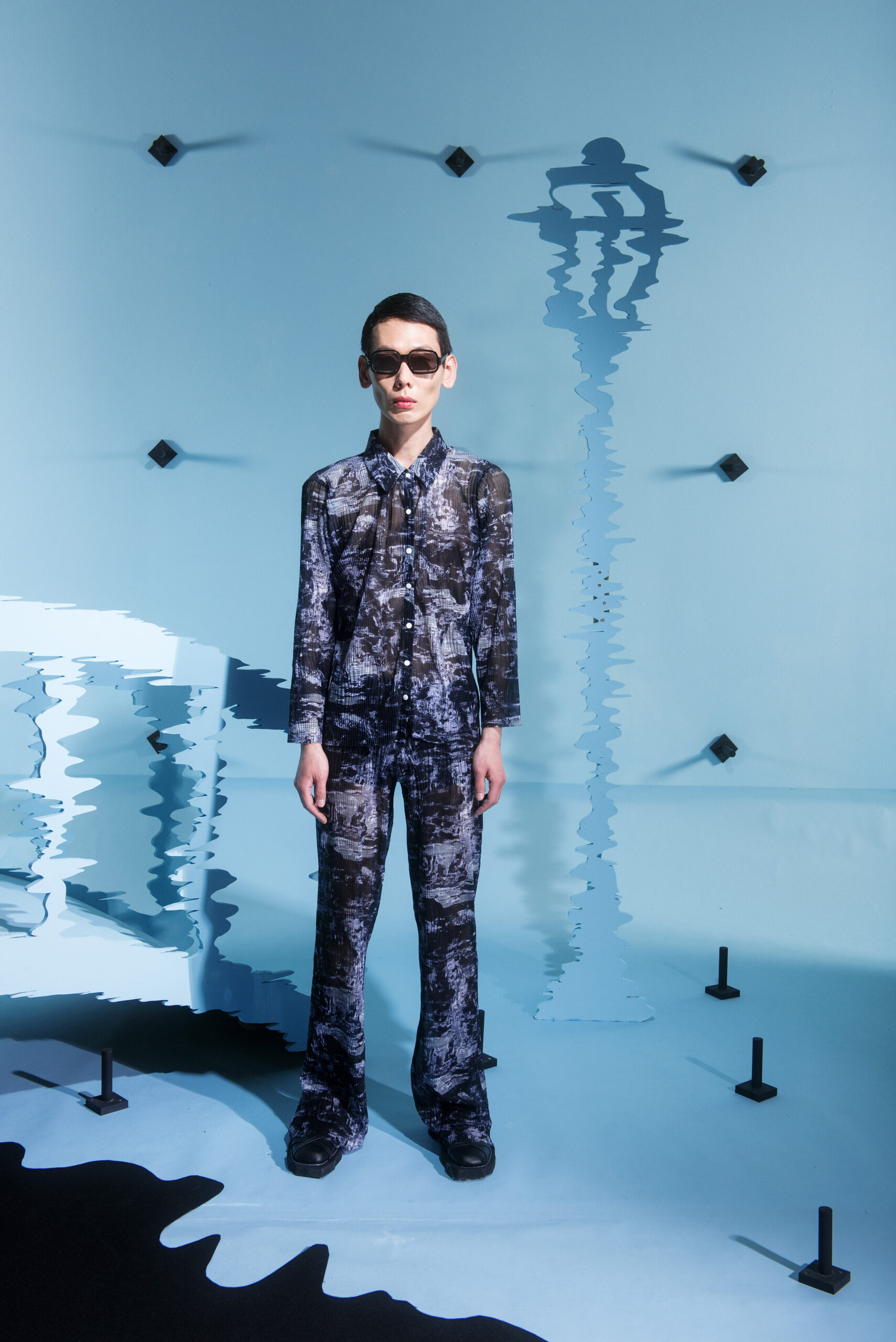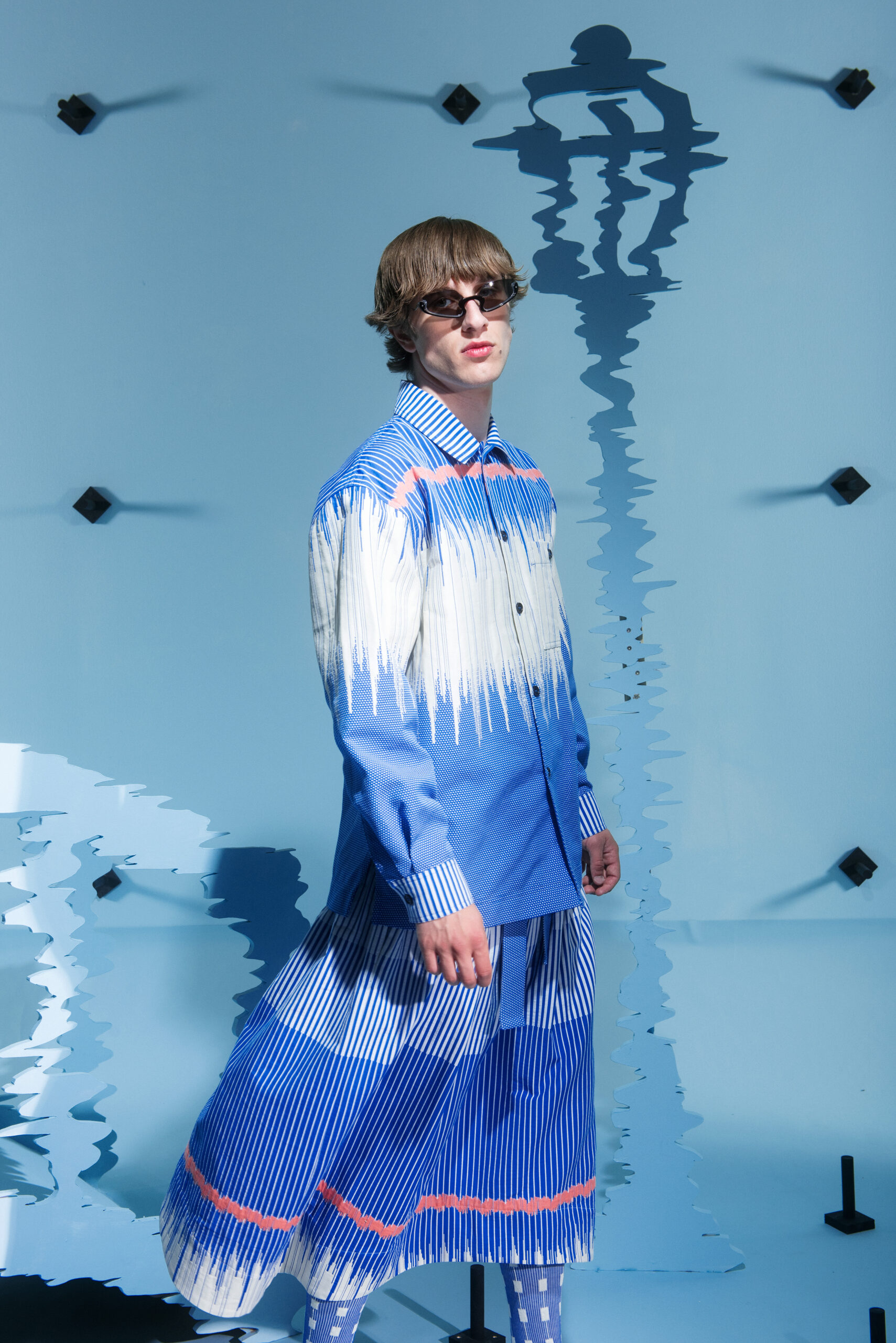 The prints take their inspiration from modular systems and distorted motives, using different scales to show abstract sensations or creating moving scenarios that differ from romantic to distressed. The birds are flying in between the collection, making the pants, dresses, shirts and jackets their nest.