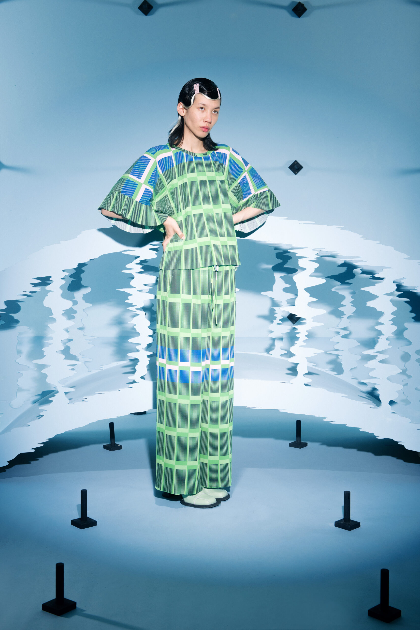 Henrik Vibskov presents his SS23 collection with a video, inviting the viewer into a world of mystique and contrasts. Following the sound of the choir, the storyline takes the viewer through the different lives of different bridges that created the atmosphere for this collection. The scenes move in and out of the ‘build’ universe, containing bright colors and artificial life, and the real world of dimmed light and abandoned ground.