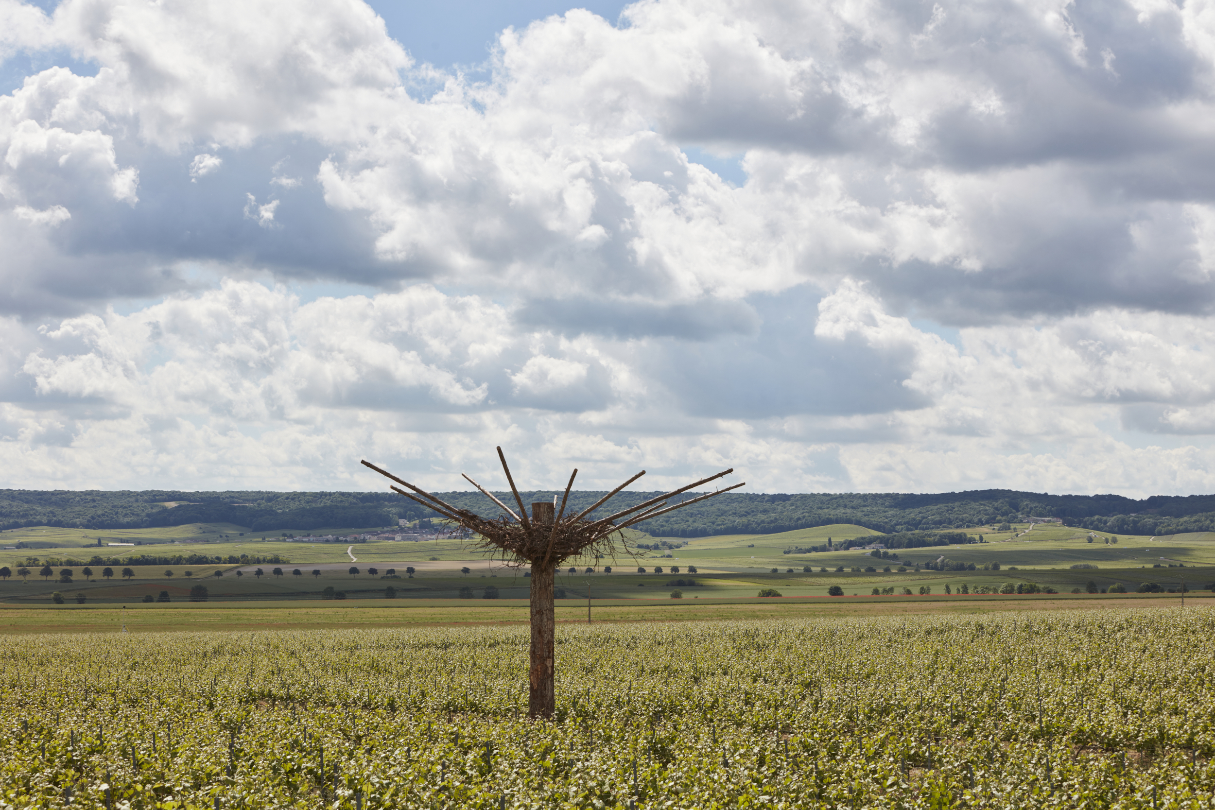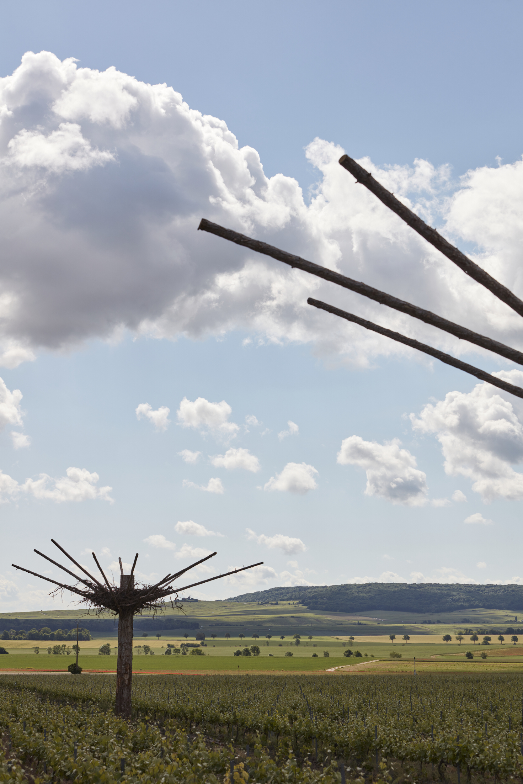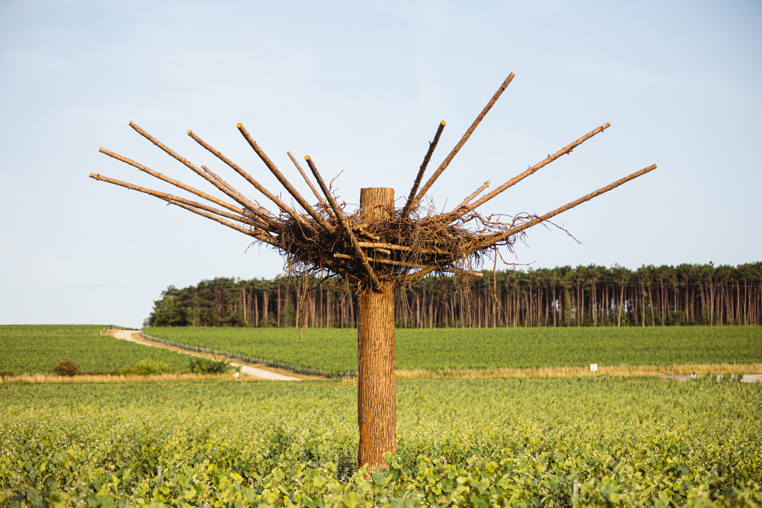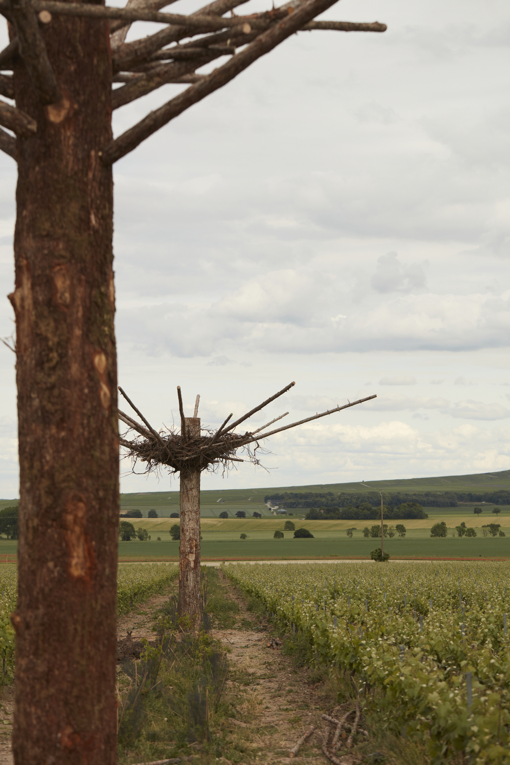 NILS-UDO a utilisé pour les construire les ceps et sarments retirés du vignoble par les équipes de la Maison Ruinart afin de fragmenter d’immenses parcelles pour leur redonner une taille bocagère et favoriser la biodiversité. Constitués d’un tronc en chêne et de pins en en guise de branches, ces HABITATS forment des nids et ne comportent aucun clou ni aucune fixation métallique.