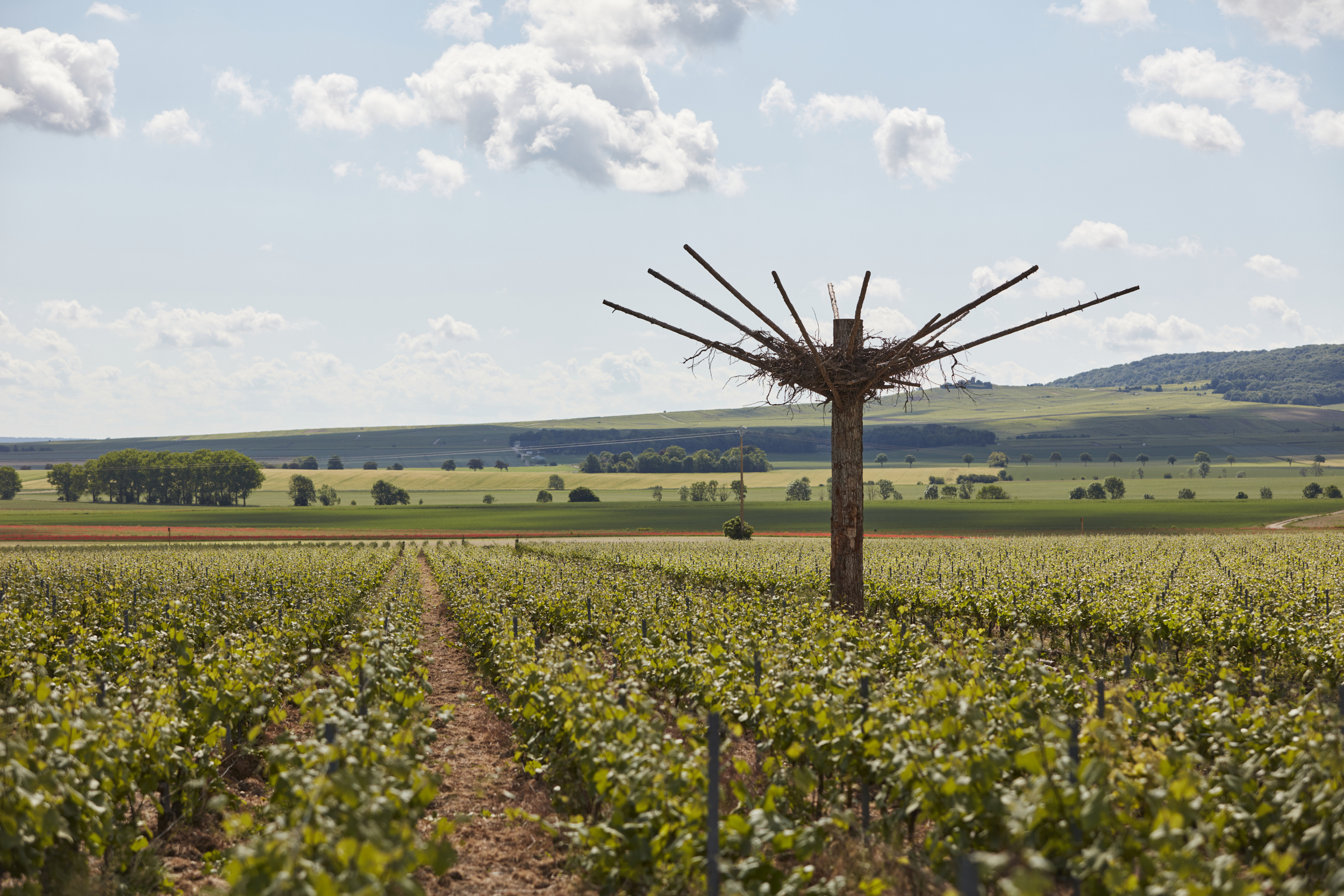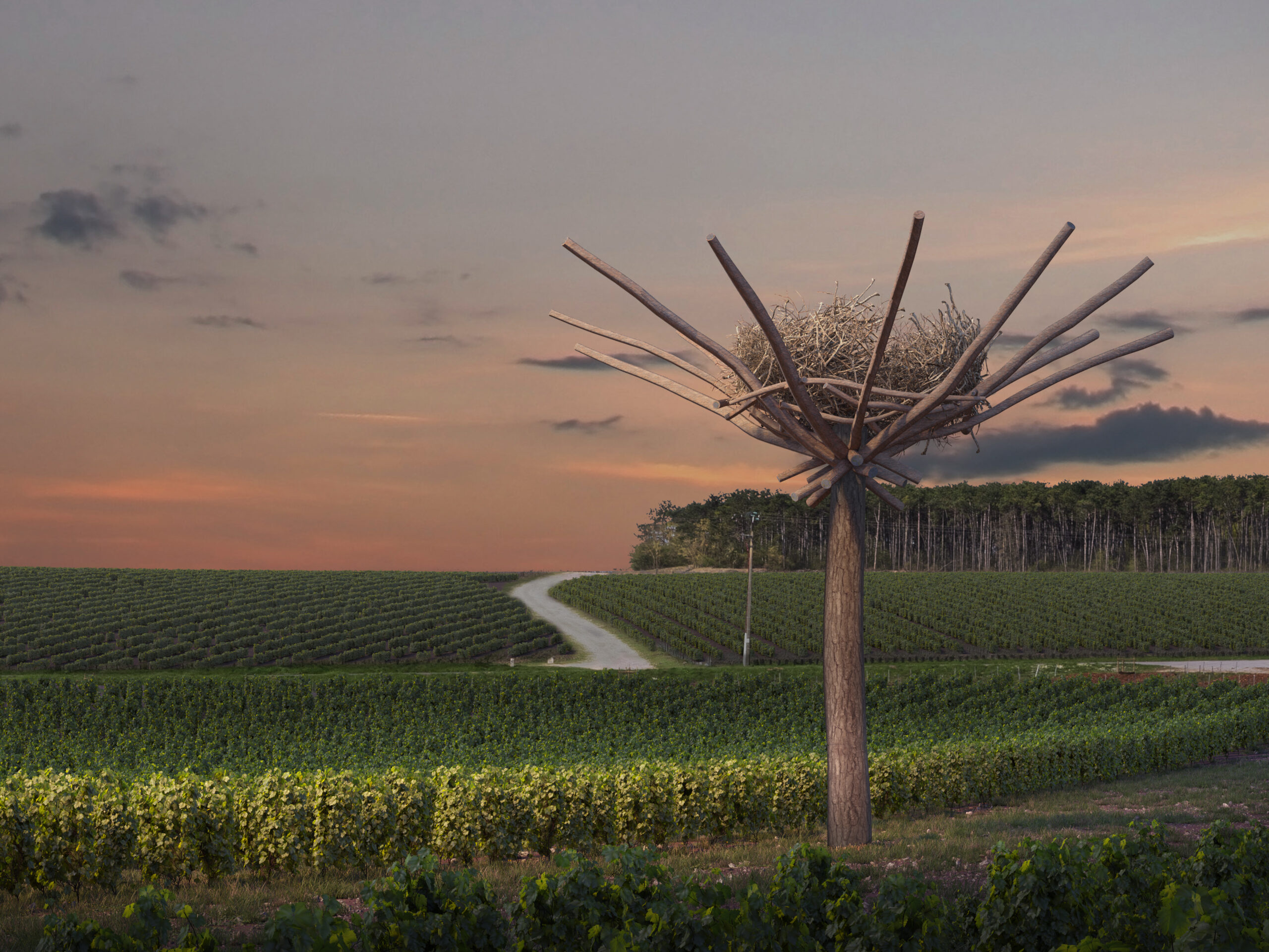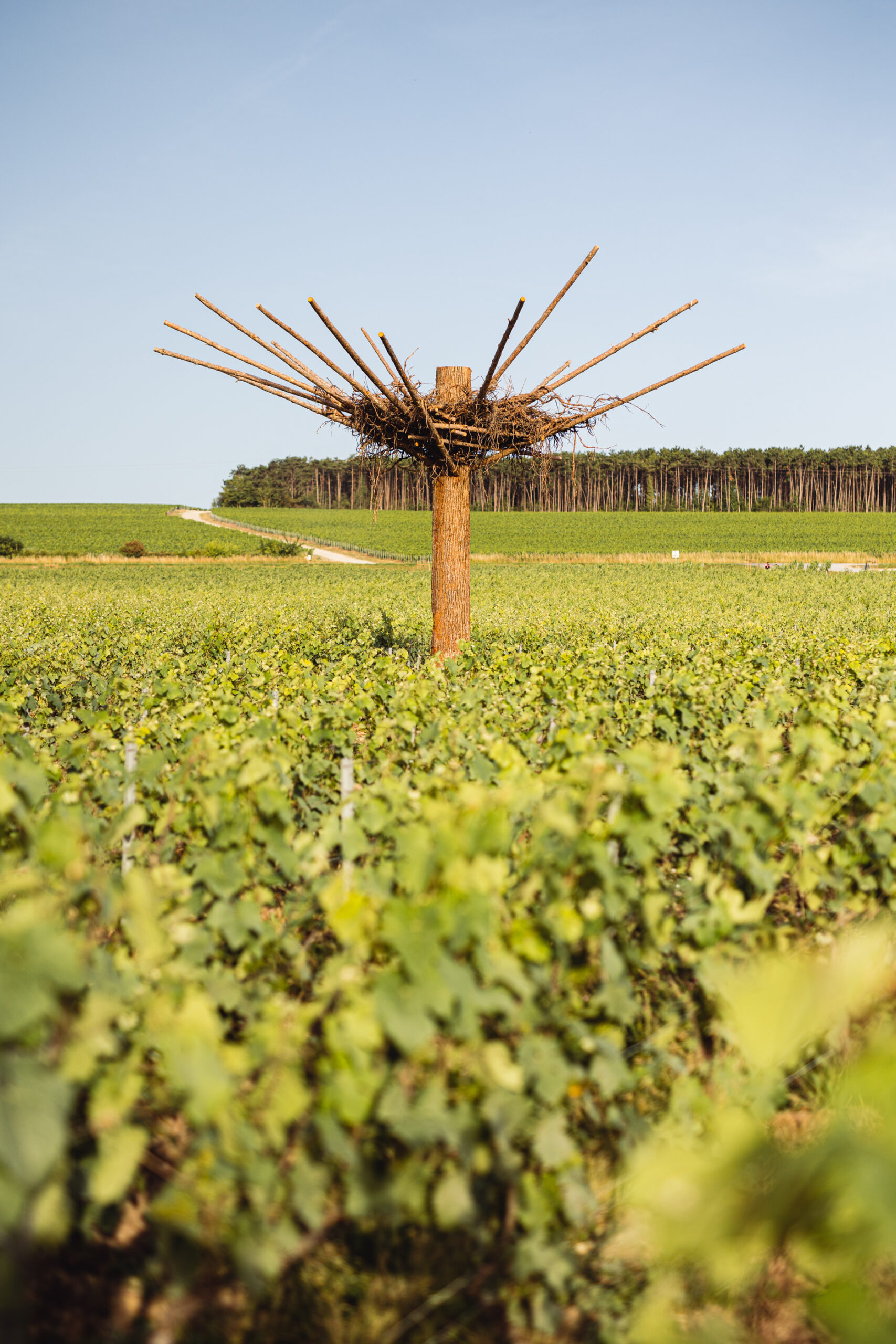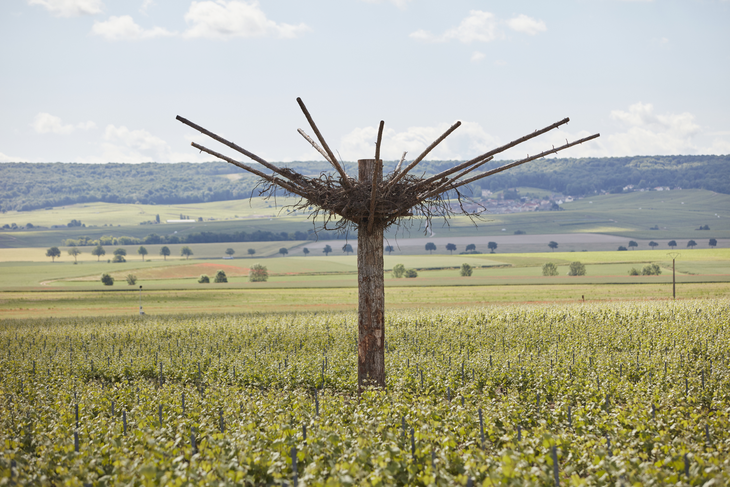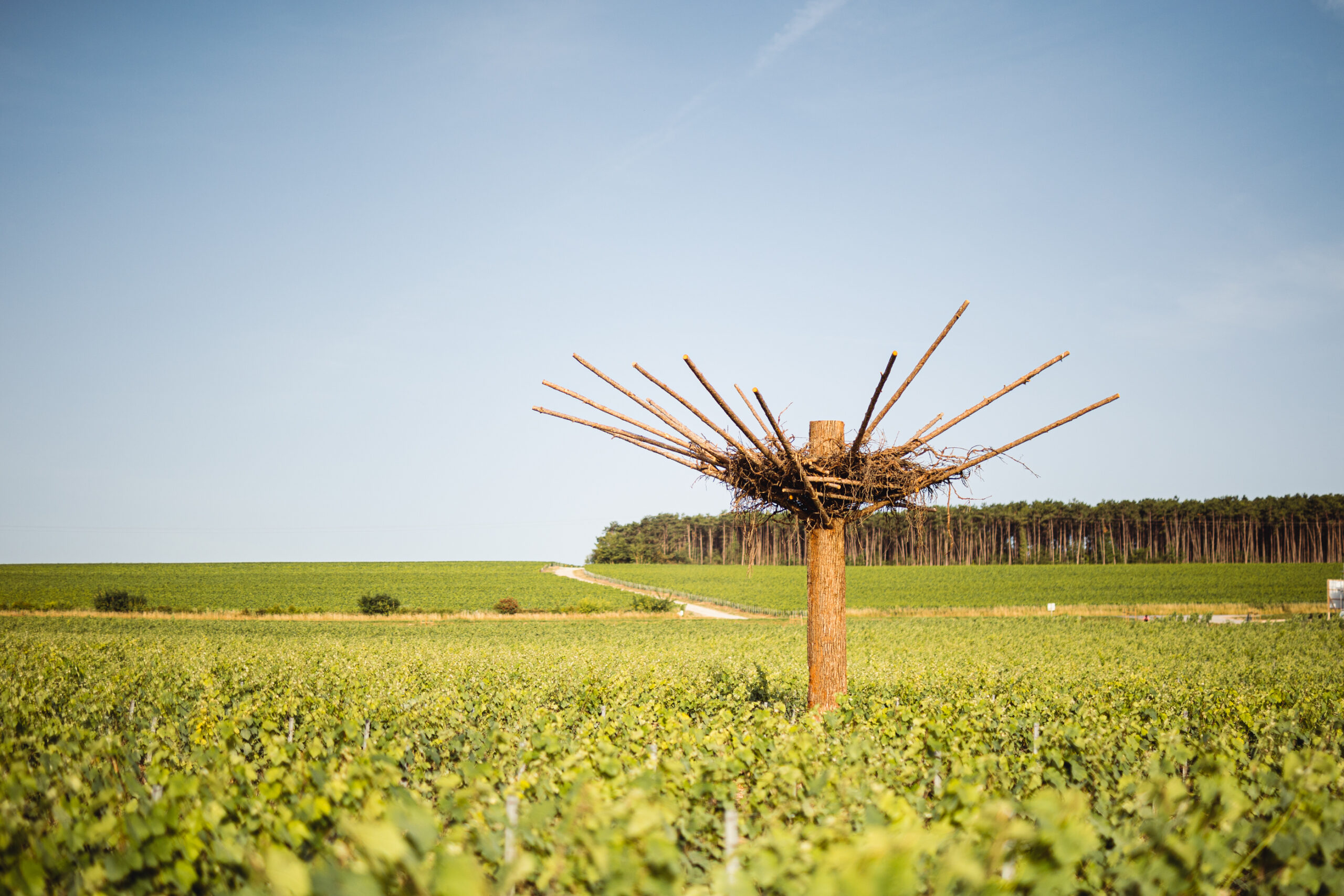 NILS-UDO a utilisé pour les construire les ceps et sarments retirés du vignoble par les équipes de la Maison Ruinart afin de fragmenter d’immenses parcelles pour leur redonner une taille bocagère et favoriser la biodiversité. Constitués d’un tronc en chêne et de pins en en guise de branches, ces HABITATS forment des nids et ne comportent aucun clou ni aucune fixation métallique.