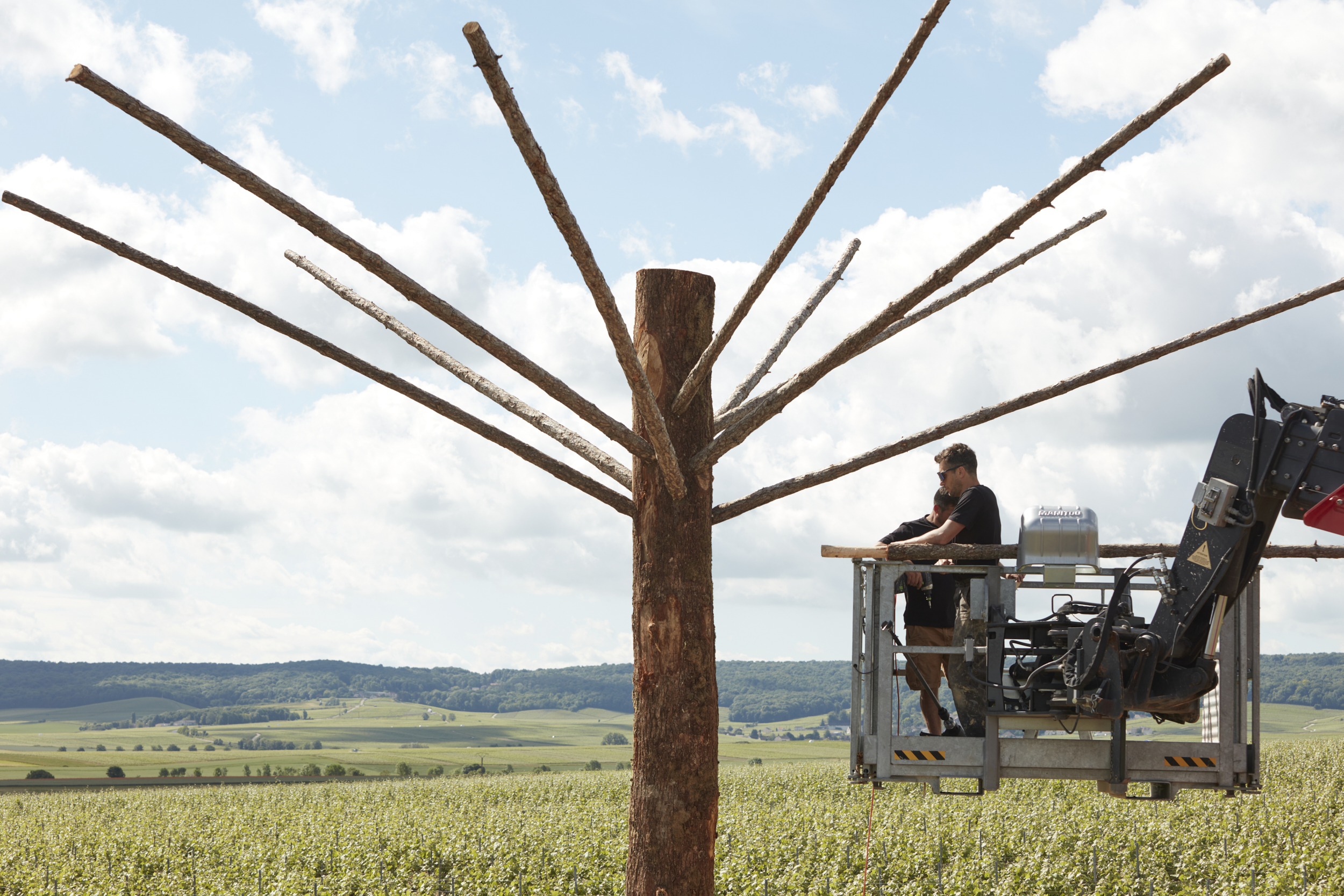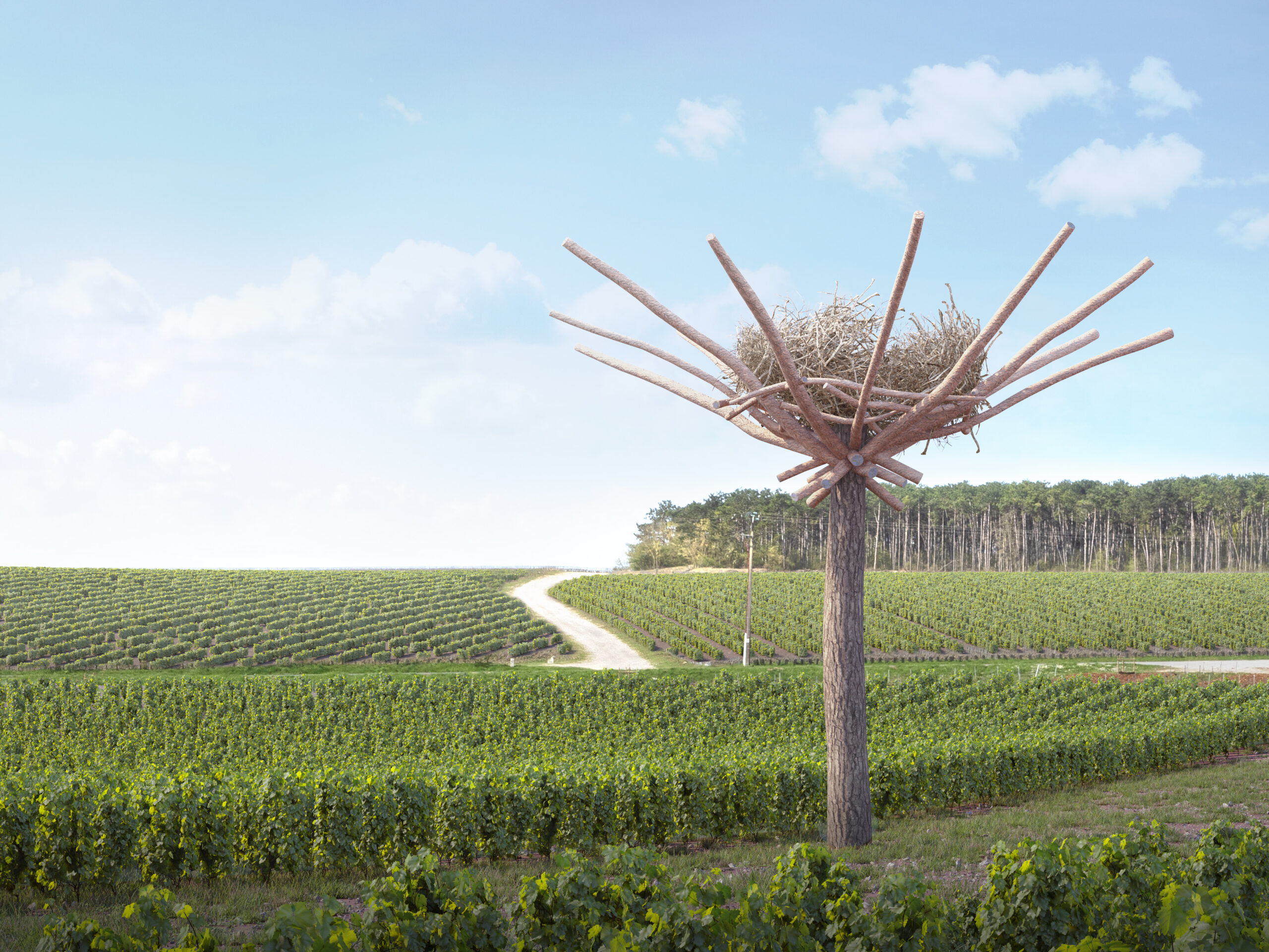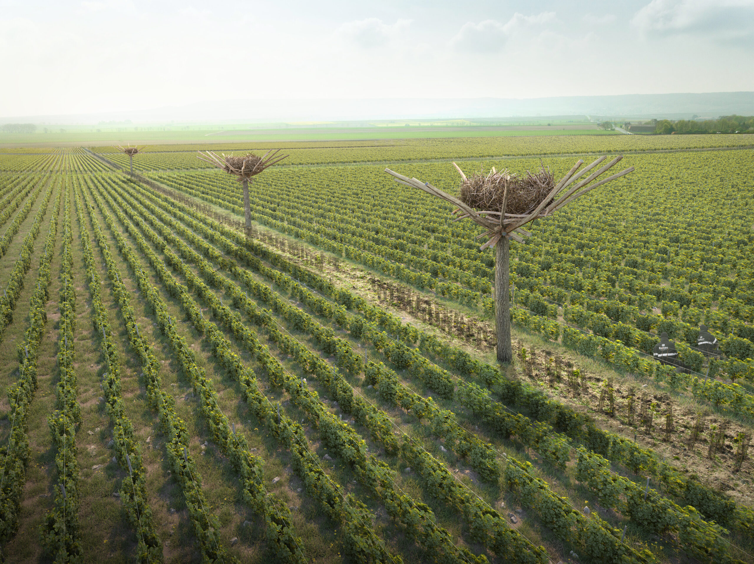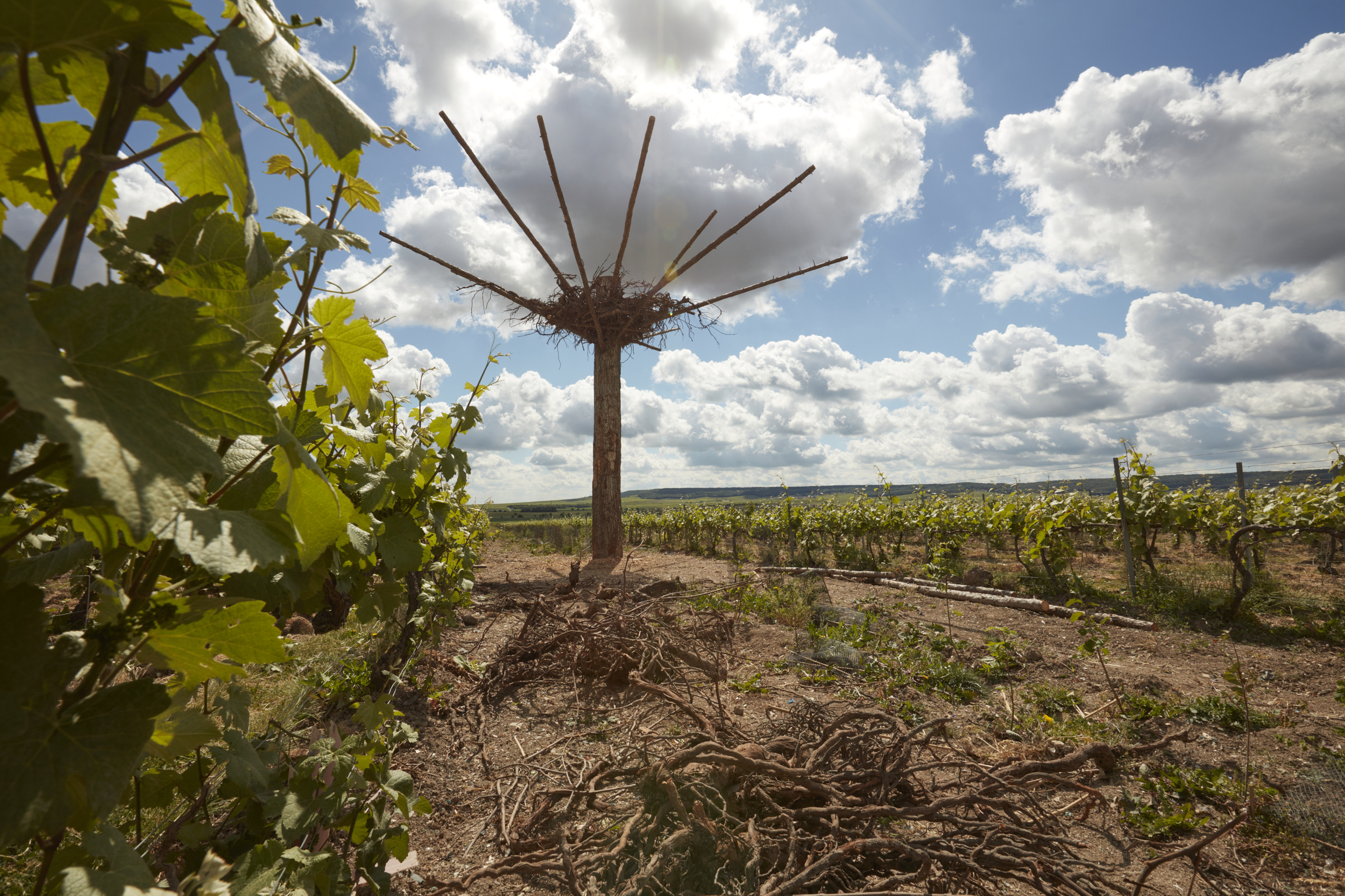 NILS-UDO a utilisé pour les construire les ceps et sarments retirés du vignoble par les équipes de la Maison Ruinart afin de fragmenter d’immenses parcelles pour leur redonner une taille bocagère et favoriser la biodiversité. Constitués d’un tronc en chêne et de pins en en guise de branches, ces HABITATS forment des nids et ne comportent aucun clou ni aucune fixation métallique.