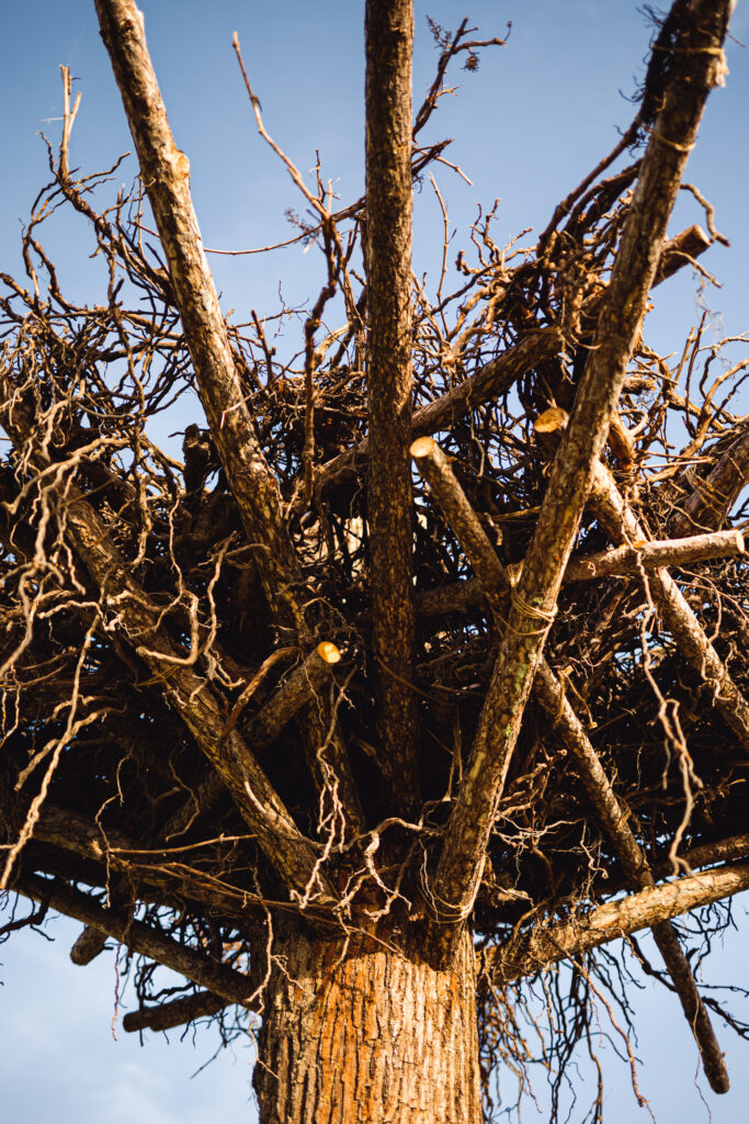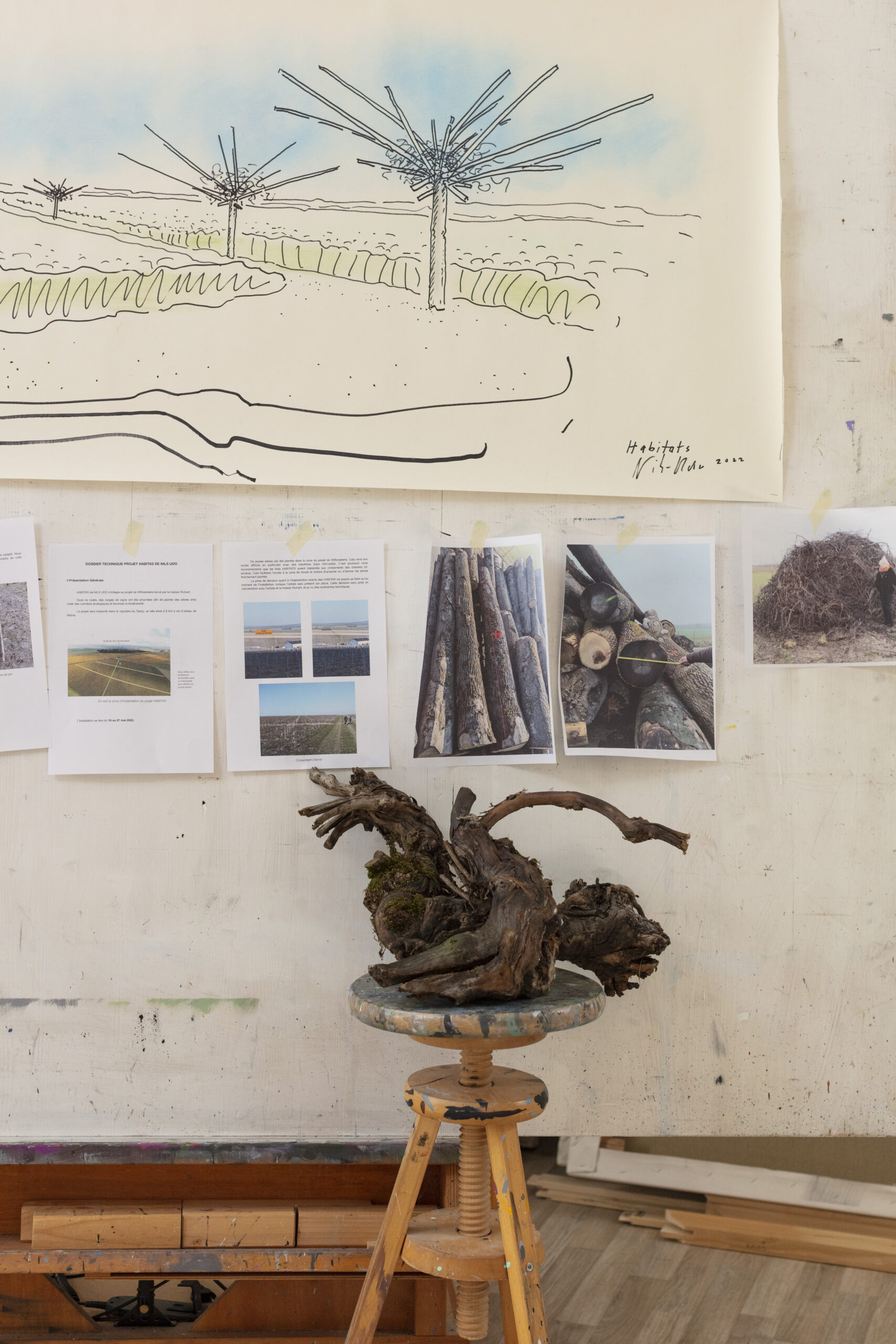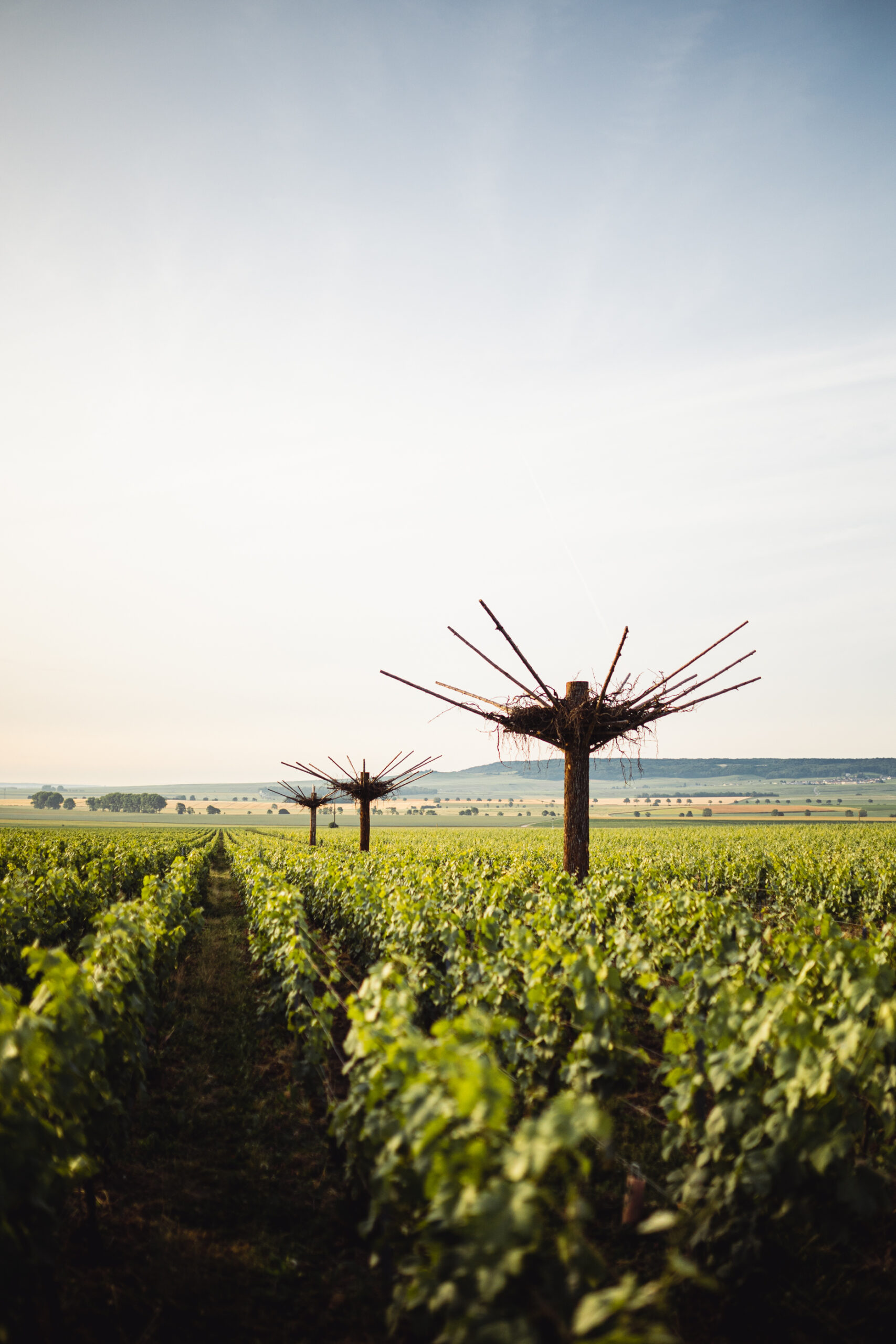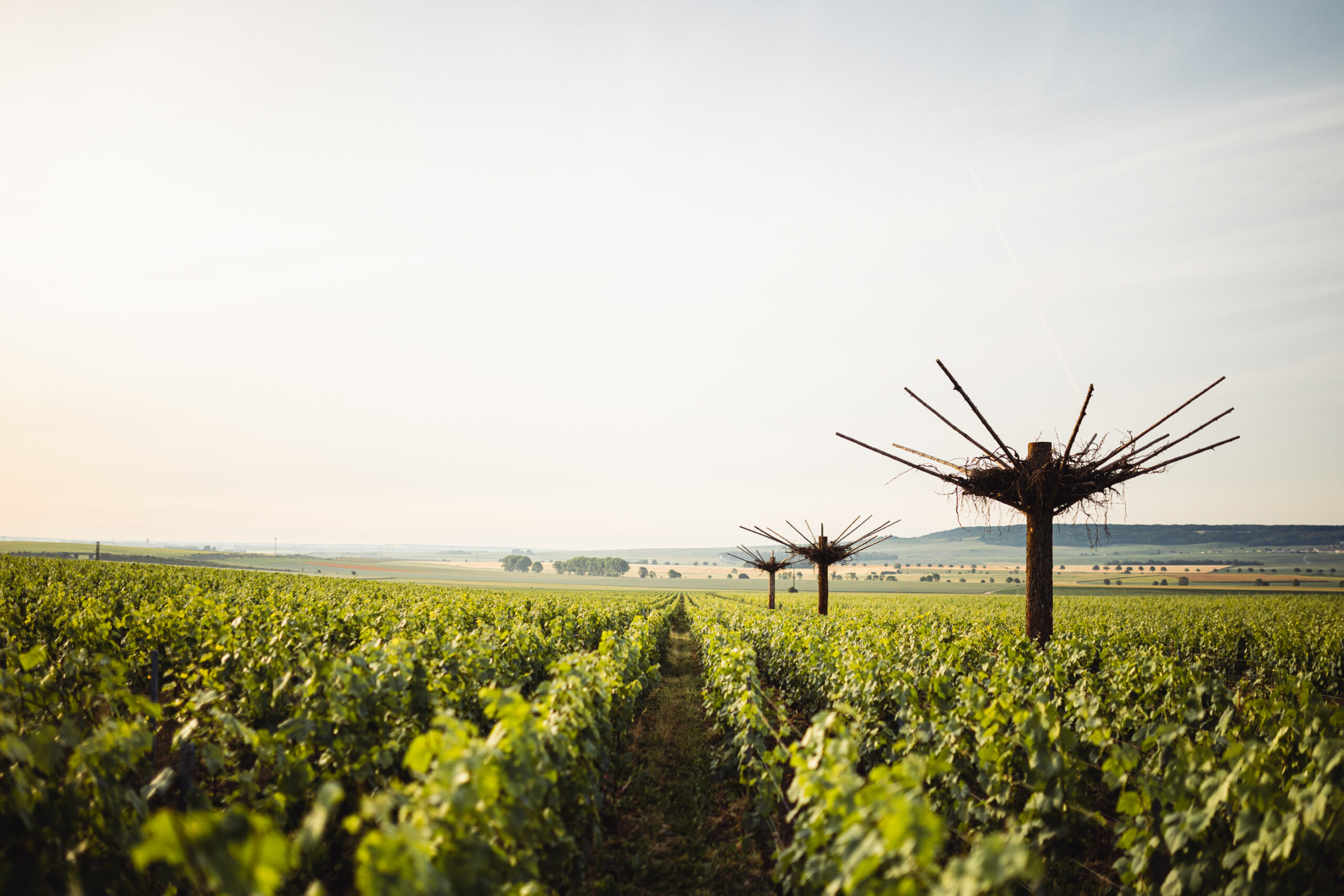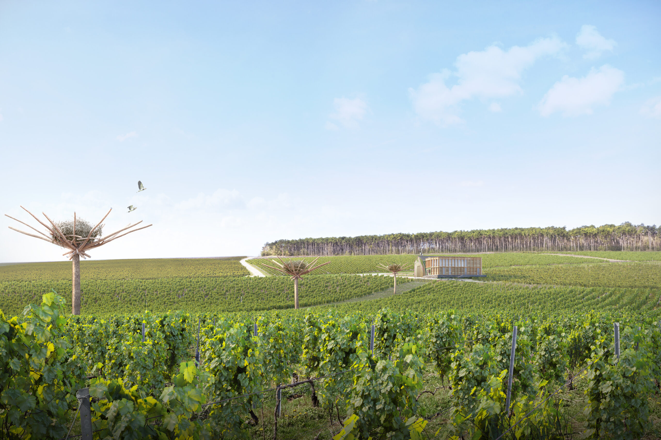NILS-UDO a utilisé pour les construire les ceps et sarments retirés du vignoble par les équipes de la Maison Ruinart afin de fragmenter d’immenses parcelles pour leur redonner une taille bocagère et favoriser la biodiversité. Constitués d’un tronc en chêne et de pins en en guise de branches, ces HABITATS forment des nids et ne comportent aucun clou ni aucune fixation métallique.
