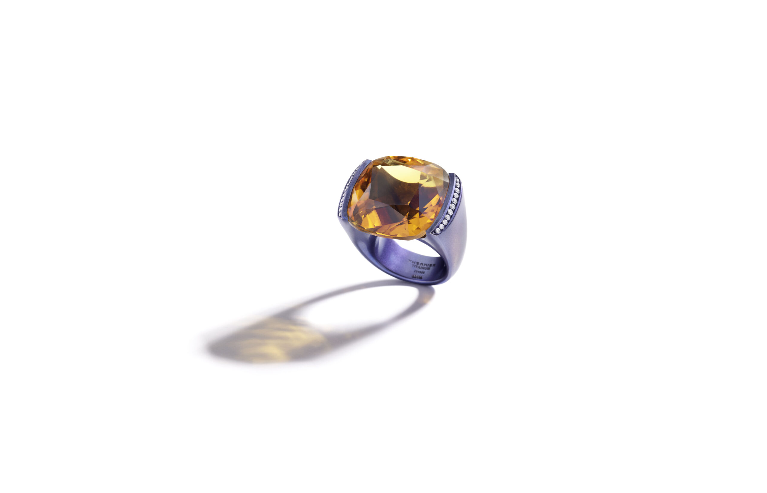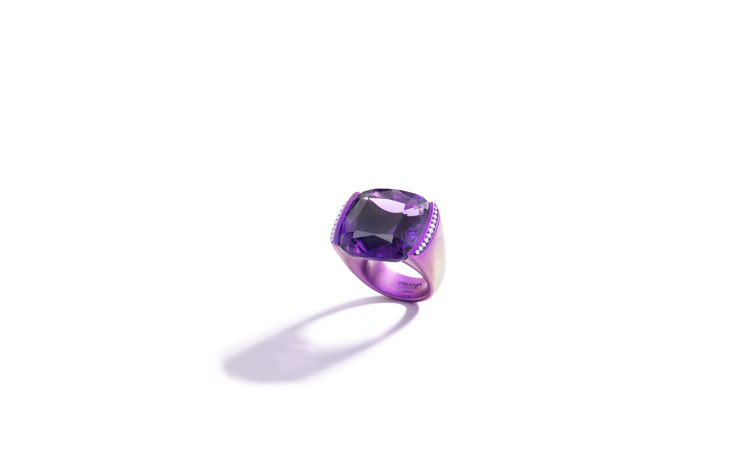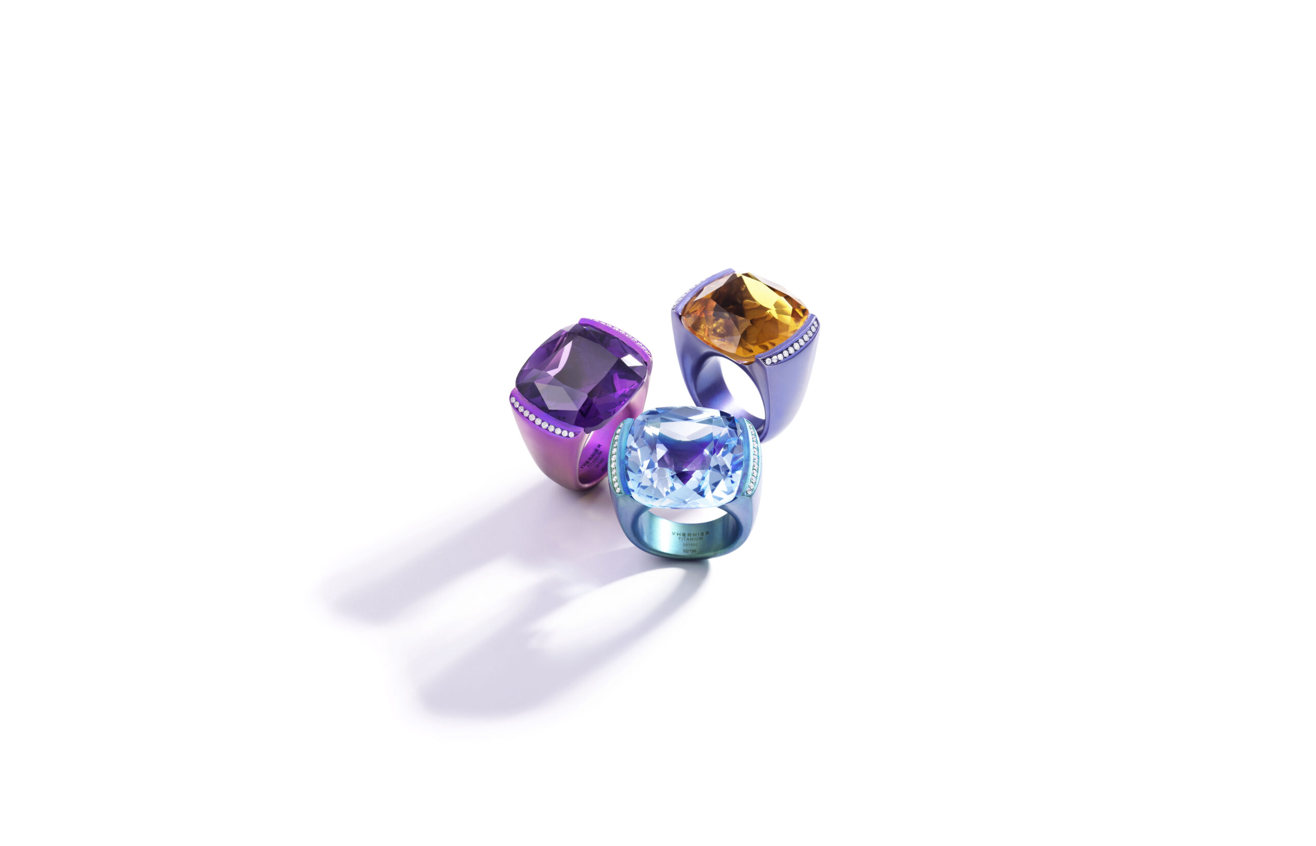 Rainbow est une collection capsule, éditée à 100 exemplaires uniquement, qui associe trois magnifiques pierres de gros volumes – améthyste, quartz citrine, topaze bleue – à du titane aux couleurs vives.