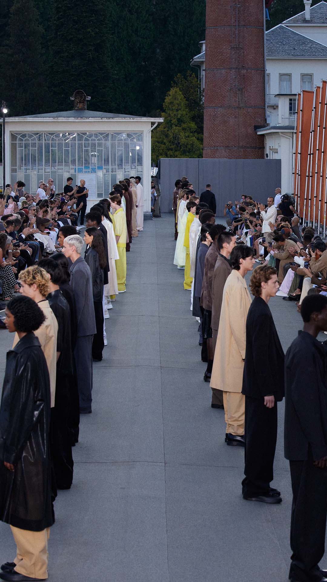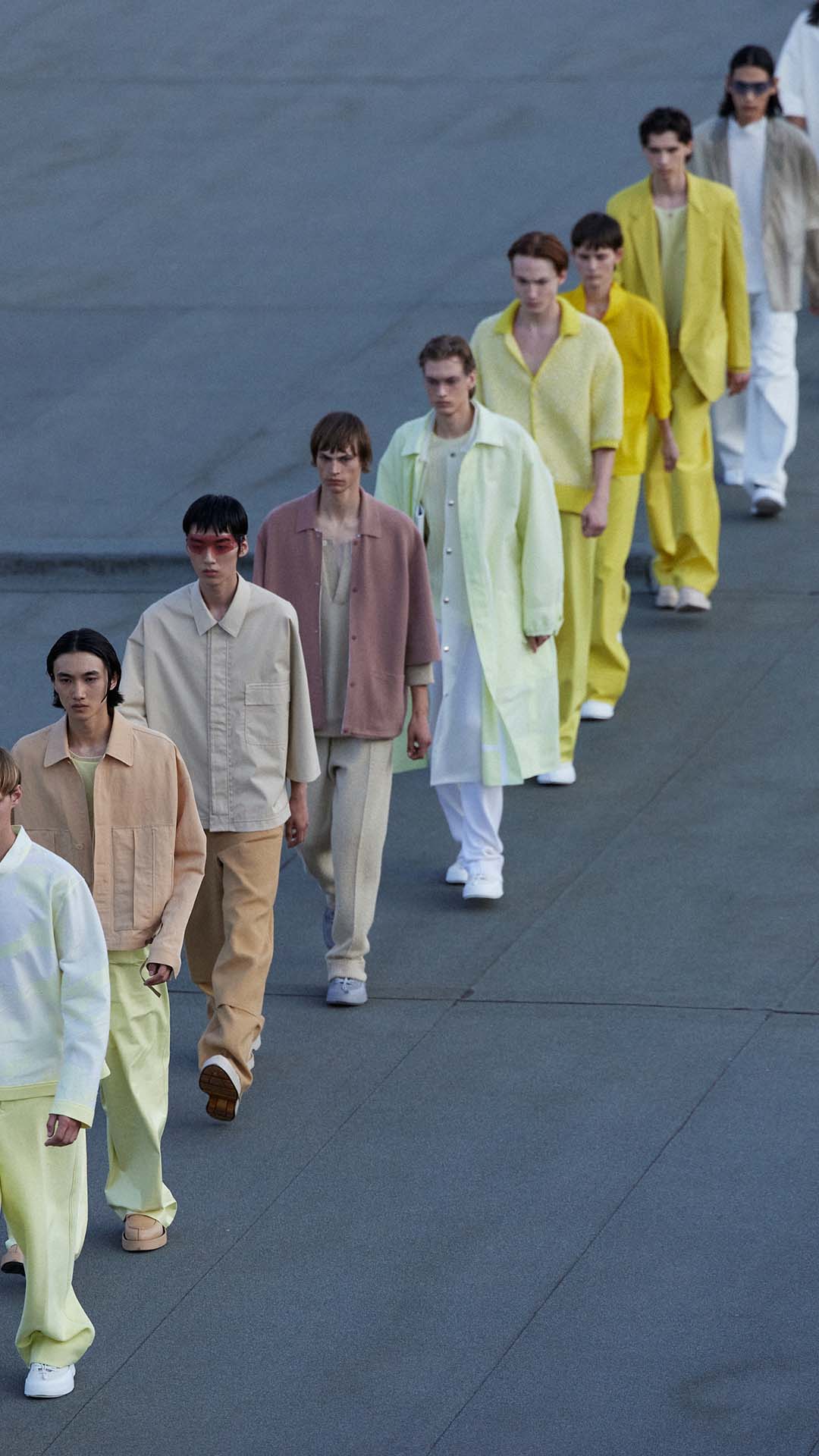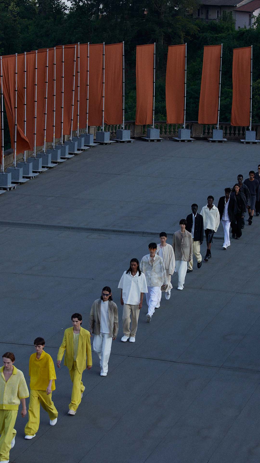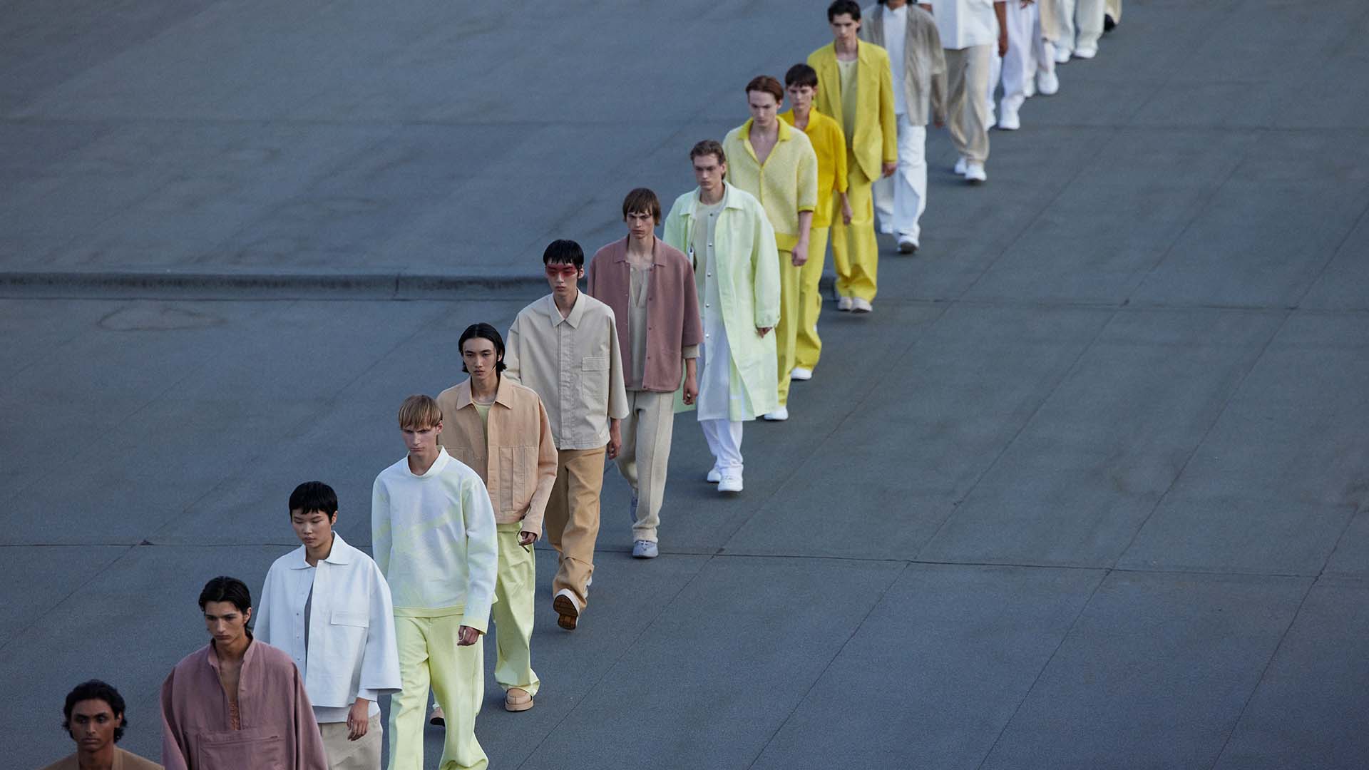 Le défilé printemps été 2023 de Zegna a été présenté sur le toit de la filature de laine historique Lanificio Zegna, et diffusé simultanément dans le monde entier, offrant au public un accès sans précédent au défilé grâce à plusieurs caméras permettant différentes vues autour de l’Oasi.