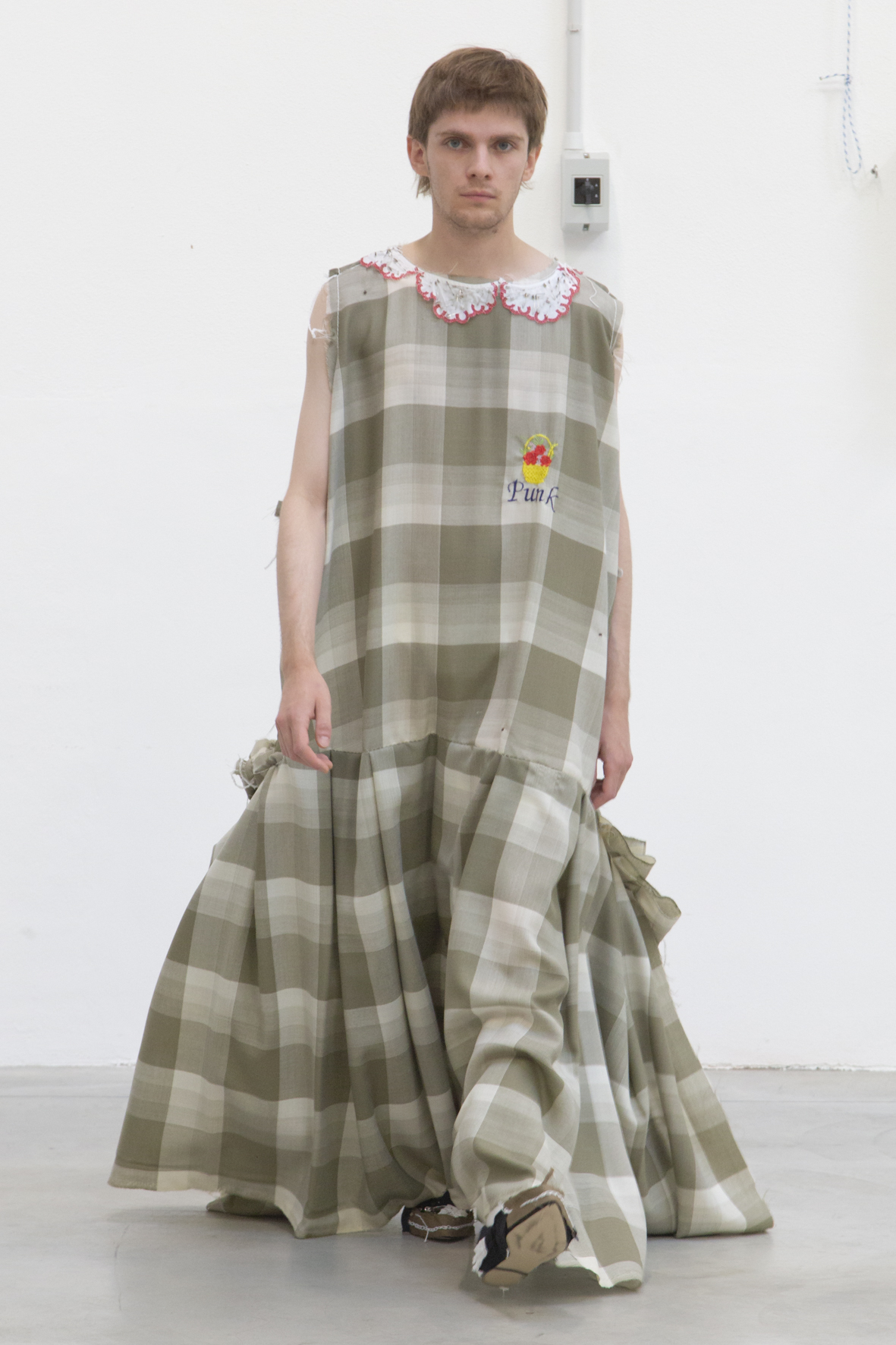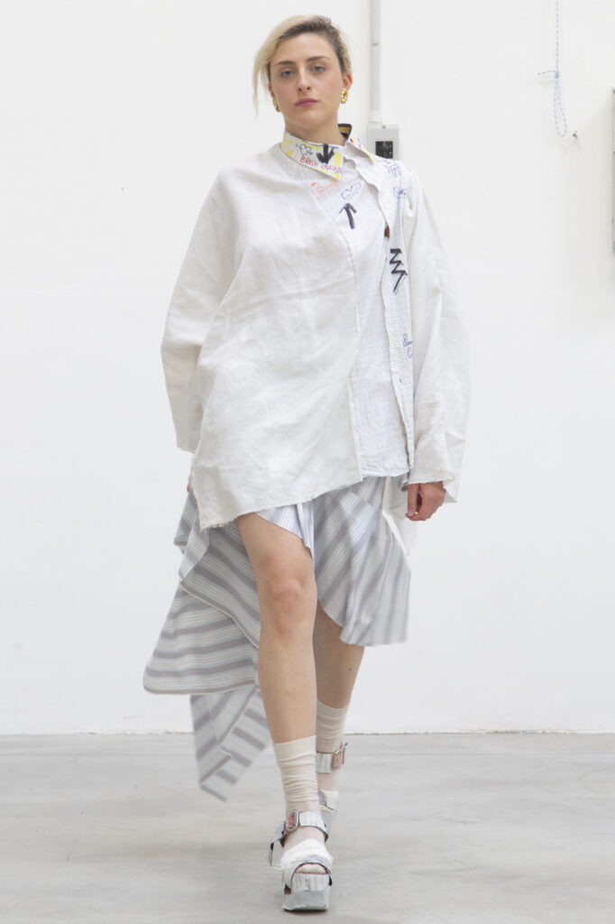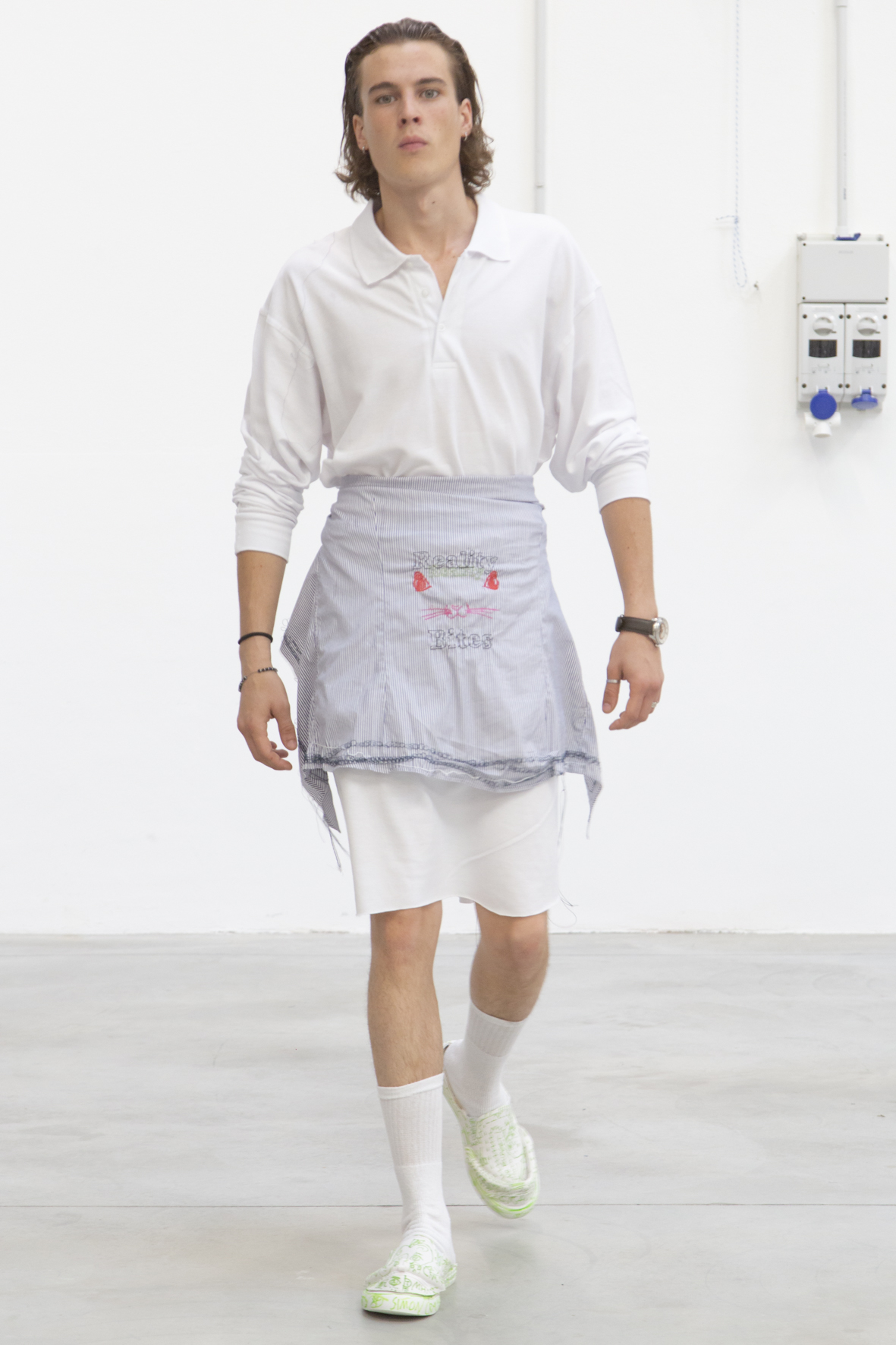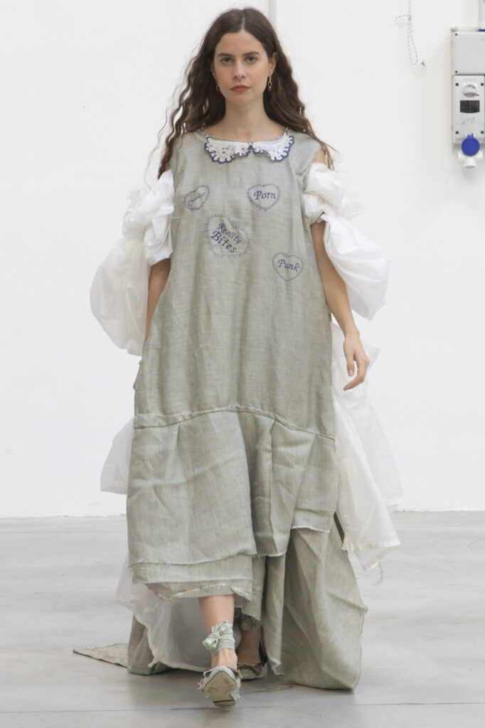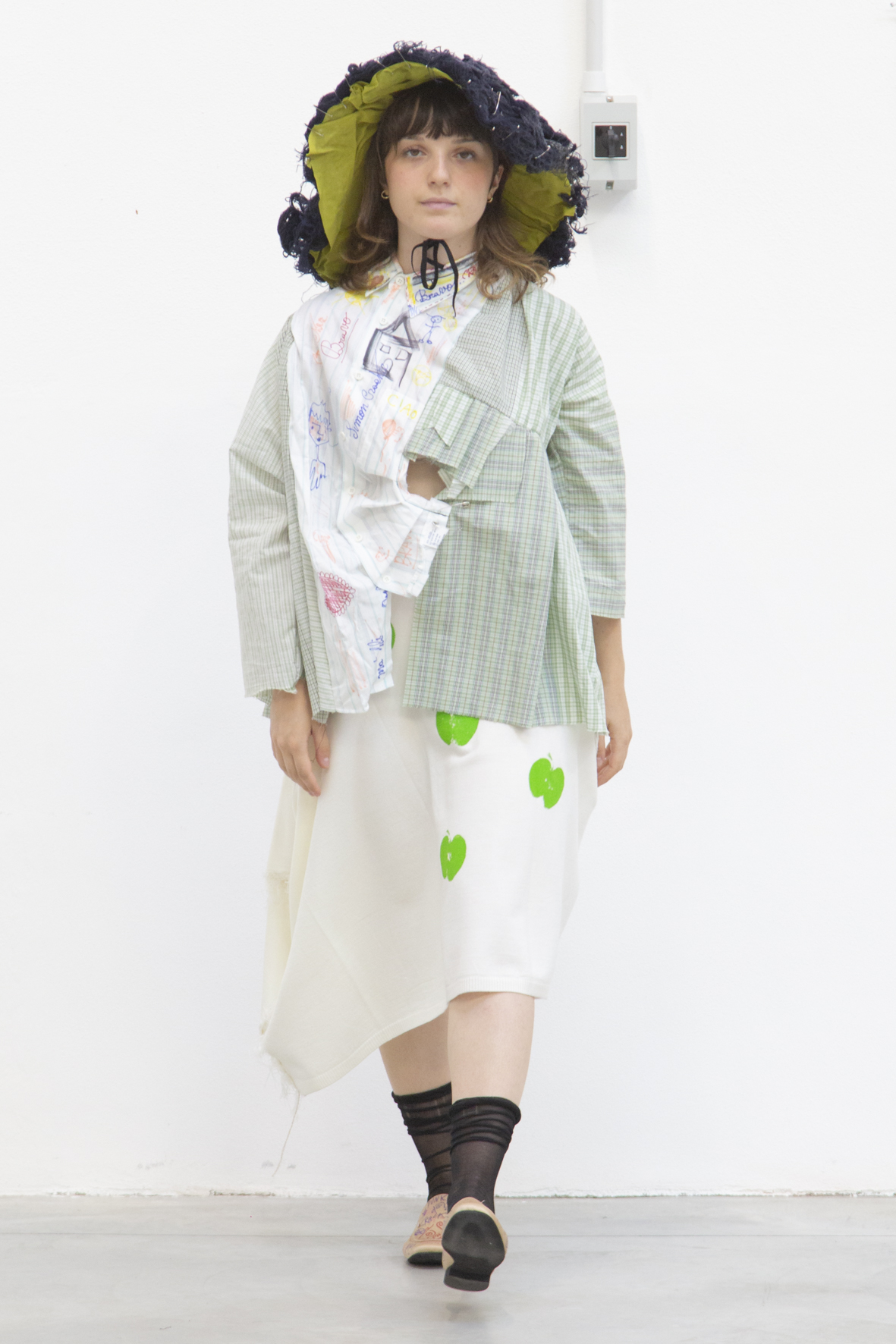 Reality bites is a movie from the 90’s. We live in an age where the bites of reality afflict the entire planet and we decided to talk about it in our own way. The collection does not really have much to do with the movie, aside a couple of 90’s inspired looks, but it reflects our path and experiences in creating this collection: the difficulties of being an ‘independent ’brand in today’s fashion world, dominated by cynicism and marketing strategies, so far away from what happens in the streets. We deepened our “punkindness” concept (kind punk which is more effective than violent punk) by mixing a raw aesthetic made of industrial sewings, safety pins, unfinished hems and graffiti with a more gentle and naive one made by embroidery, ruffles, hand written fabrics that look like children notebooks, hand printed apples made with a real apple and a color that smells like the fruit itself. The final result is what’s between the Sex Pistols and Holly Hobbies. Aside from the ‘bites’, realness is the other key word. Everything in the collection is ‘real’, starting from the deadstock upcyled garments and leftover fabrics to the choice of the models, all friends and fans of the brand that complete the styling with the accessories that they use every day to define their true identity. Our story talks about difficulties and enthusiasm: a challenge to do the best with what we have. It’s when you have scarce means that creativity gains a main role. MATERIALS Old cotton and linen bedsheets Upcycled classical men’s shirts turned into notebooks garments Old parachutes Knitwear made with discarded wool, cotton and silk yarns Recycled jersey garments decorated with an industrial sewing machine Wrong embroideries with the collection messages Broken and rebuilt up cycled tailoring