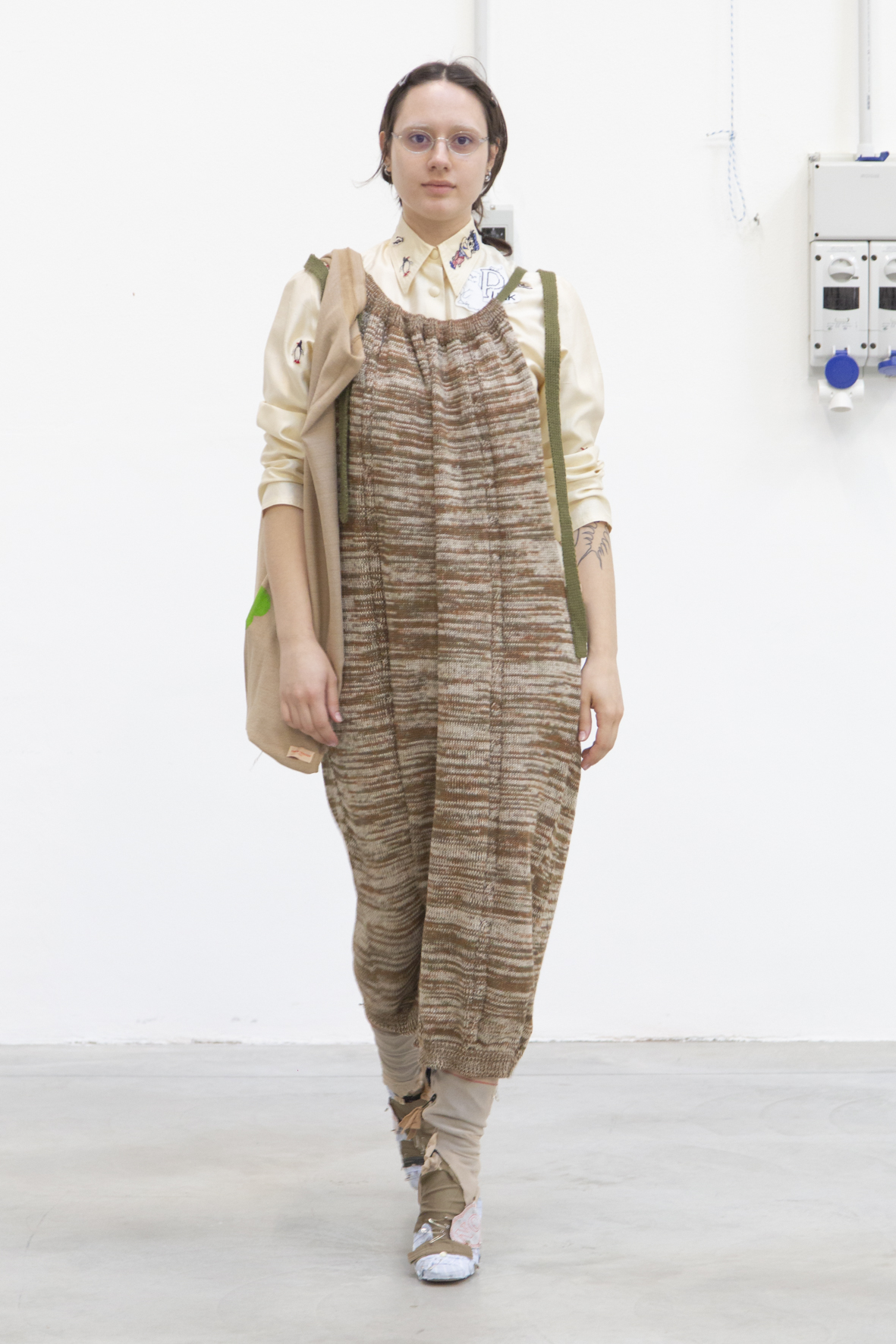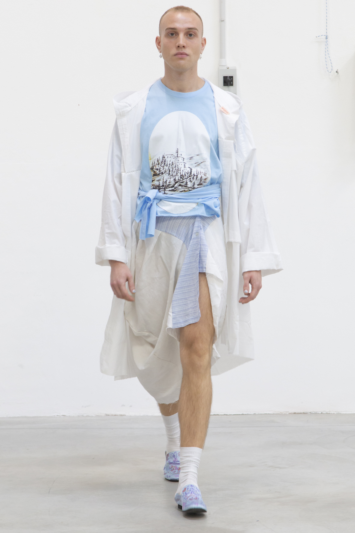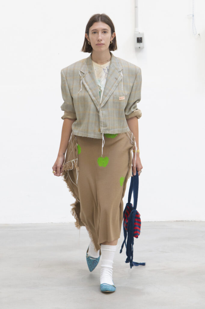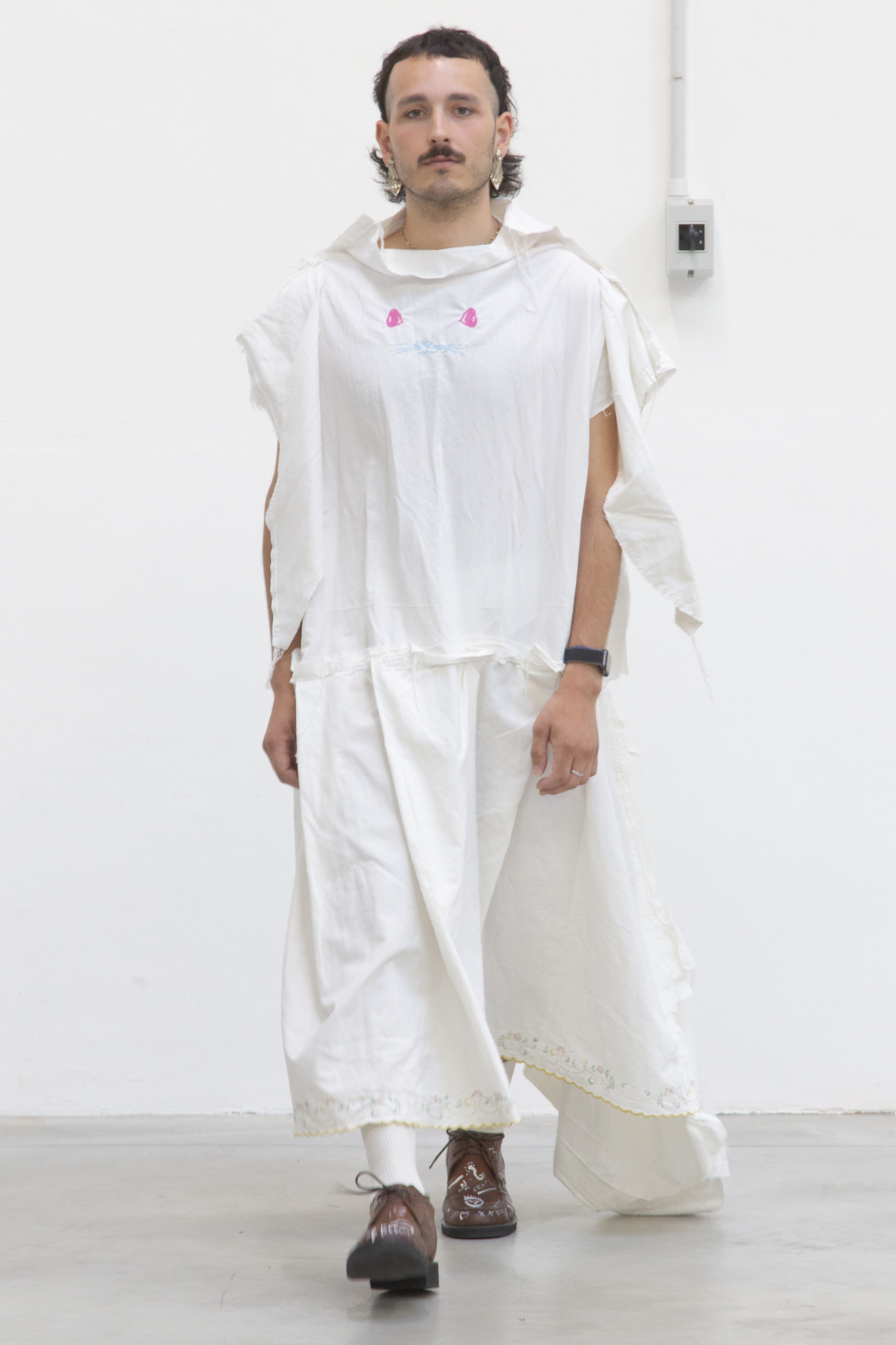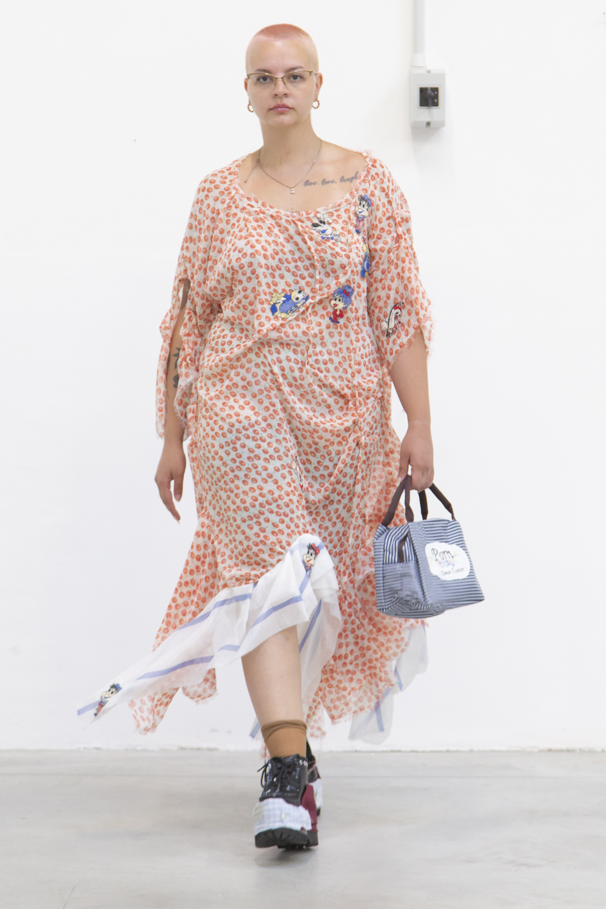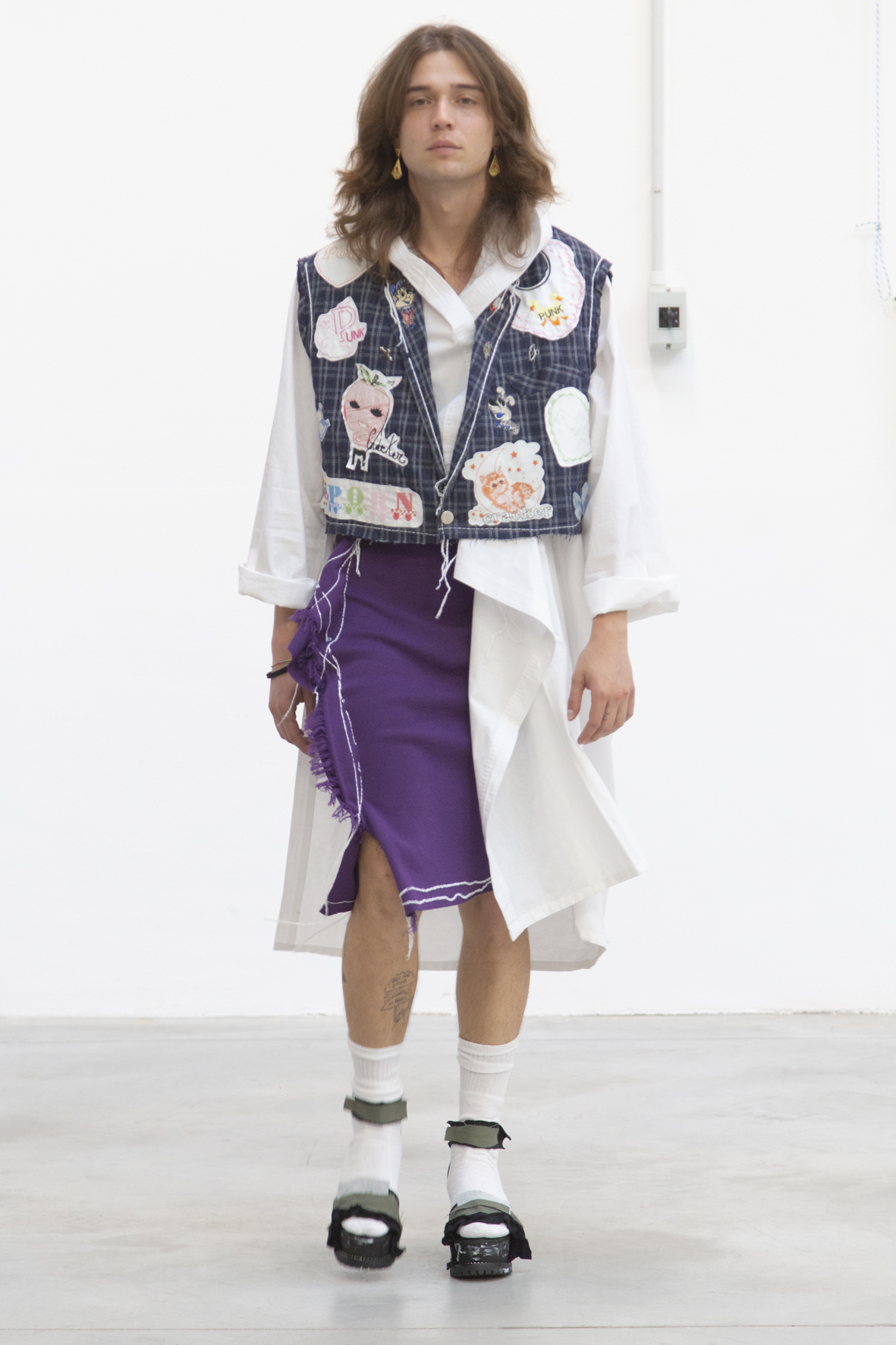 Reality bites is a movie from the 90’s. We live in an age where the bites of reality afflict the entire planet and we decided to talk about it in our own way. The collection does not really have much to do with the movie, aside a couple of 90’s inspired looks, but it reflects our path and experiences in creating this collection: the difficulties of being an ‘independent ’brand in today’s fashion world, dominated by cynicism and marketing strategies, so far away from what happens in the streets. We deepened our “punkindness” concept (kind punk which is more effective than violent punk) by mixing a raw aesthetic made of industrial sewings, safety pins, unfinished hems and graffiti with a more gentle and naive one made by embroidery, ruffles, hand written fabrics that look like children notebooks, hand printed apples made with a real apple and a color that smells like the fruit itself. The final result is what’s between the Sex Pistols and Holly Hobbies. Aside from the ‘bites’, realness is the other key word. Everything in the collection is ‘real’, starting from the deadstock upcyled garments and leftover fabrics to the choice of the models, all friends and fans of the brand that complete the styling with the accessories that they use every day to define their true identity. Our story talks about difficulties and enthusiasm: a challenge to do the best with what we have. It’s when you have scarce means that creativity gains a main role. MATERIALS Old cotton and linen bedsheets Upcycled classical men’s shirts turned into notebooks garments Old parachutes Knitwear made with discarded wool, cotton and silk yarns Recycled jersey garments decorated with an industrial sewing machine Wrong embroideries with the collection messages Broken and rebuilt up cycled tailoring