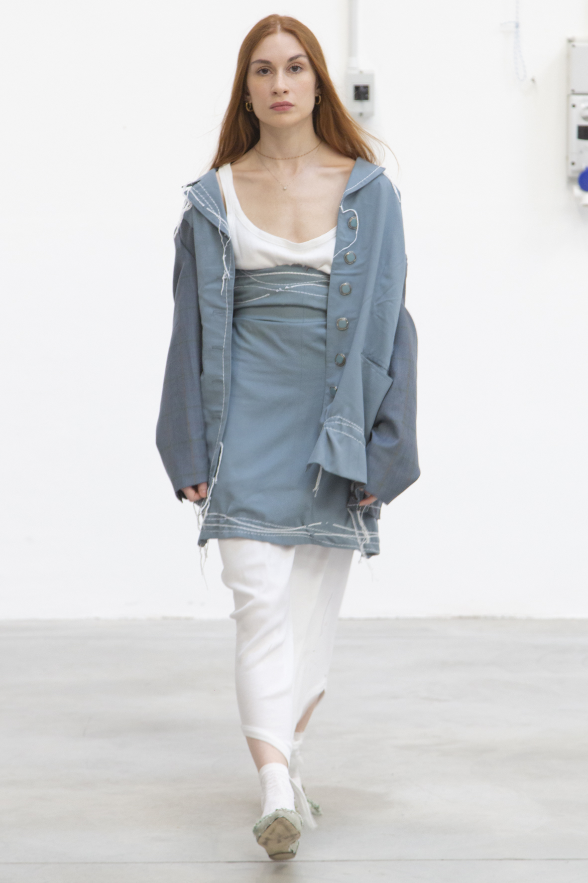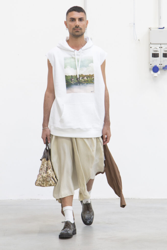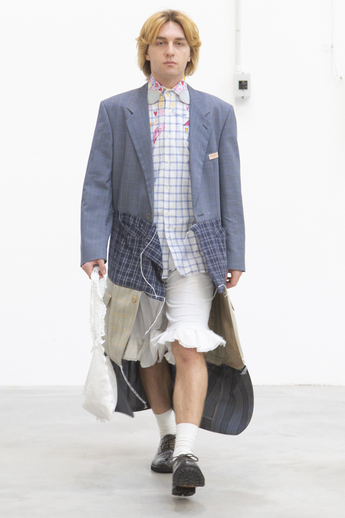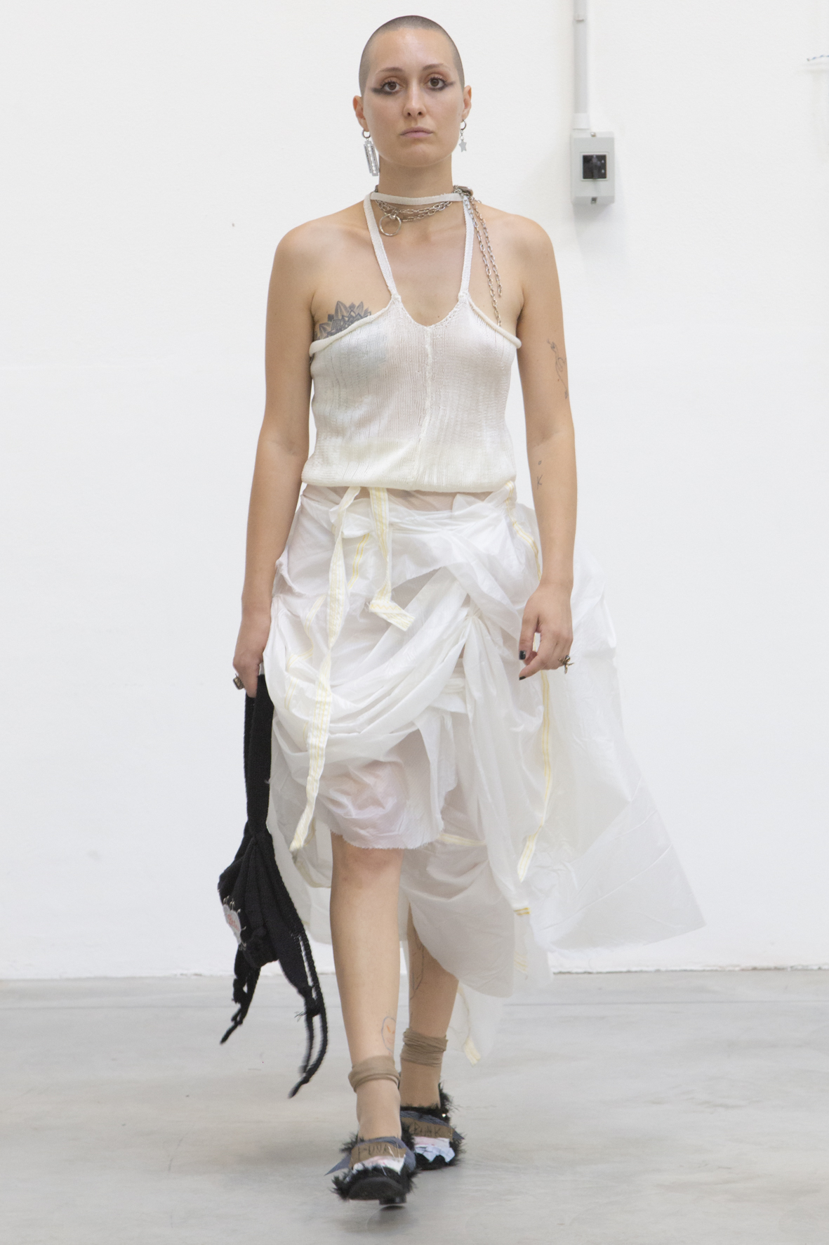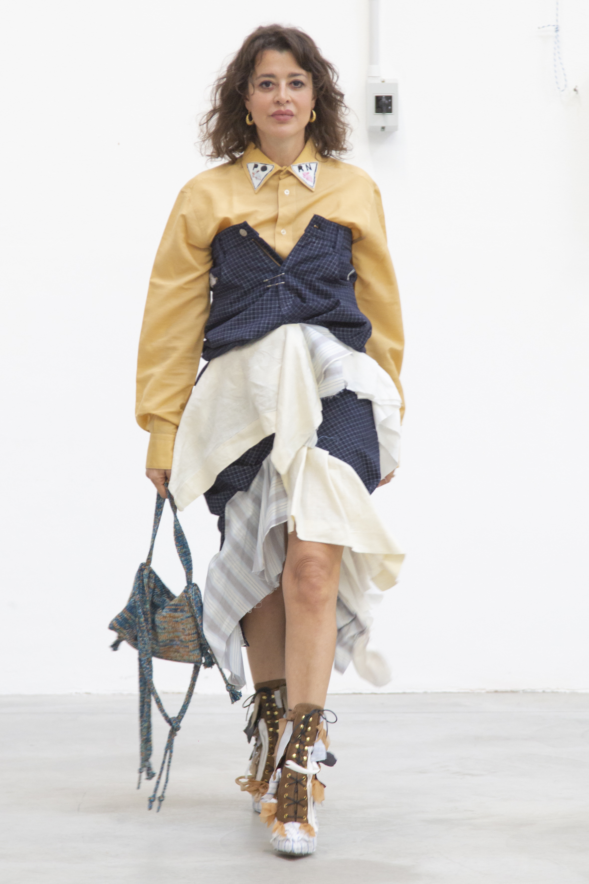 Reality bites is a movie from the 90’s. We live in an age where the bites of reality afflict the entire planet and we decided to talk about it in our own way. The collection does not really have much to do with the movie, aside a couple of 90’s inspired looks, but it reflects our path and experiences in creating this collection: the difficulties of being an ‘independent ’brand in today’s fashion world, dominated by cynicism and marketing strategies, so far away from what happens in the streets. We deepened our “punkindness” concept (kind punk which is more effective than violent punk) by mixing a raw aesthetic made of industrial sewings, safety pins, unfinished hems and graffiti with a more gentle and naive one made by embroidery, ruffles, hand written fabrics that look like children notebooks, hand printed apples made with a real apple and a color that smells like the fruit itself. The final result is what’s between the Sex Pistols and Holly Hobbies. Aside from the ‘bites’, realness is the other key word. Everything in the collection is ‘real’, starting from the deadstock upcyled garments and leftover fabrics to the choice of the models, all friends and fans of the brand that complete the styling with the accessories that they use every day to define their true identity. Our story talks about difficulties and enthusiasm: a challenge to do the best with what we have. It’s when you have scarce means that creativity gains a main role. MATERIALS Old cotton and linen bedsheets Upcycled classical men’s shirts turned into notebooks garments Old parachutes Knitwear made with discarded wool, cotton and silk yarns Recycled jersey garments decorated with an industrial sewing machine Wrong embroideries with the collection messages Broken and rebuilt up cycled tailoring
